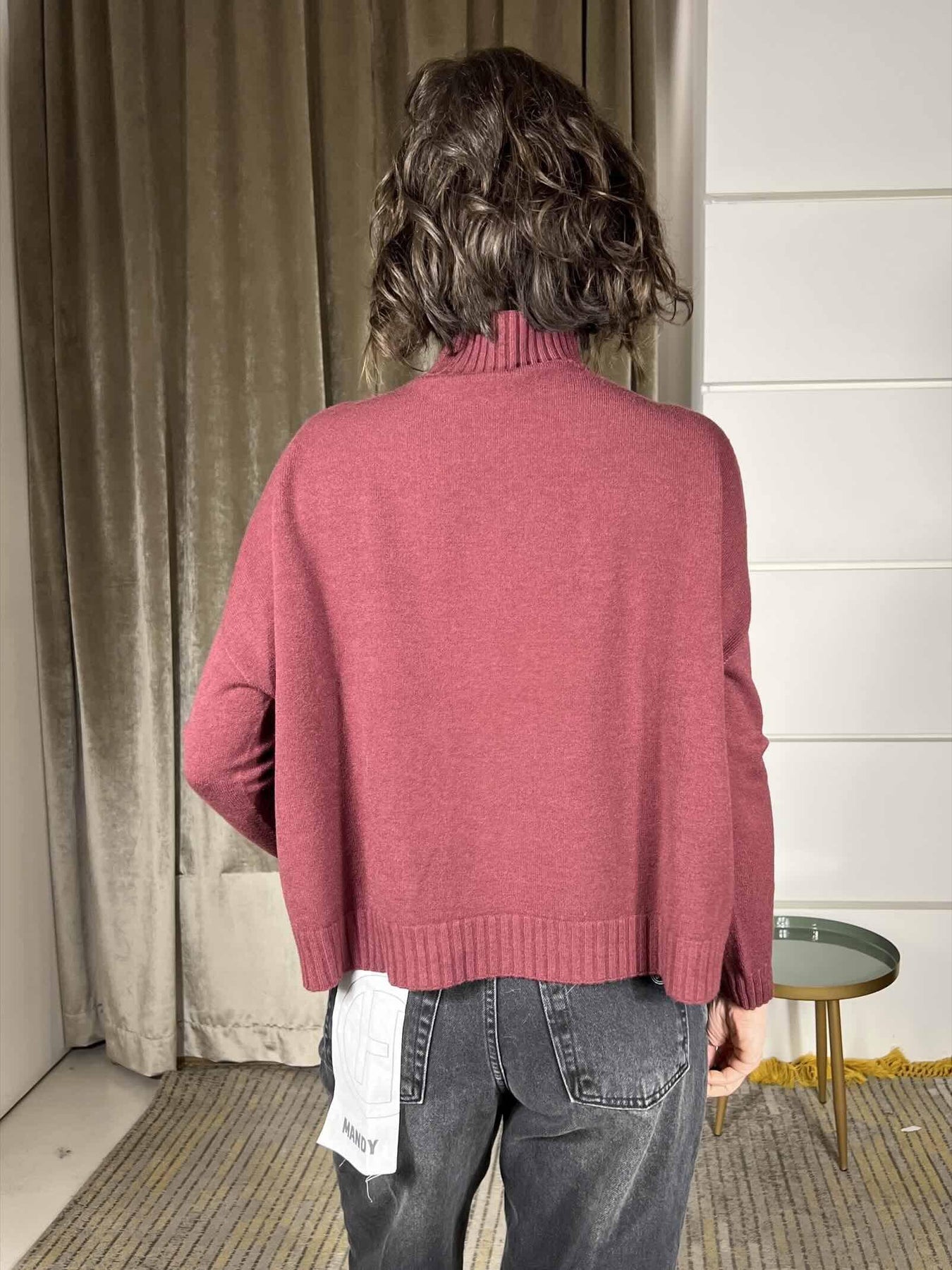 maglia Susys Mix collo alto in calda viscosa, bordeaux, la modella è una 40 ed è alta 172cm, veste da una 38 a una 46. Composizione 50%vi 27%pl 23%pa