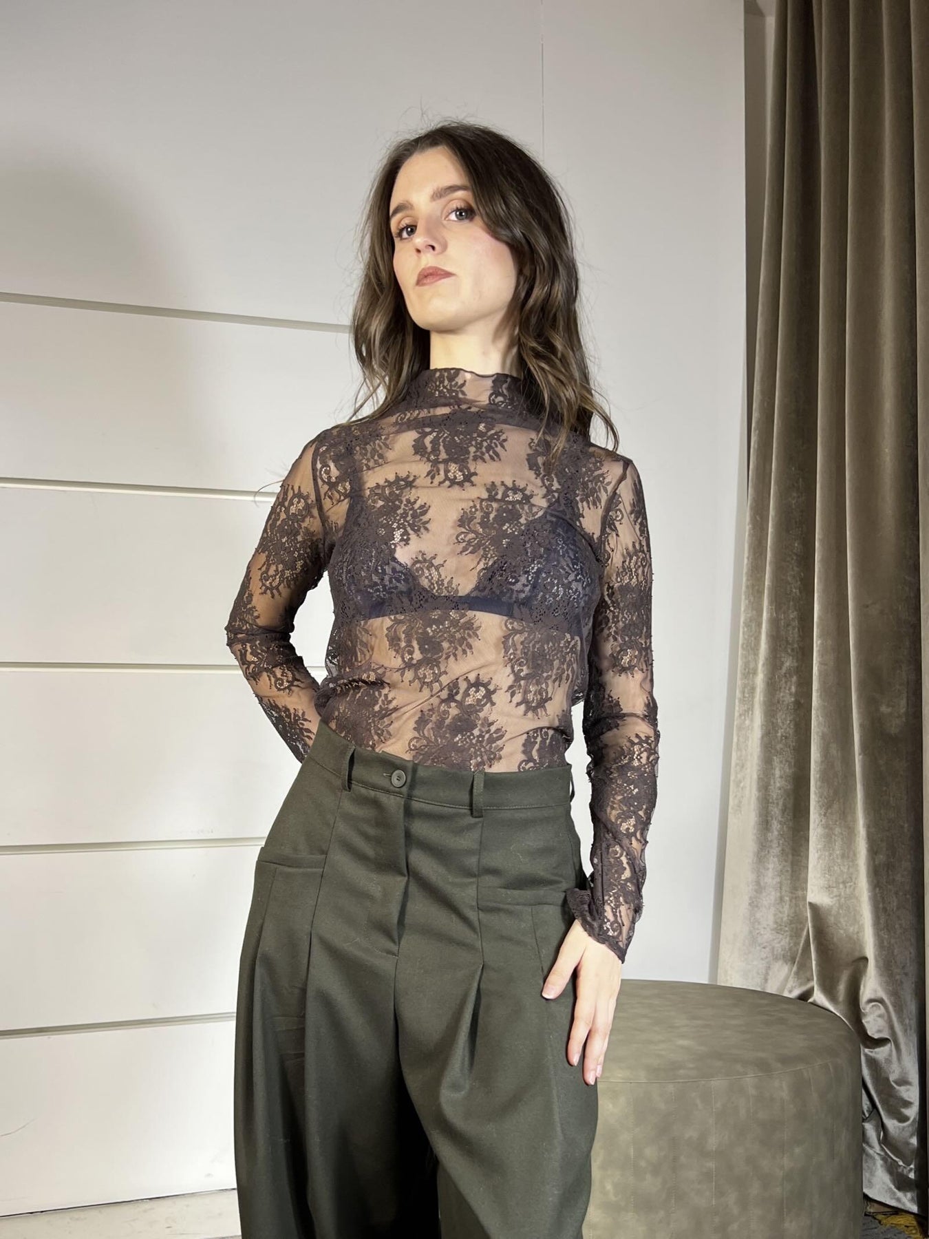 maglia HaveOne moro in pizzo con colletto, la modella è una 40 ed è alta 165cm. Composizione 89%pa 11%ea
