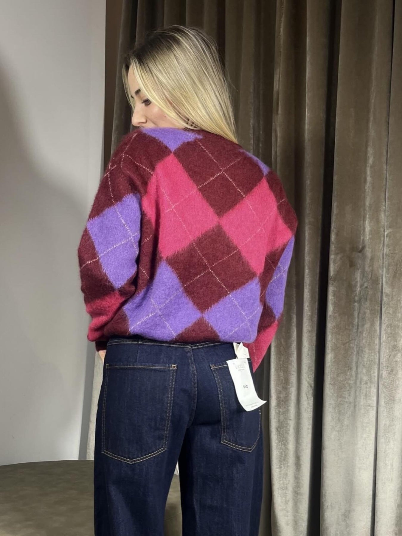 Maglione Philia Loft girocollo con rombi viola e fucsia, la modella è alta 165cm ed è una 40, veste da una 38 a una 44. Composizione 52%vi 26%pbt 22%ny 40%pc30%wm30%pa+70%vi15%pl15%pa