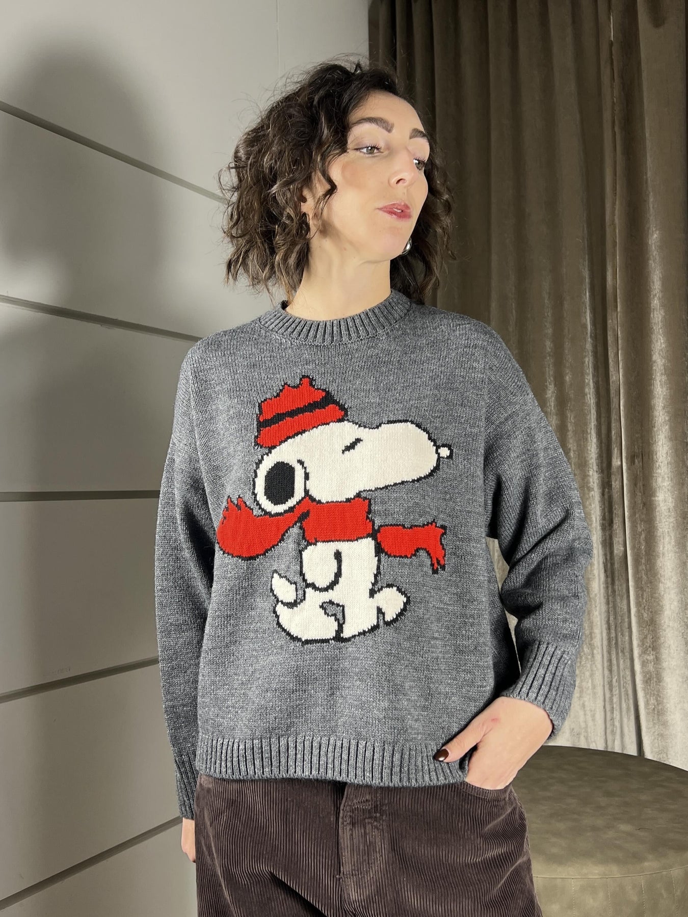 maglione Tensione In charcoal girocollo con disegno in misto lana rust, la modella è una 40 ed è alta 172cm