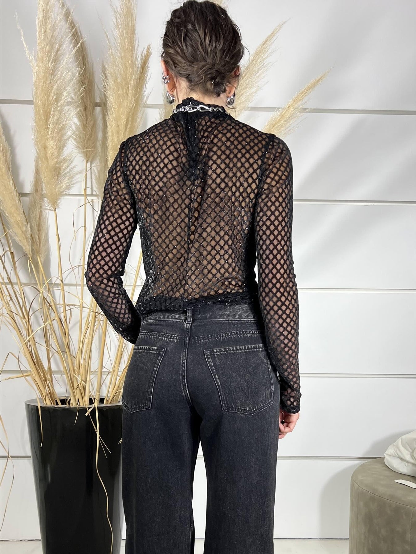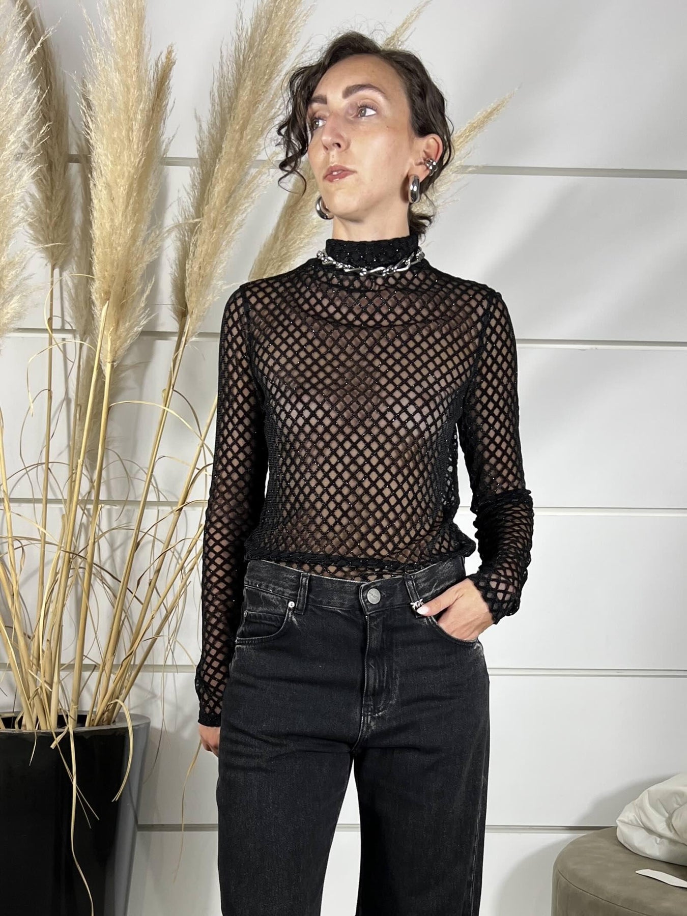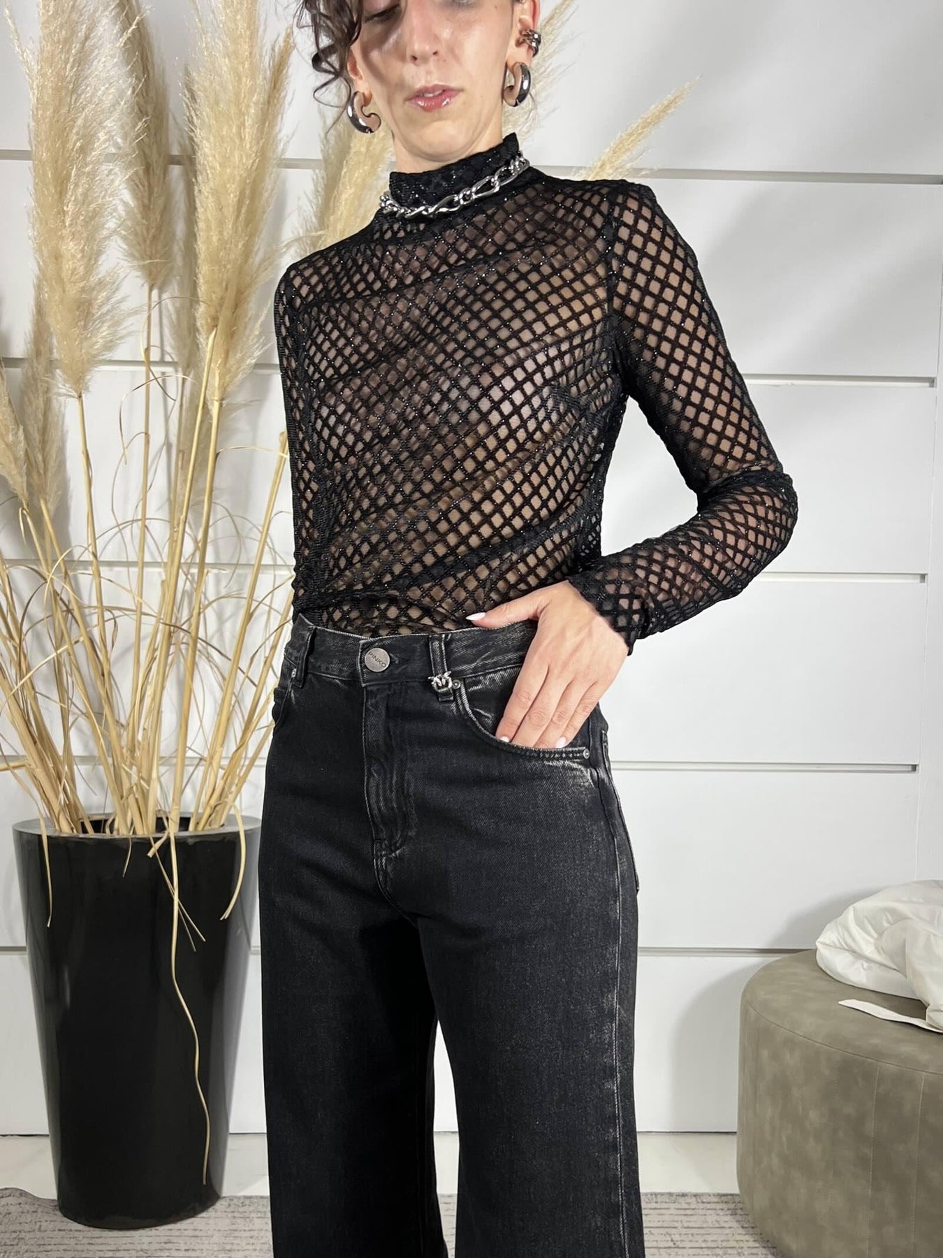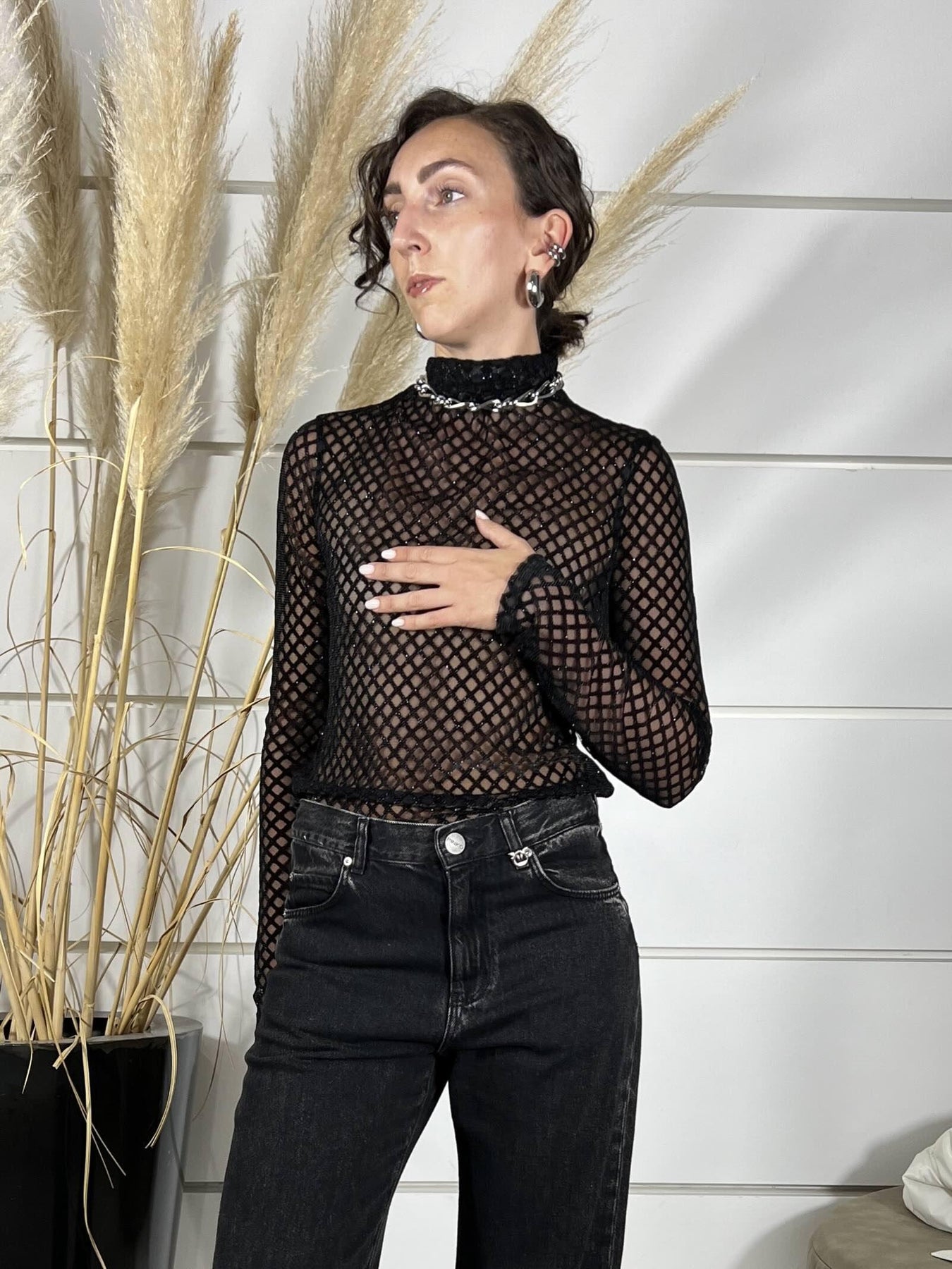 Maglia Patrizia Pepe black net, modello manica lunga a lupetto, trasparente ed elasticizzata, filo lurex, lavorazione a rombi. La modella indossa la 40 ed è alta 172cm. Composizione 86%pl 12%pa 2%ea