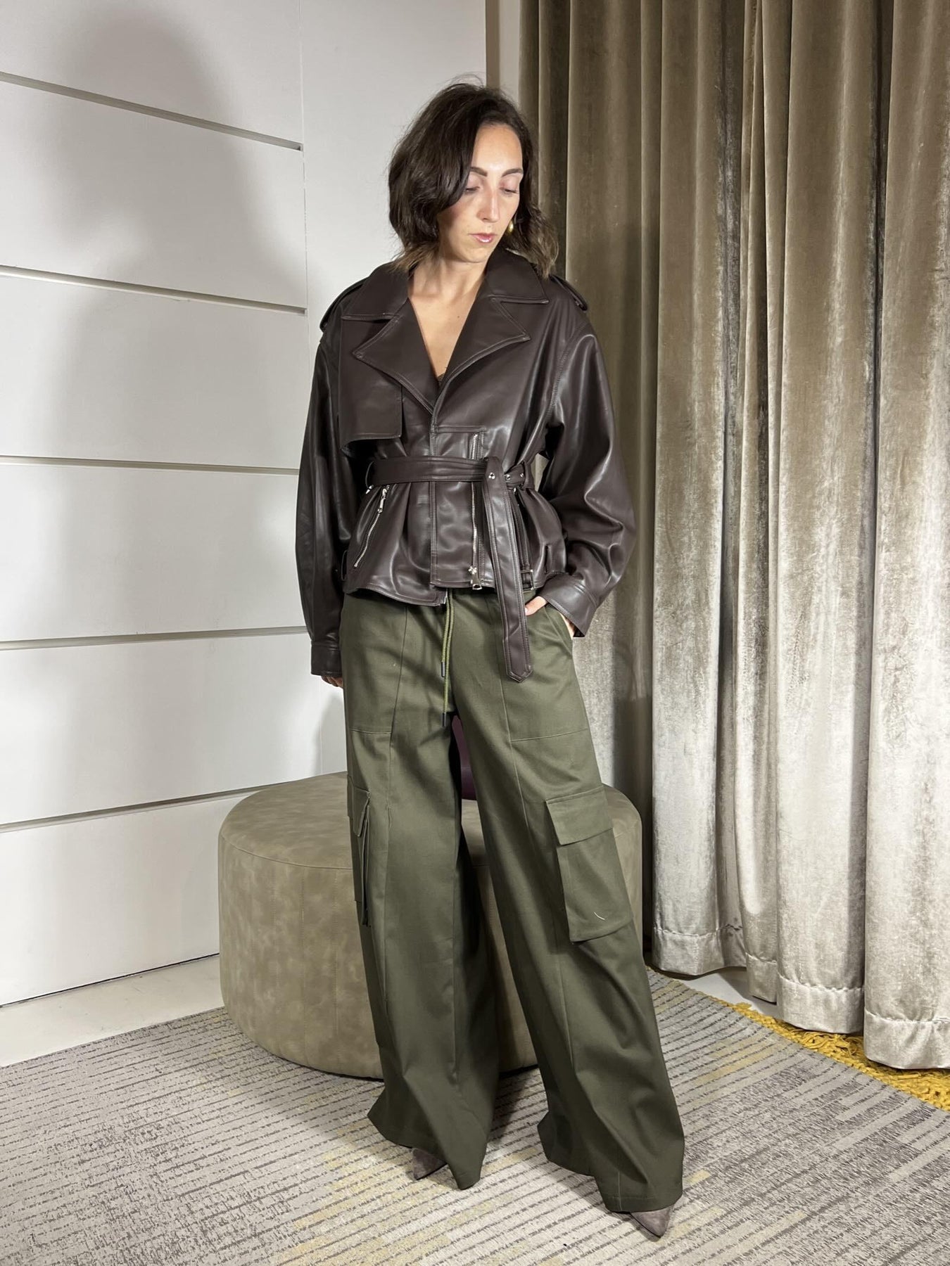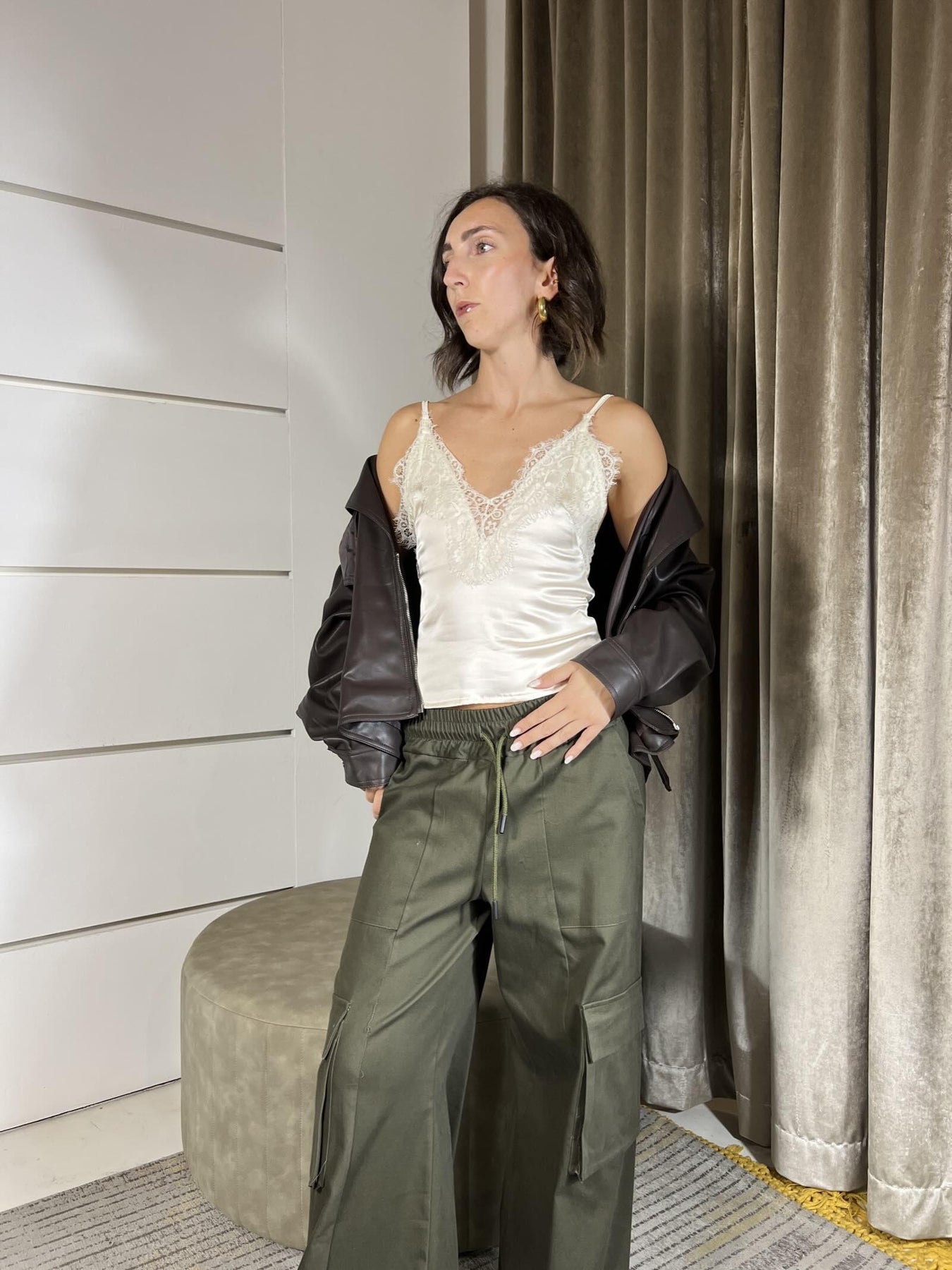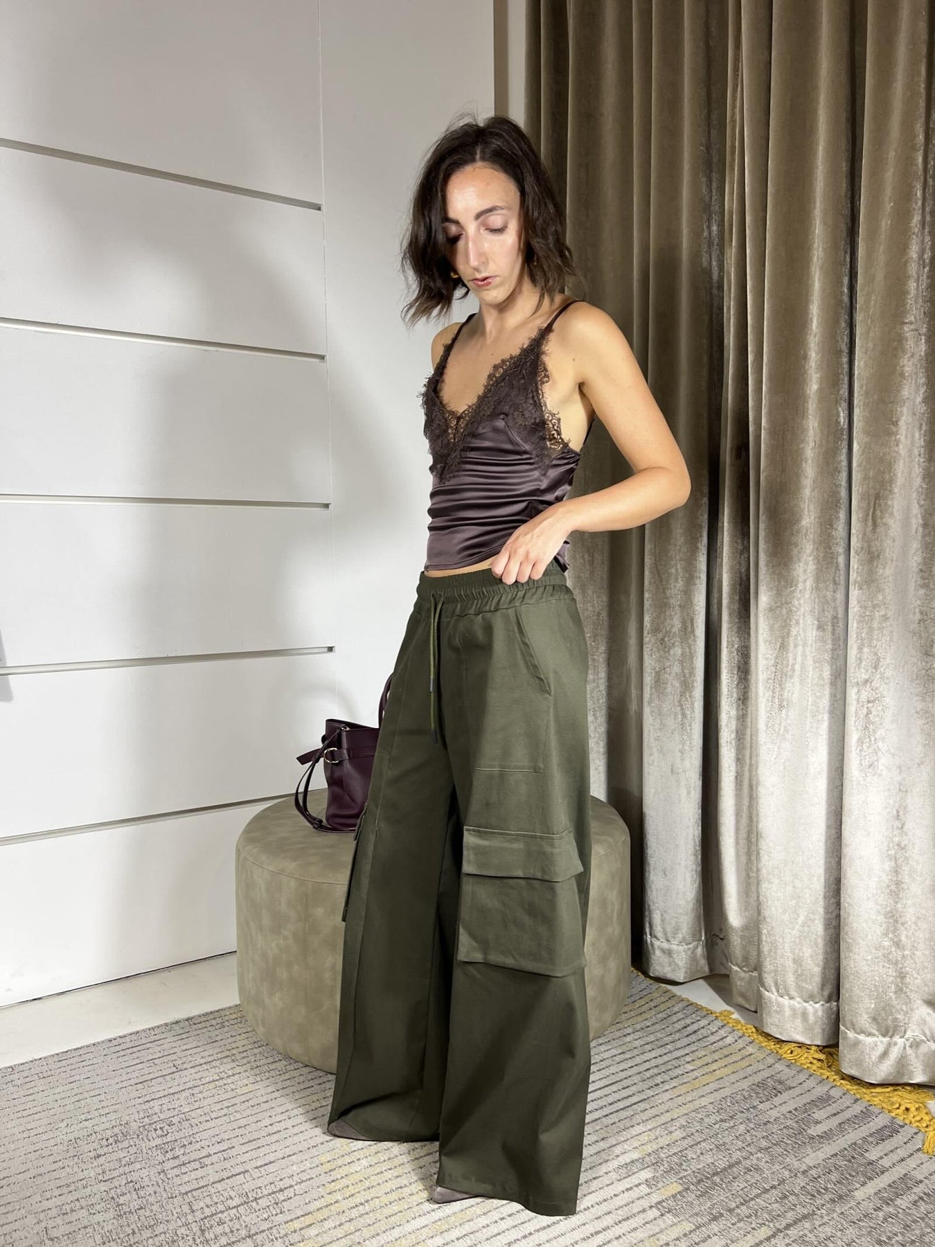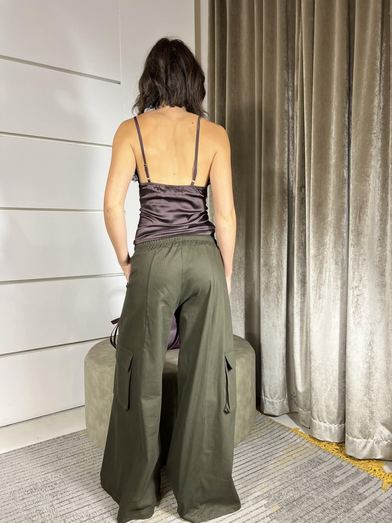 Pantalone HaveOne militare ampio con tasconi a lato e coulisse ed elastico vita. la modella indossa la s ed è alta 172cm. Composizione 98%co2%ea