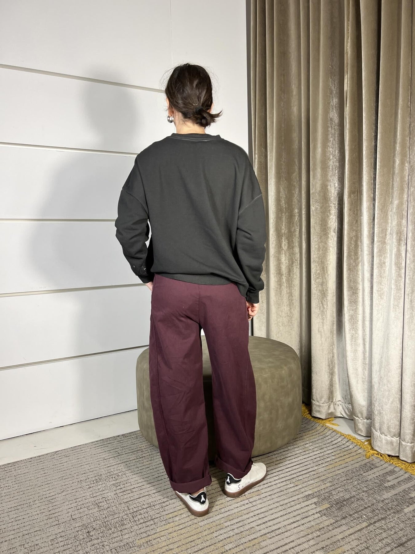 Pantalone Susy Mix vino modello a ovetto. elastico nel retro. La modella indossa la s ed è una 40 ed è alta 172cm. Composizione 97%co 3%ea