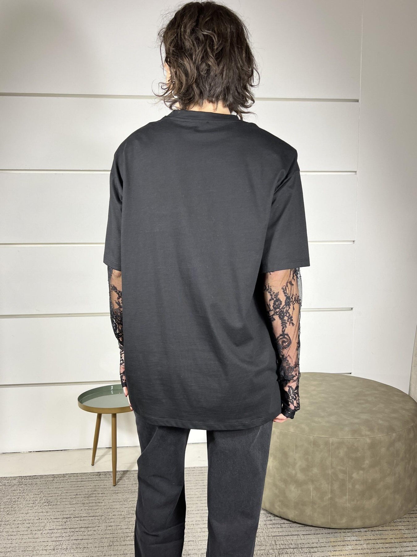 t-shirt Vicolo ner con manica in pizzo e spallina imbottita, la modella è una 40 ed è alta 172cm. Composizione 100%co