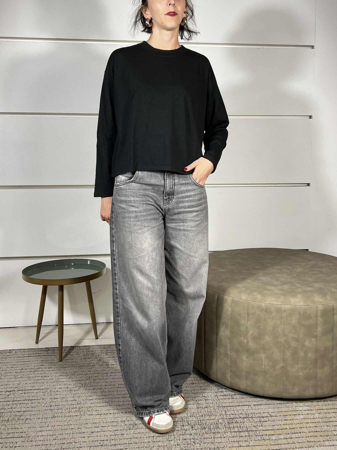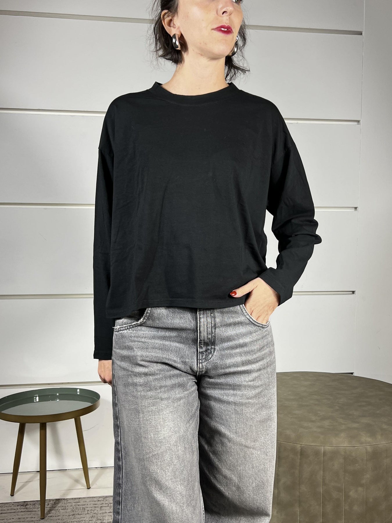 T-shirt HaveOne nera maglia manica lunga, a scatola, in cotone, girocollo. La modella è una 40 ed è alta 172cm, veste da una 38 a una 44. Composizione 95%co 5%ea