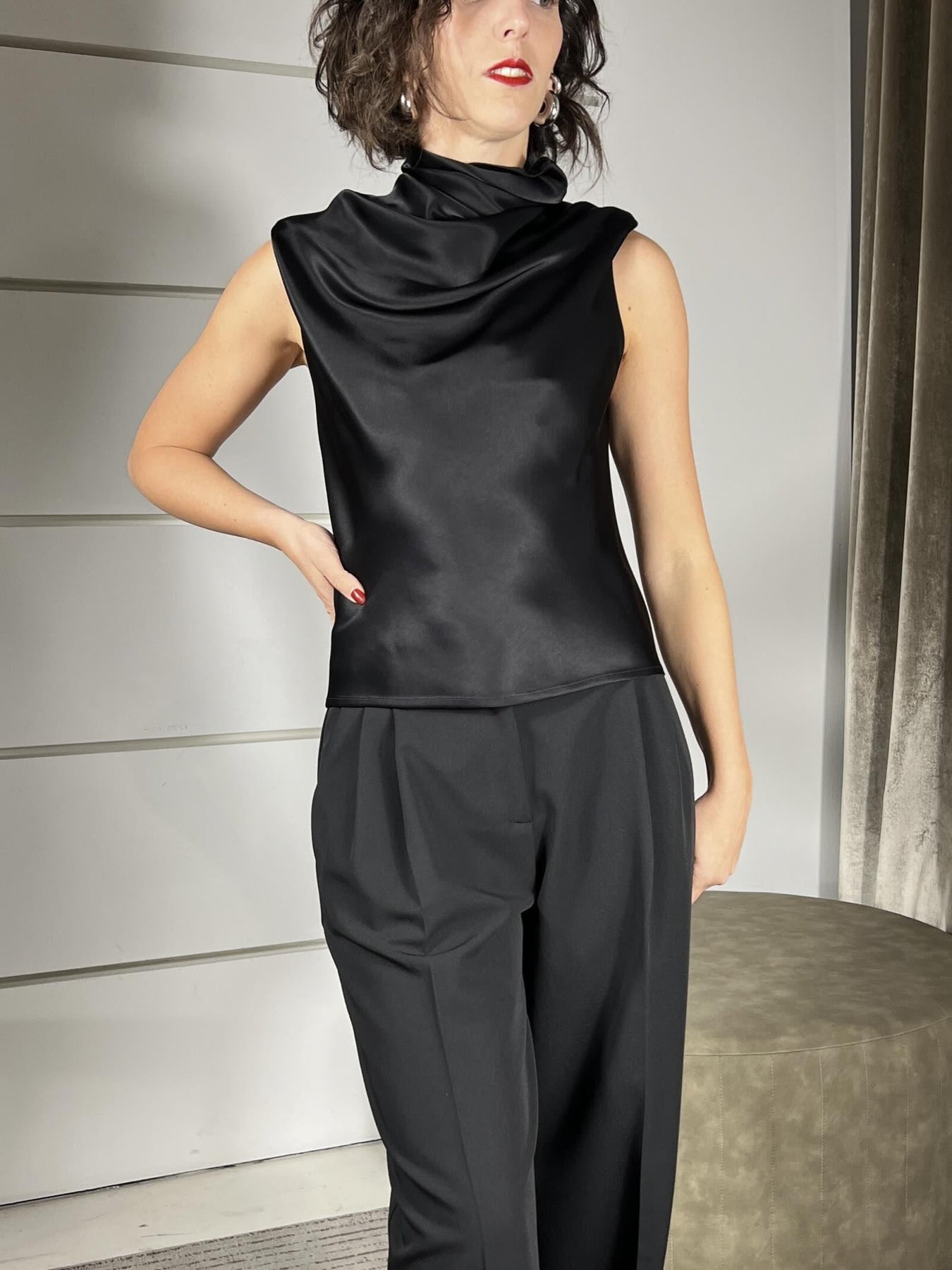 Top Pinko nero in raso con fiocco, smanicato, la modella indossa la 40 ed è alta 172cm. Composizione EST - Tessuto Esterno: 91%AC 9%PL