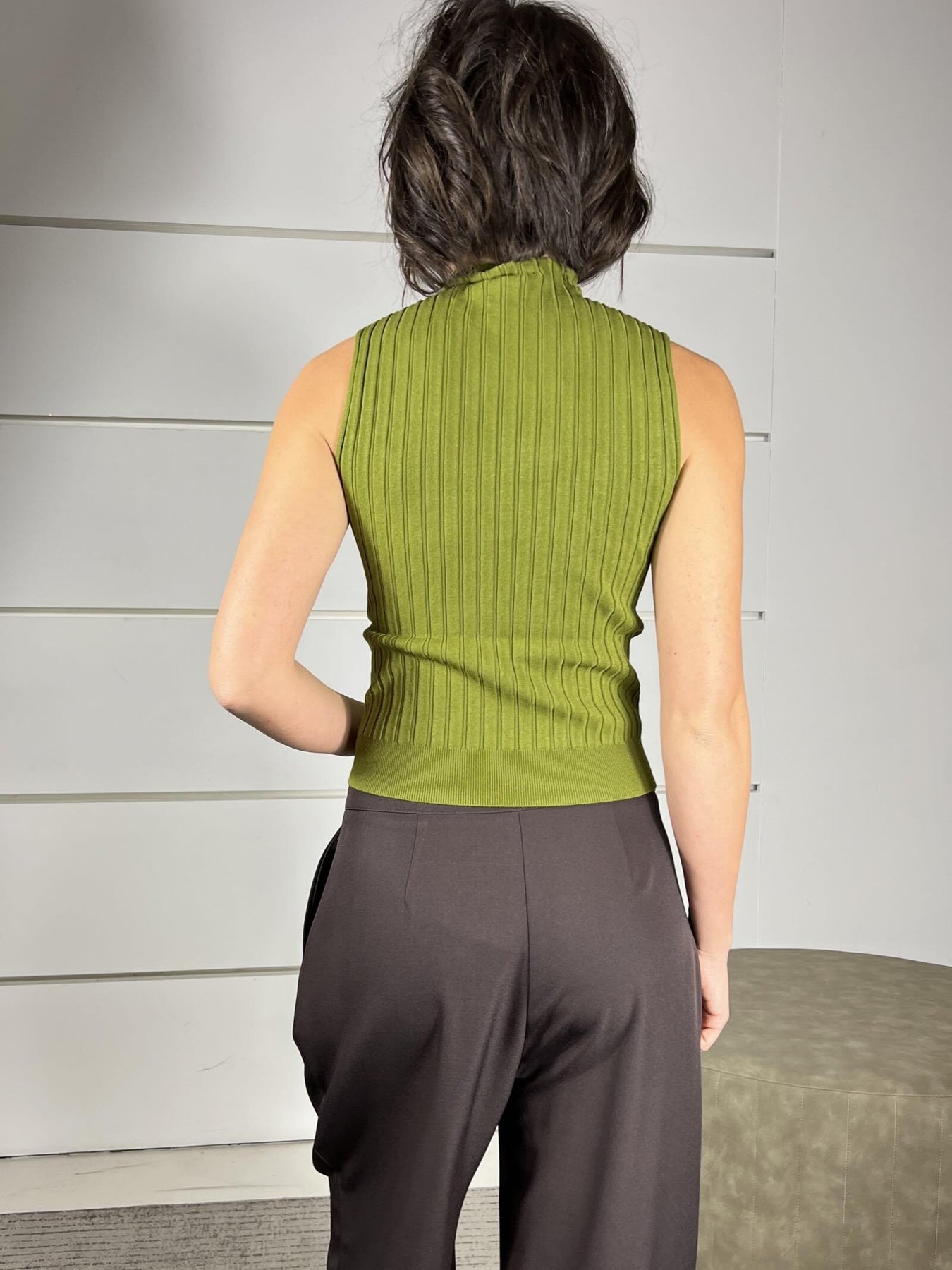 Top Vicolo bianco a coste collo alto, verde olio, aderente, elasticizzato. La modella è una 40 ed è alta 172cm. Veste da una 38 a una 44. Composizione 70%vi 30%pl