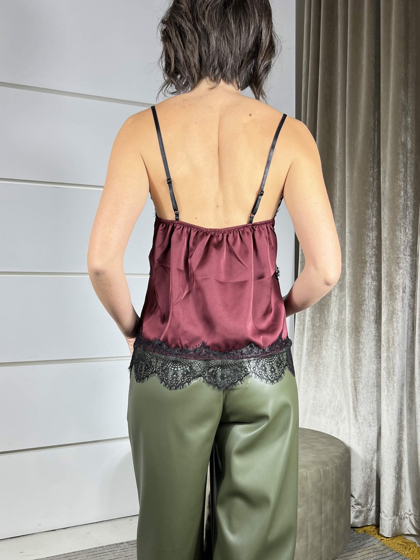 top Susy Mix vino satin con pizzo a contrasto nero, la modella indossa la s ed è alat 172cm. Composizione 100%pl