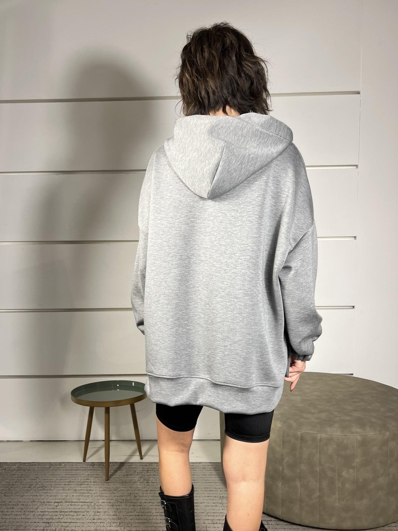 felpa HaveOne grigia con cappuccio e ricamo e spacchi a lato, anche se non è felpata è molto calda , la modella è una 40 ed è alta 17cm, veste da una 38 a una 46. Composizione 48%ry 46%pl 6%ea