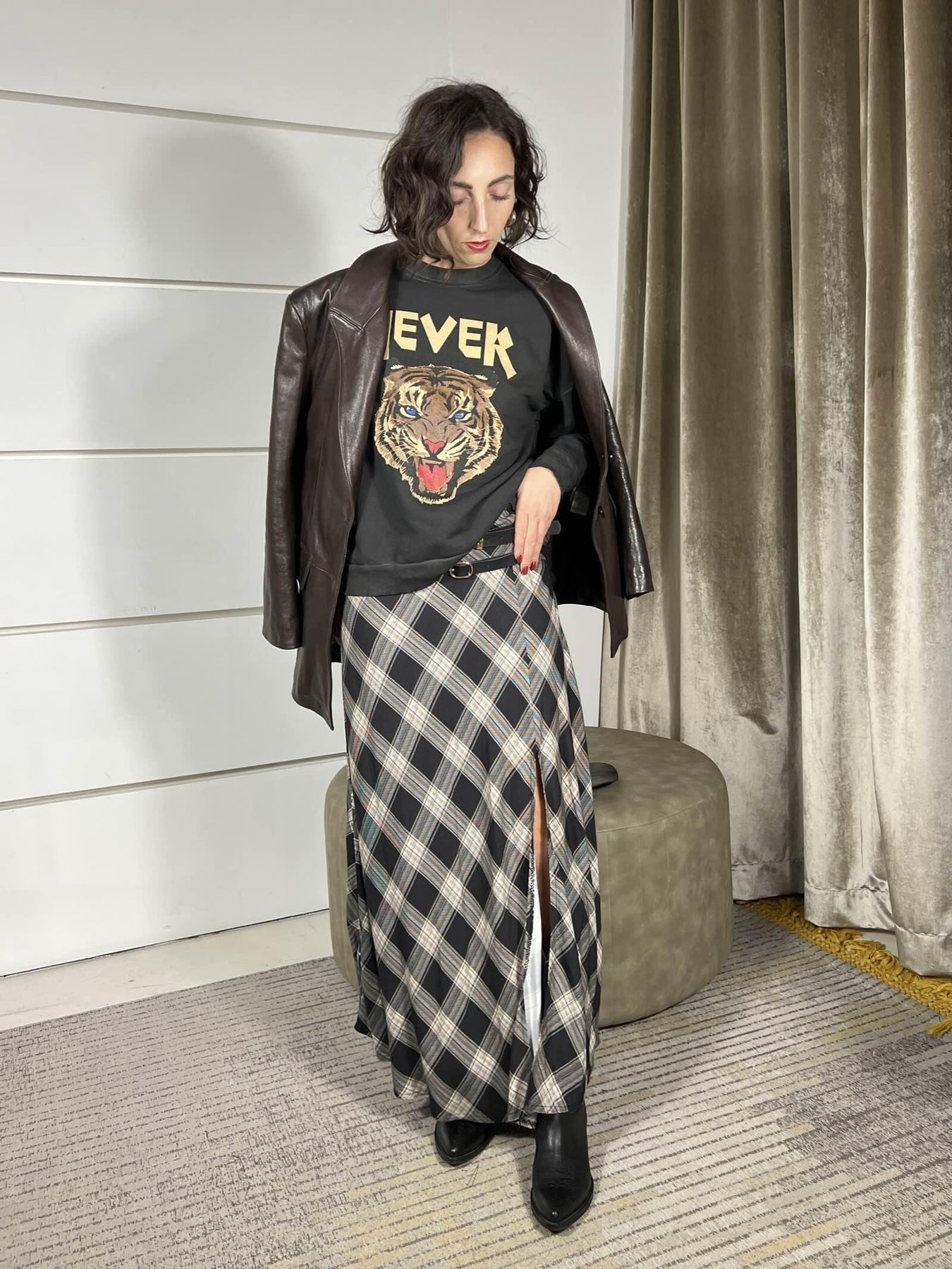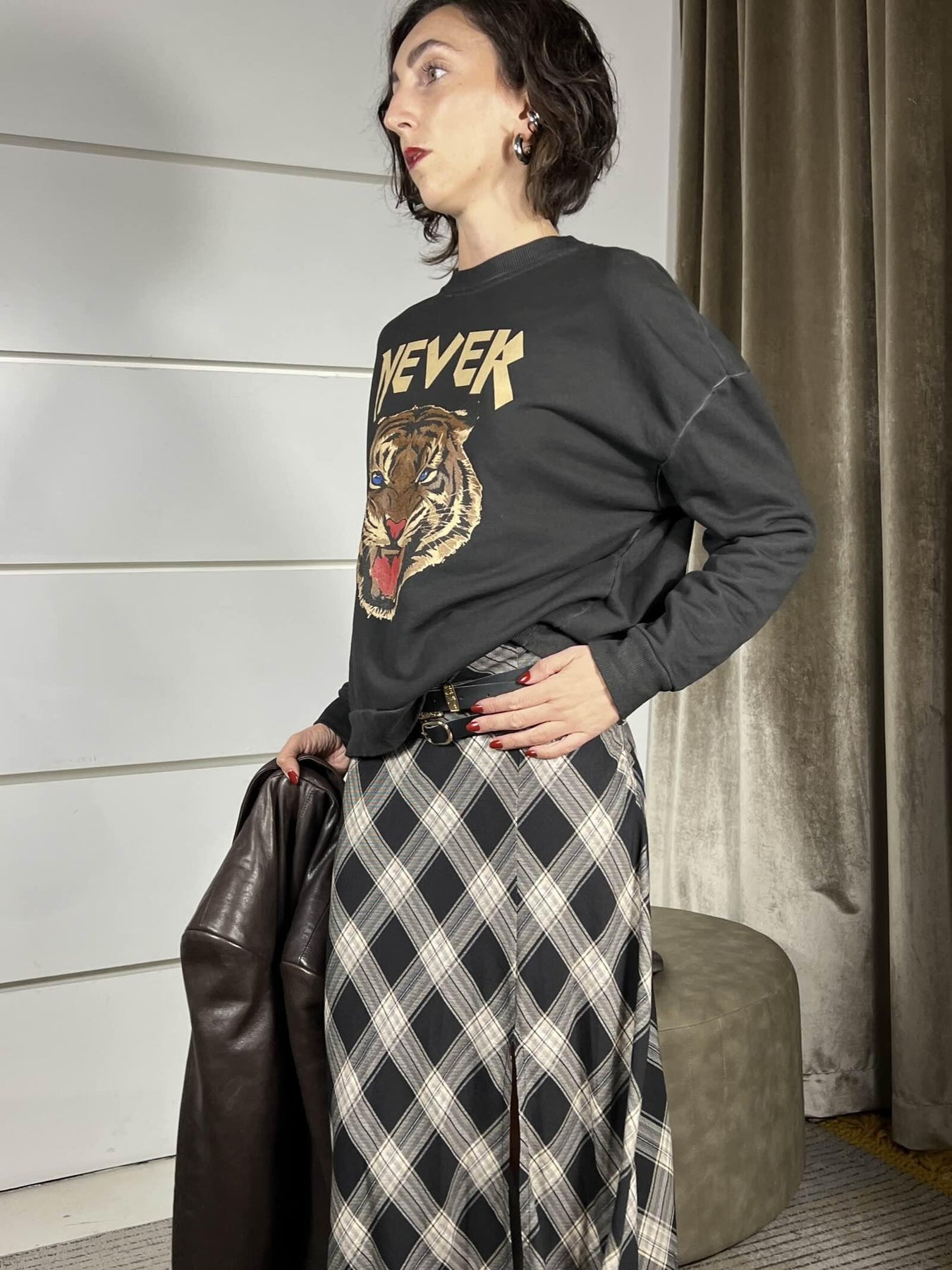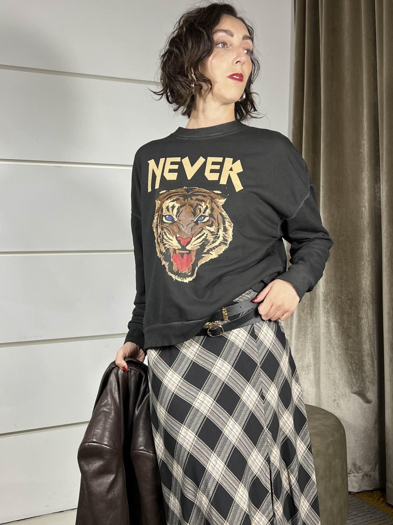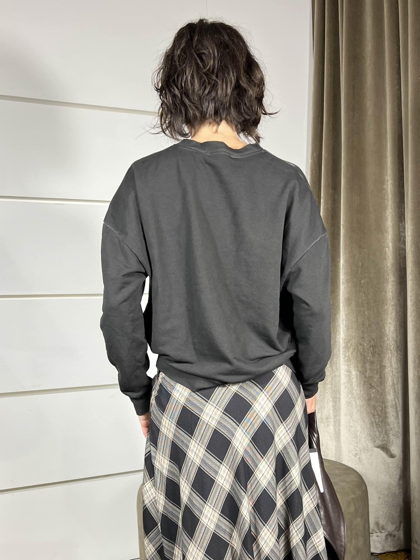 Felpa HaveOne grigia con stampa girocollo, grzata. La modella è una 40 ed è alta 172cm. Composizione 60%co 40%pl