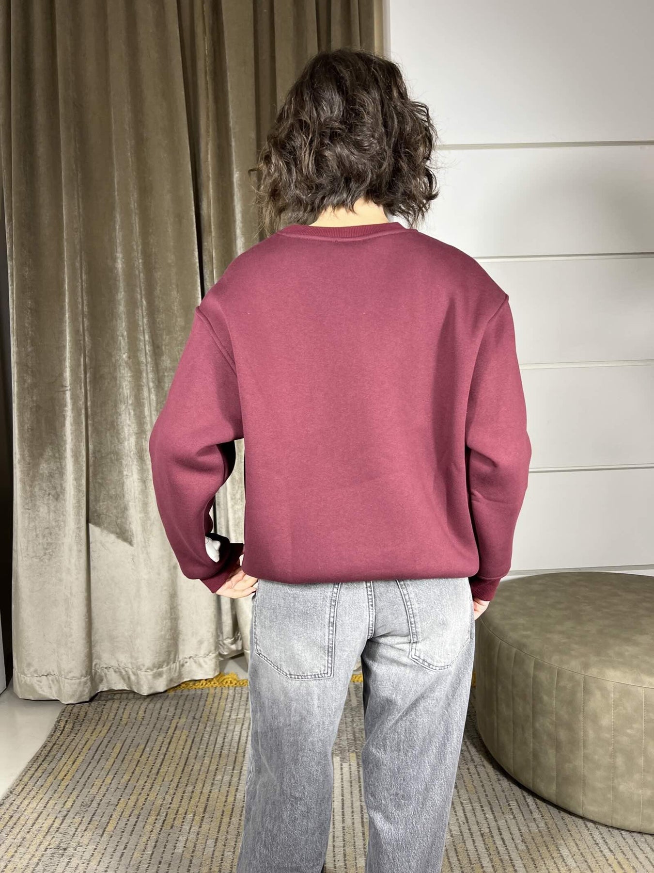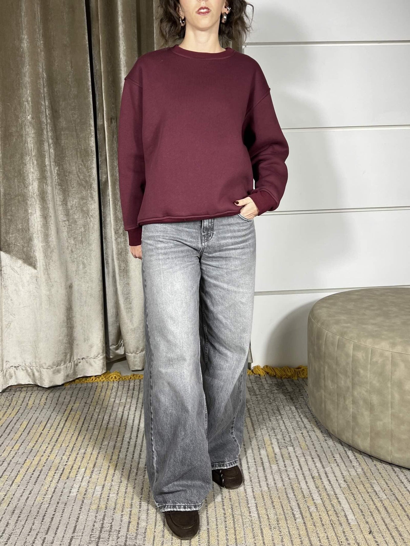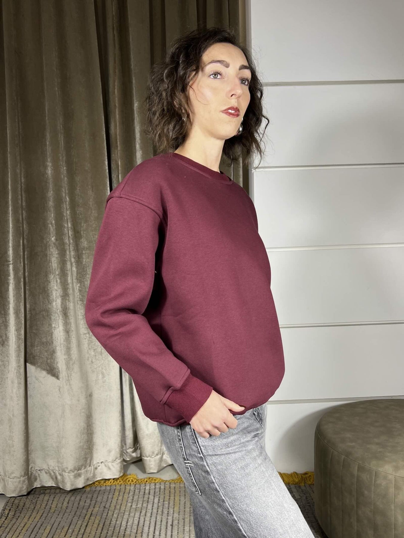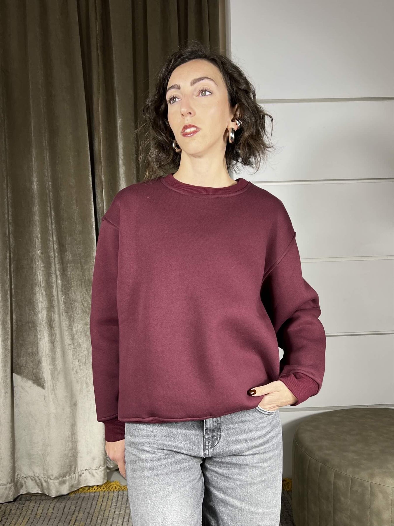felpa Susy Mix vino, felpata, modello girocollo. La vestibilità è regolare, veste da una 38 a una 44, la modella è alta 172 cm. Composizione: 65%co 35%pl