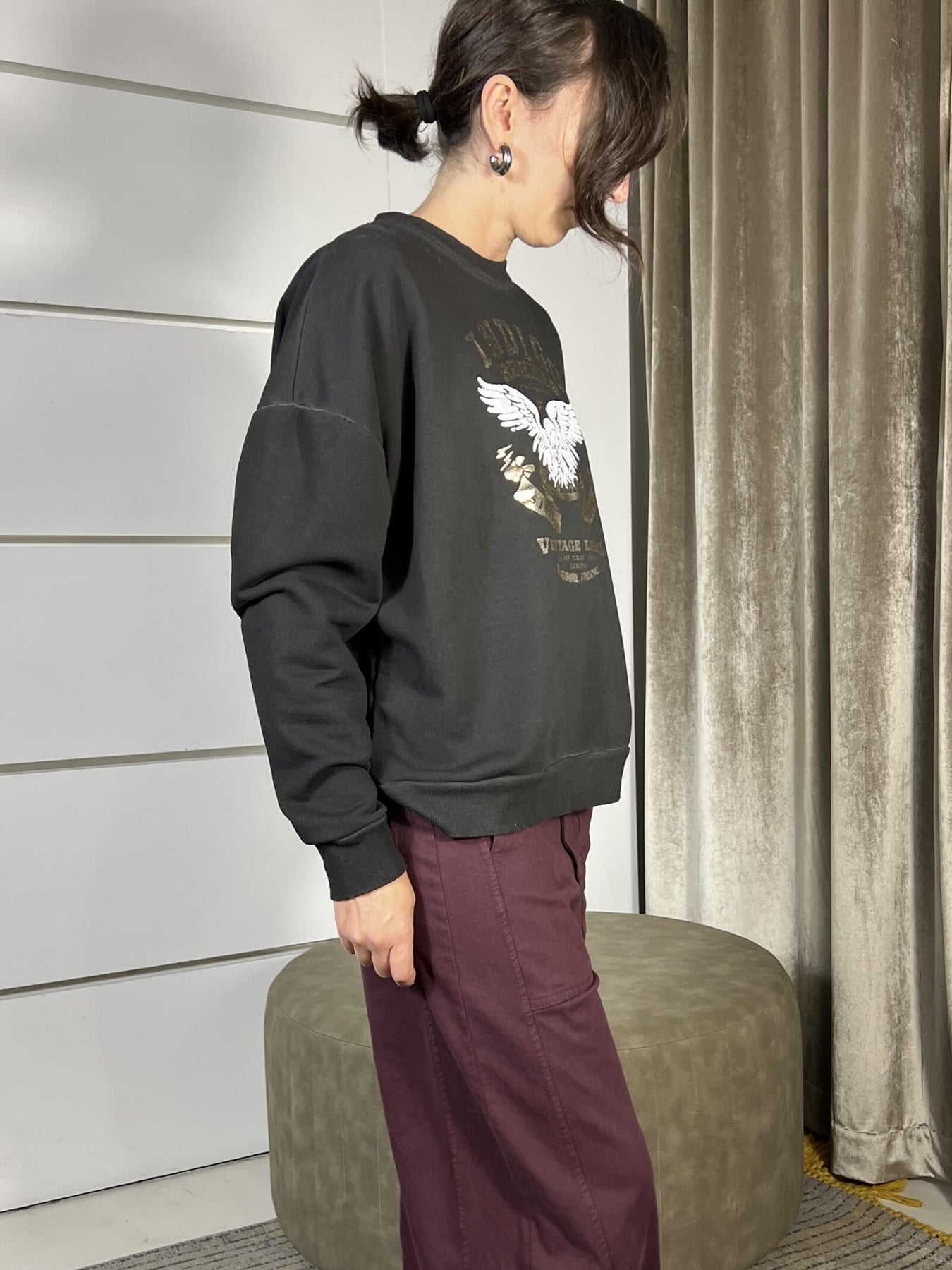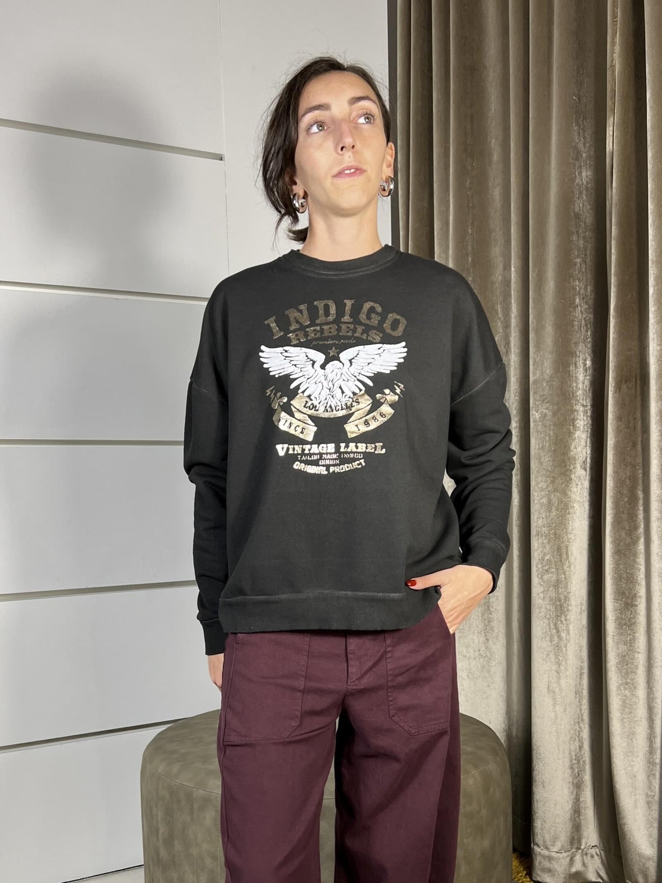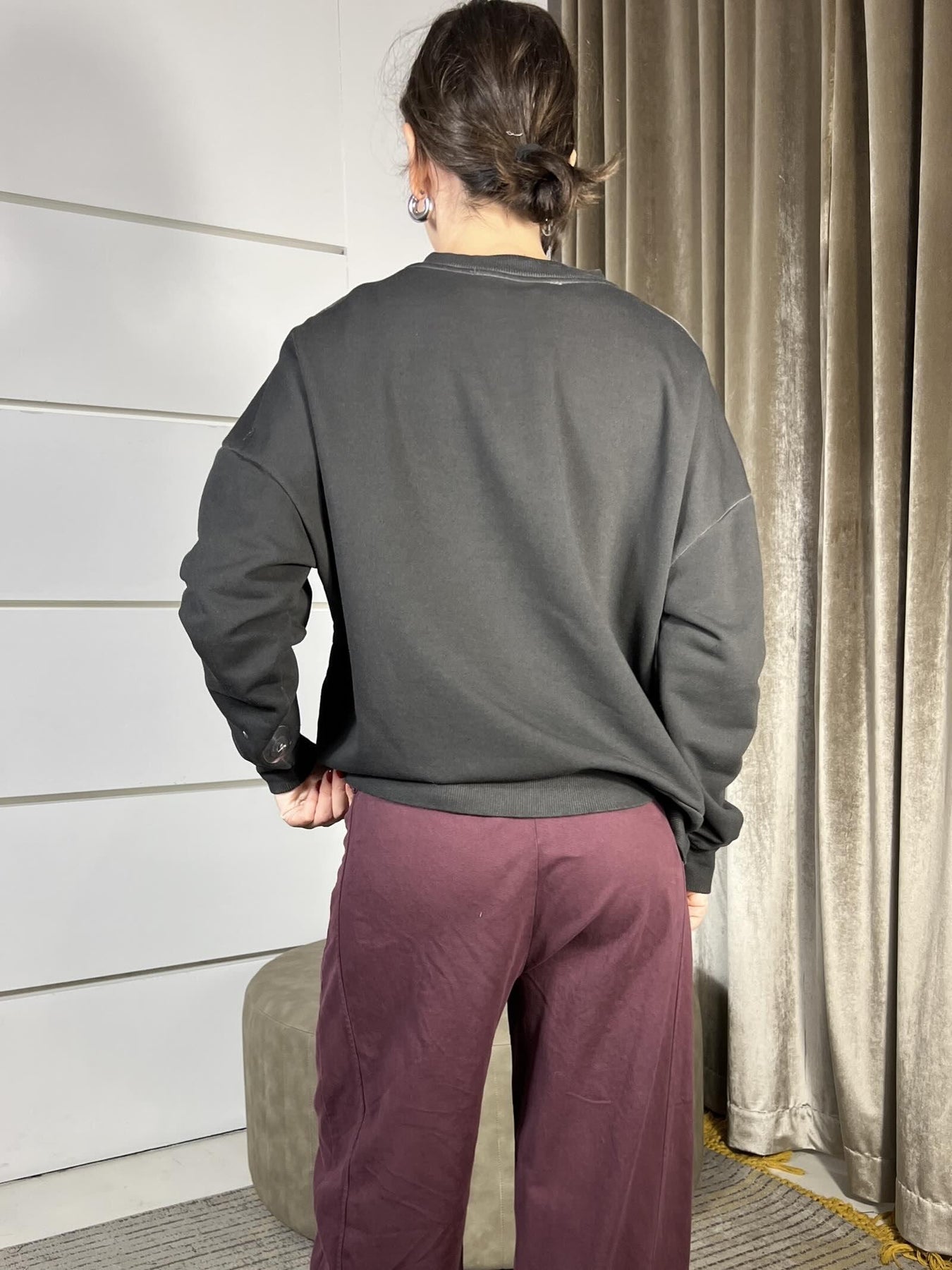Felpa HaveOne GRIGIA con stampa girocollo, grzata. La modella è una 40 ed è alta 172cm. Composizione 60%co 40%pl