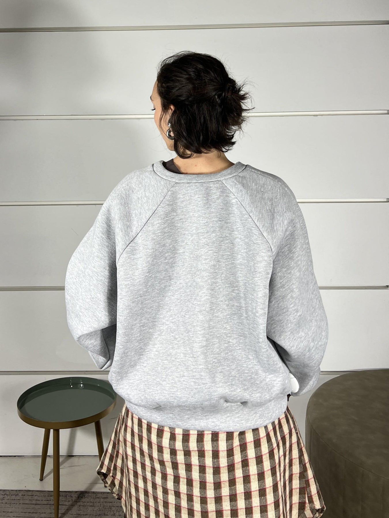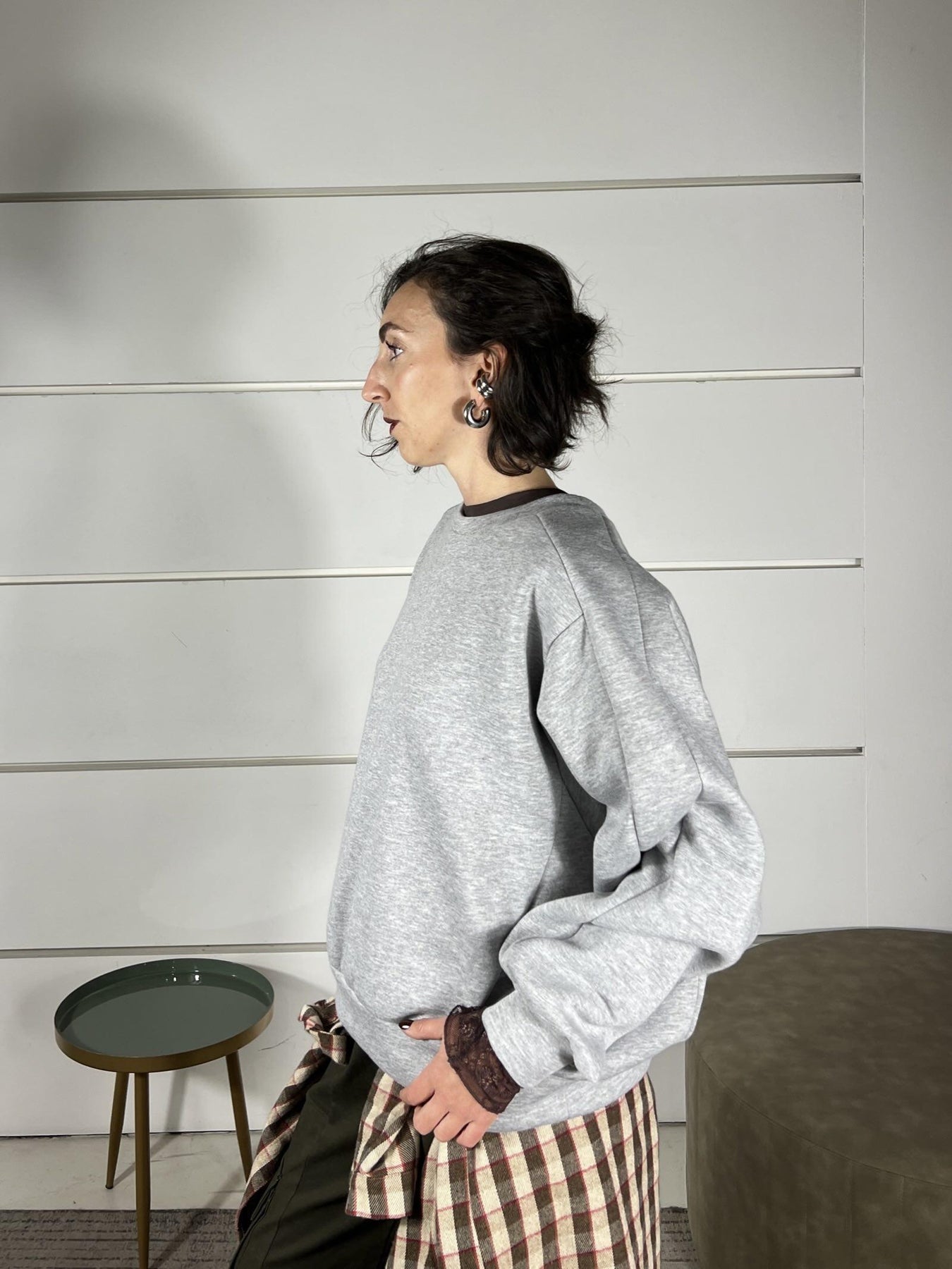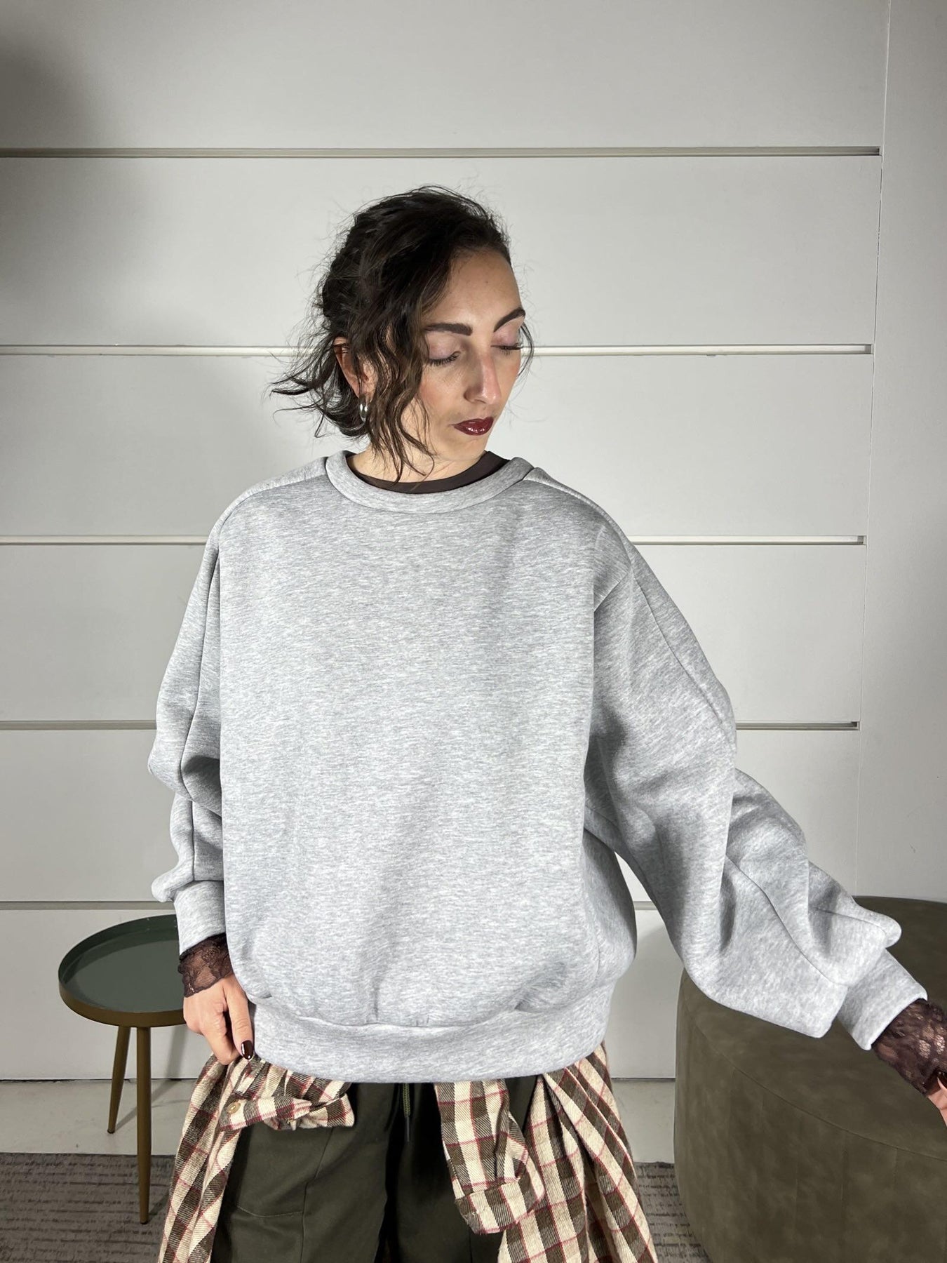 felpa Have One over felpata con polsini grigia, la modella è alta 172 cm e veste da una 38 a una 44. Composizione: 55%co 45%pl.