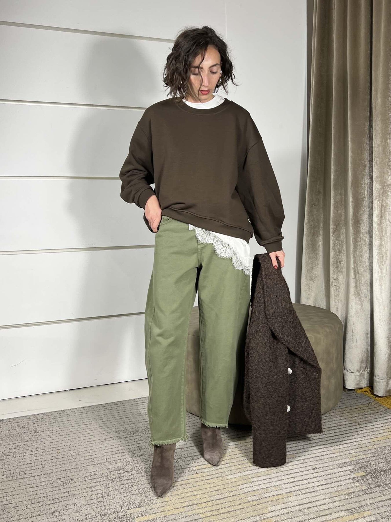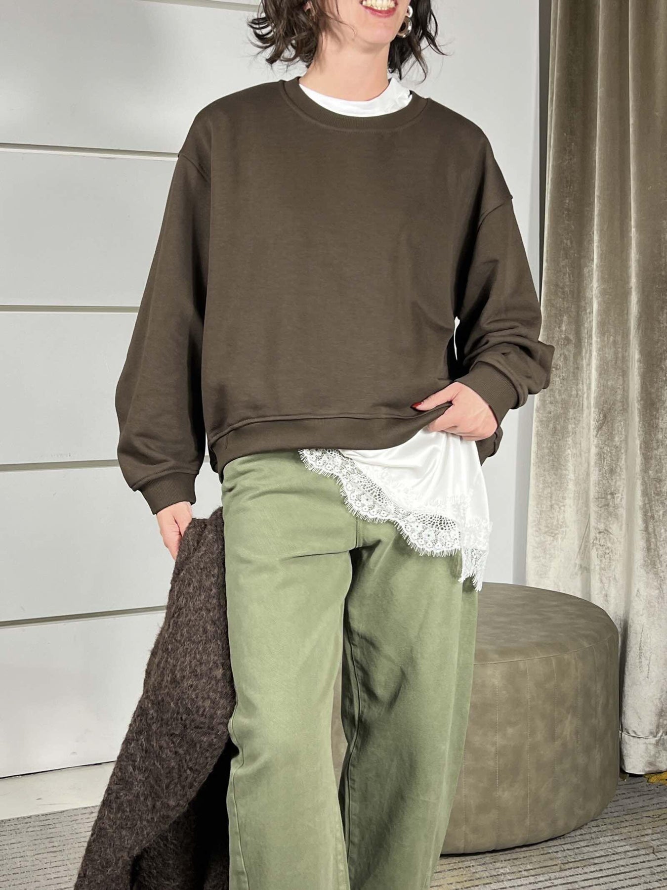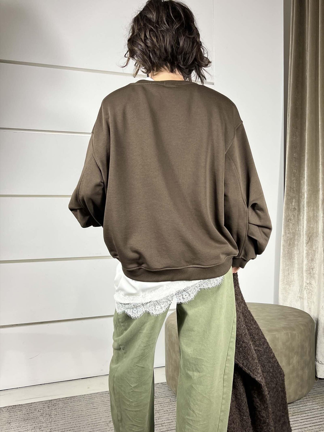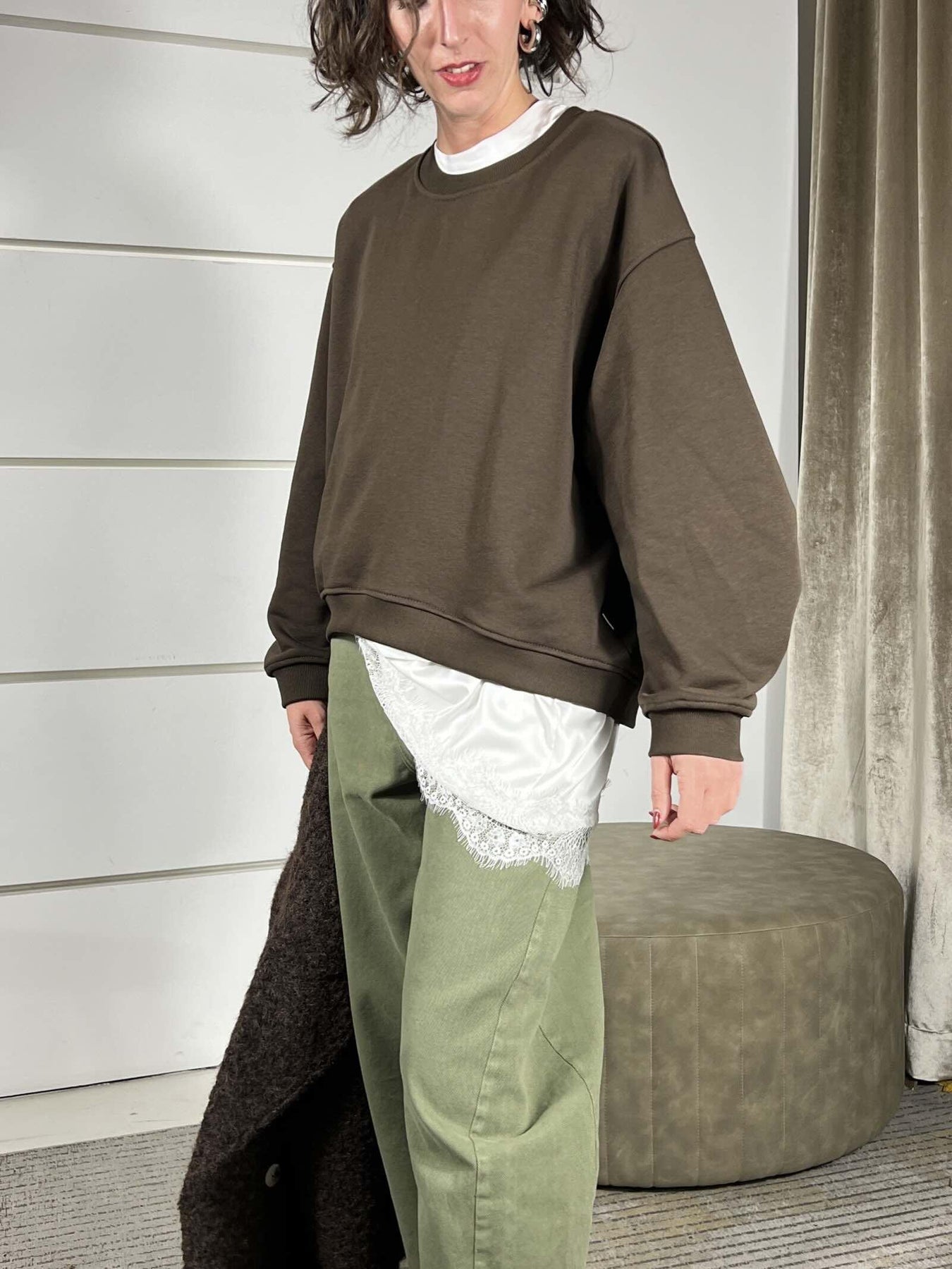 Felpa Vicolo moro over garzata girocollo. La modella è una 40 ed è alta 172cm. Composizione 65%co 35%pl 95%co 5%ea