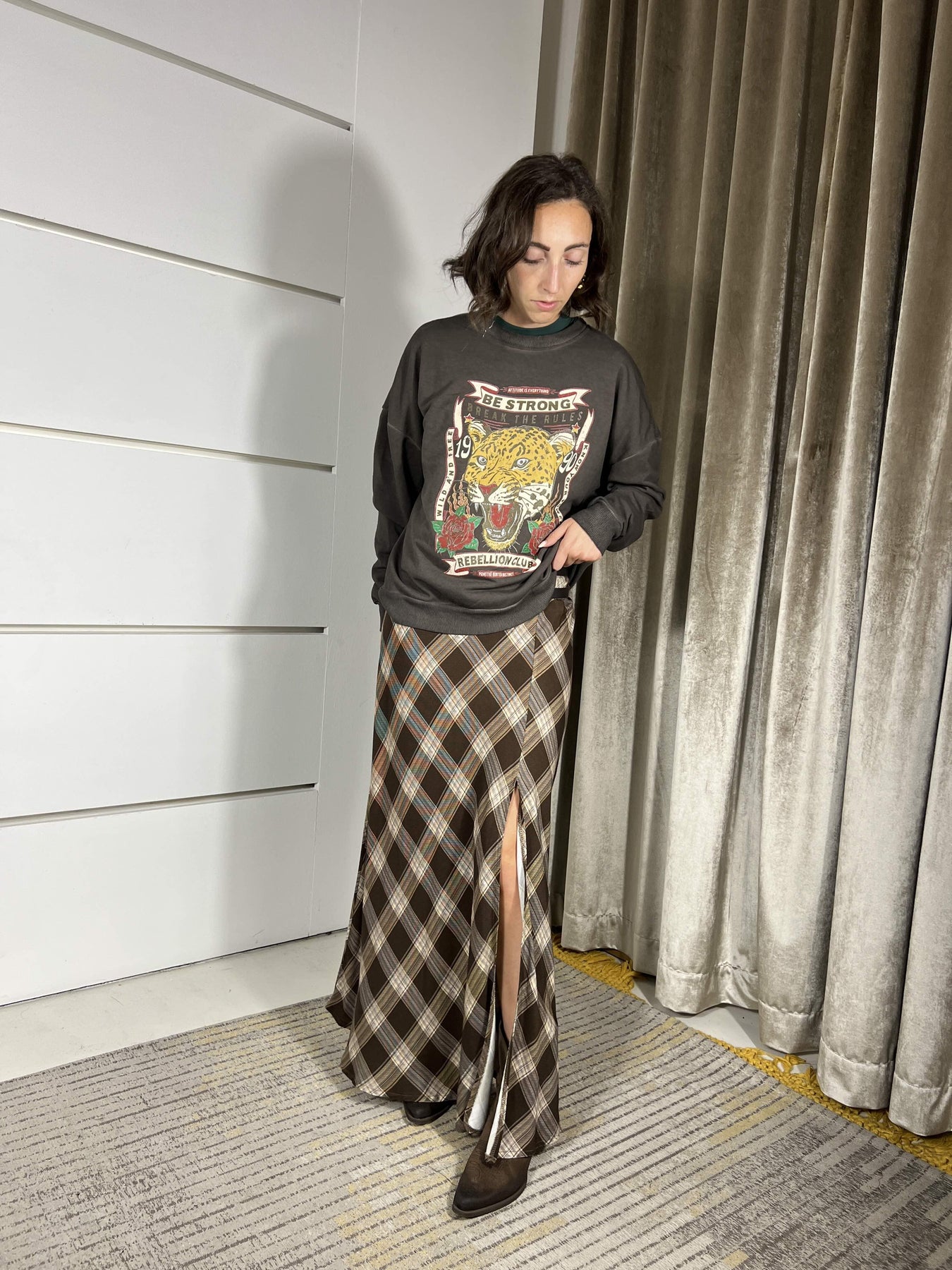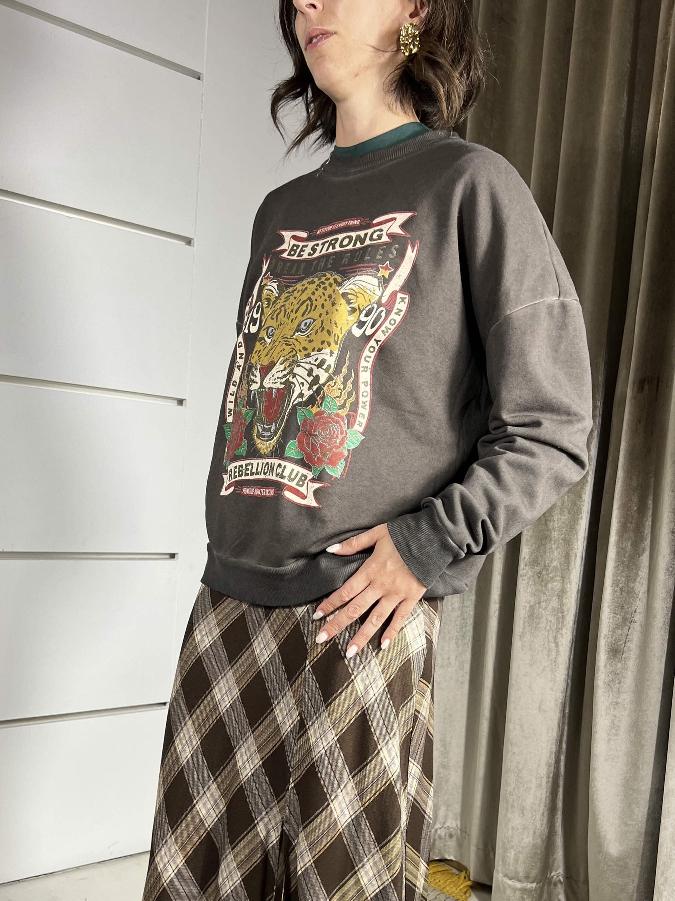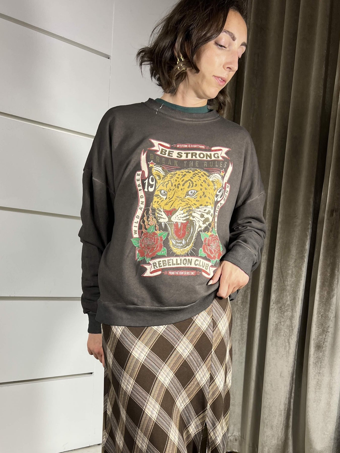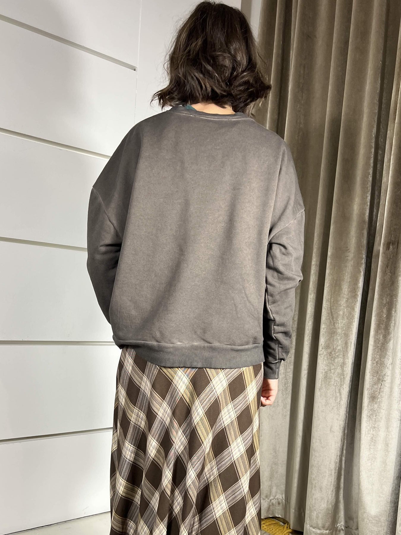 Felpa HaveOne moro con stampa girocollo, grzata. La modella è una 40 ed è alta 172cm. Composizione 60%co 40%pl