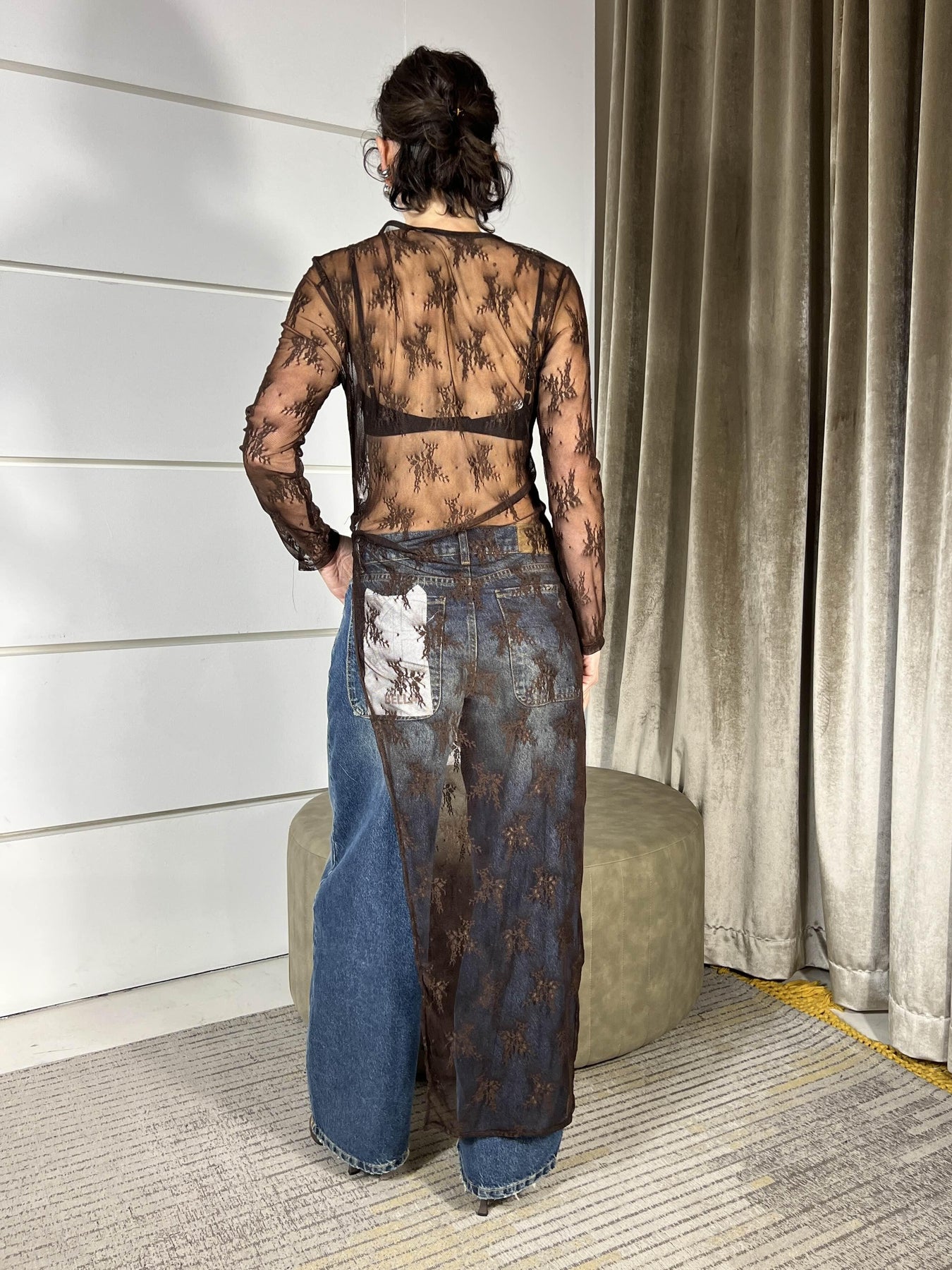 abito Tensione In moro manica lunga, lungo in pizzo elasticizzato con spacco alato, la modella è una 40 e indossa la s, è alta 172cm. Composizione m. viscosa