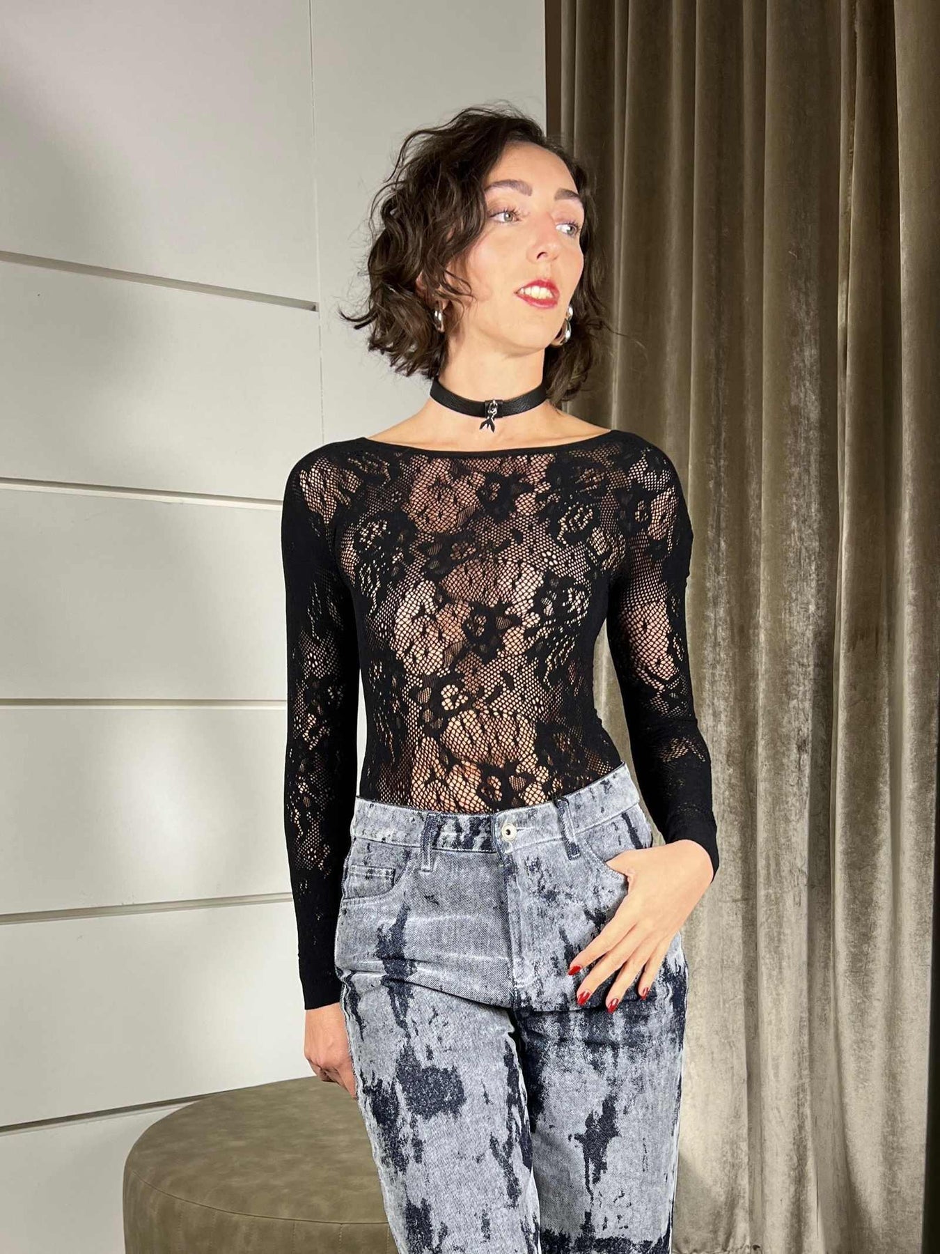 Body Patrizia Pepe nero in pizzo stretch , manica lunga, con scollo posteriore, vestibilità aderente. La modella è una 40 è alta 172cm, veste das una 38 a una 44. Composizione 8% Elastan, 92% Poliammide