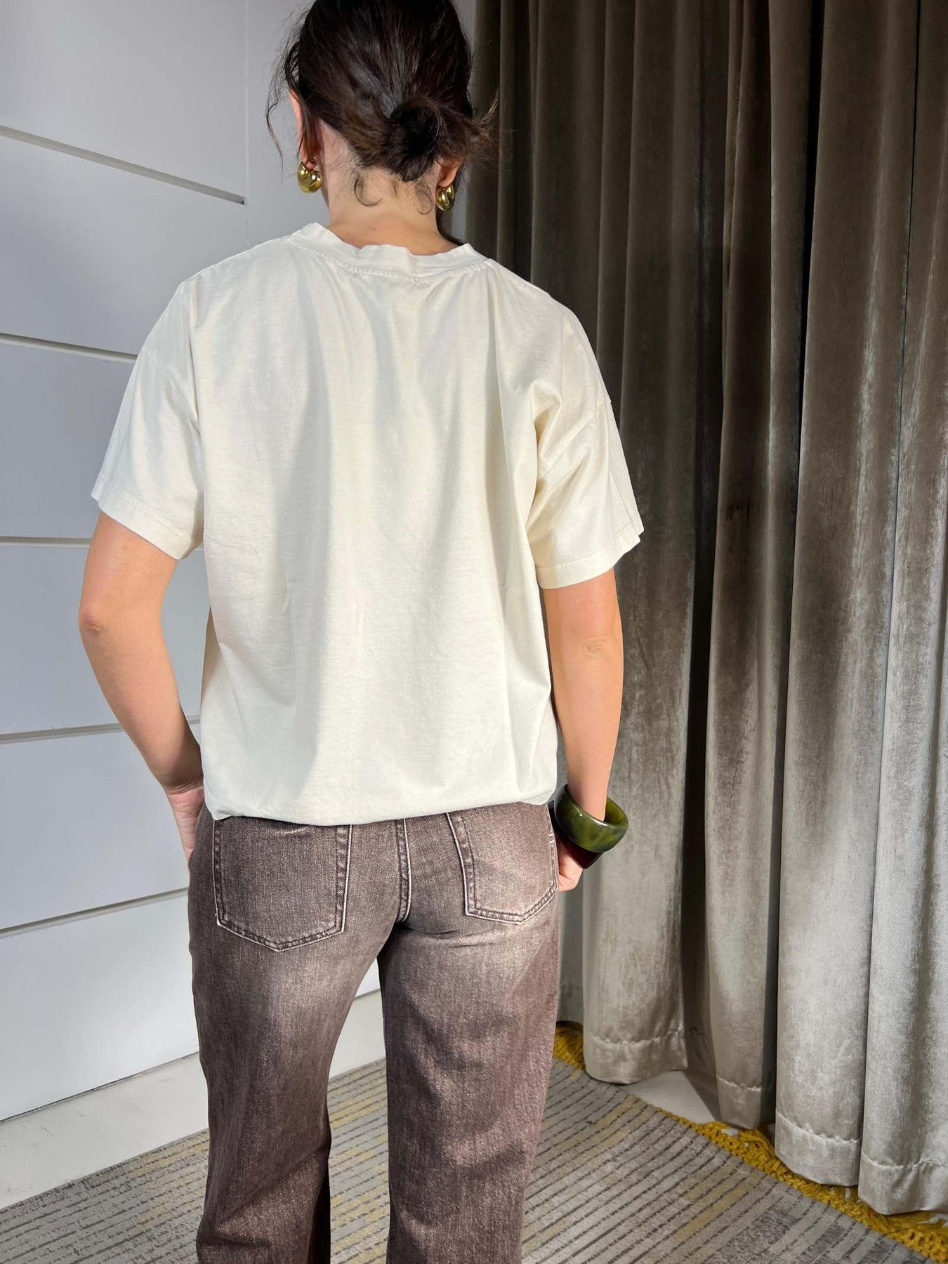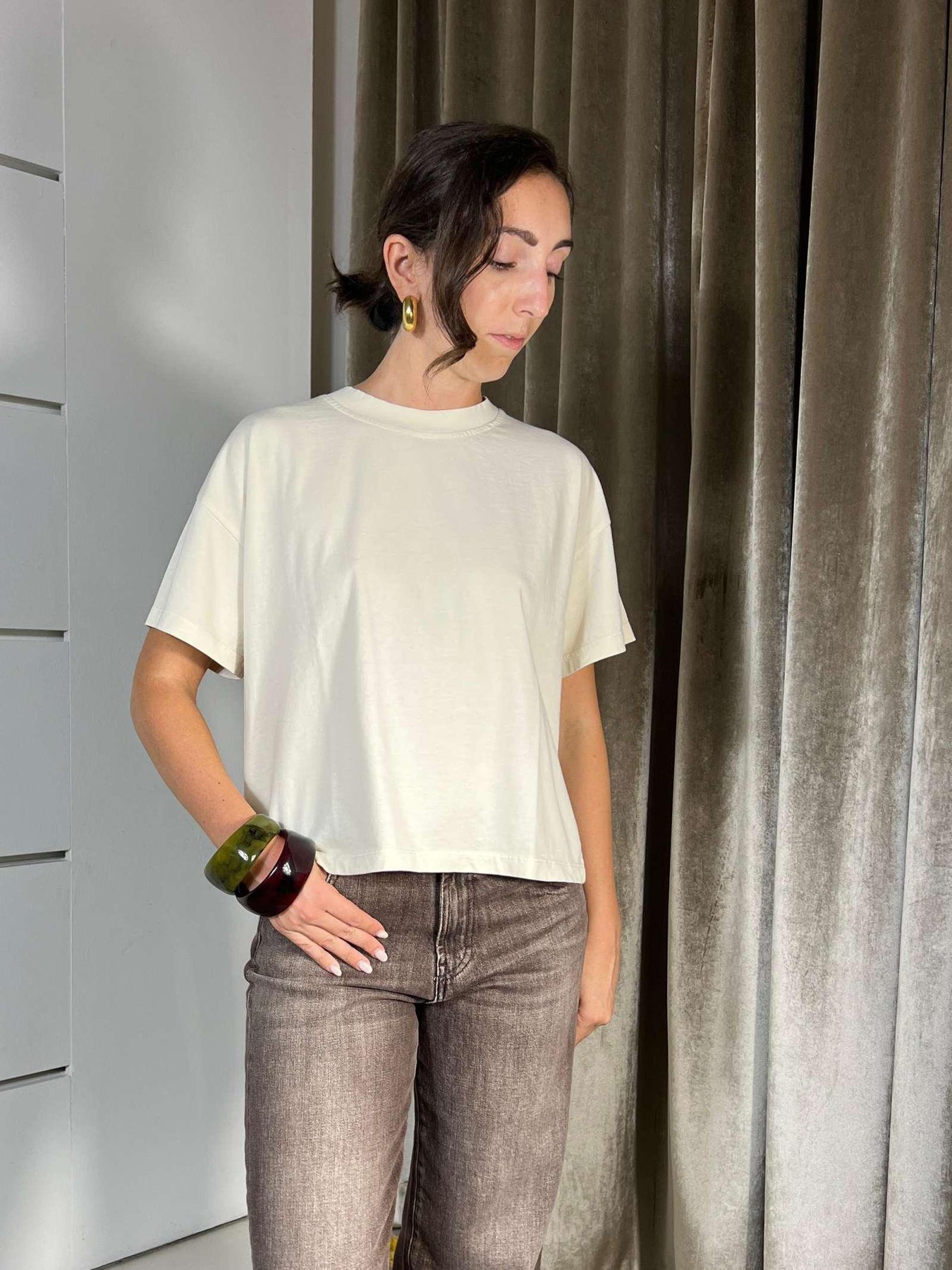 T-shirt HaveOne burro modello a scatola, girocollo, manica corta. La modella è una 40 ed è alta 172cm. Composizione 95%co 5%ea
