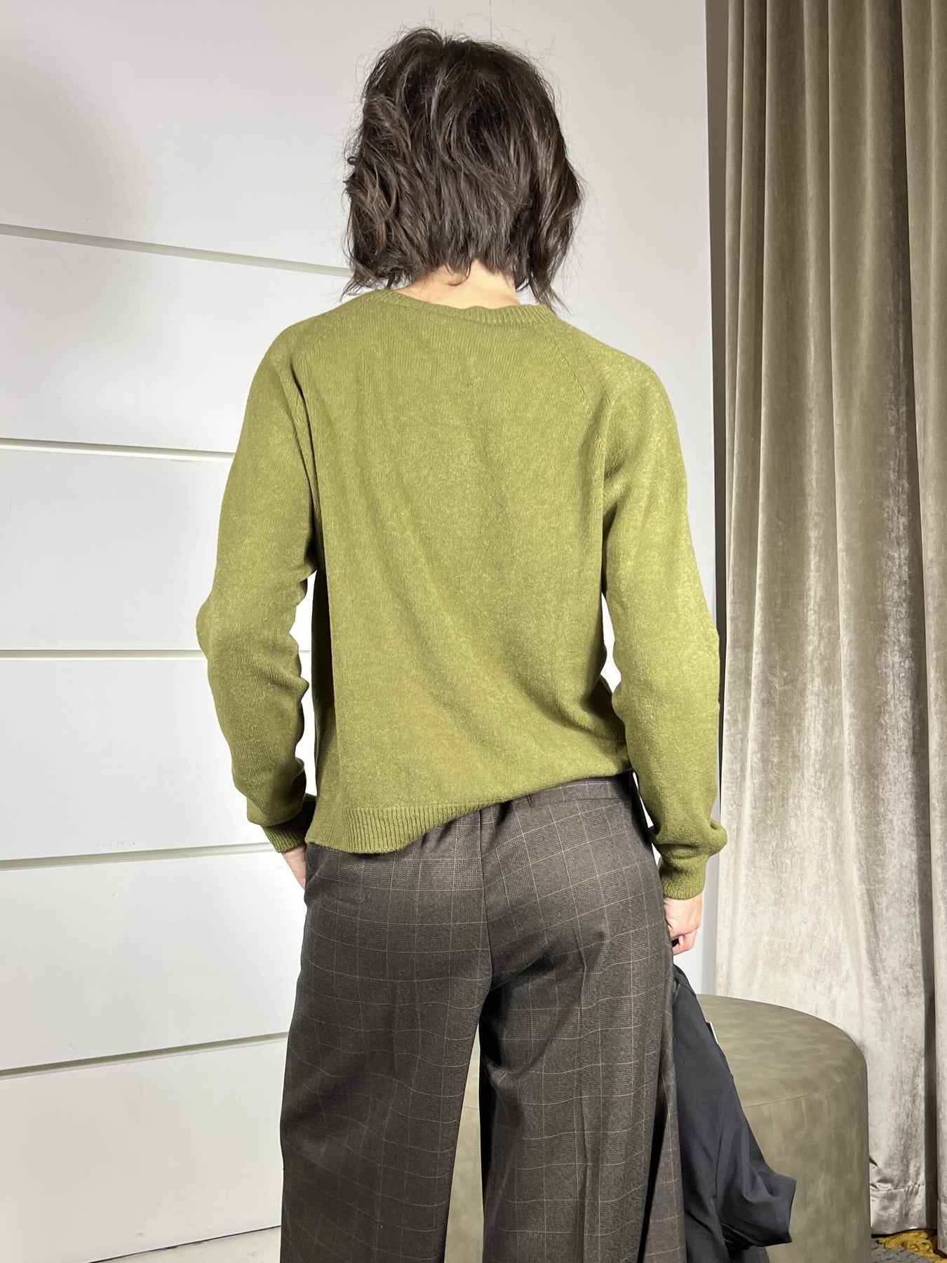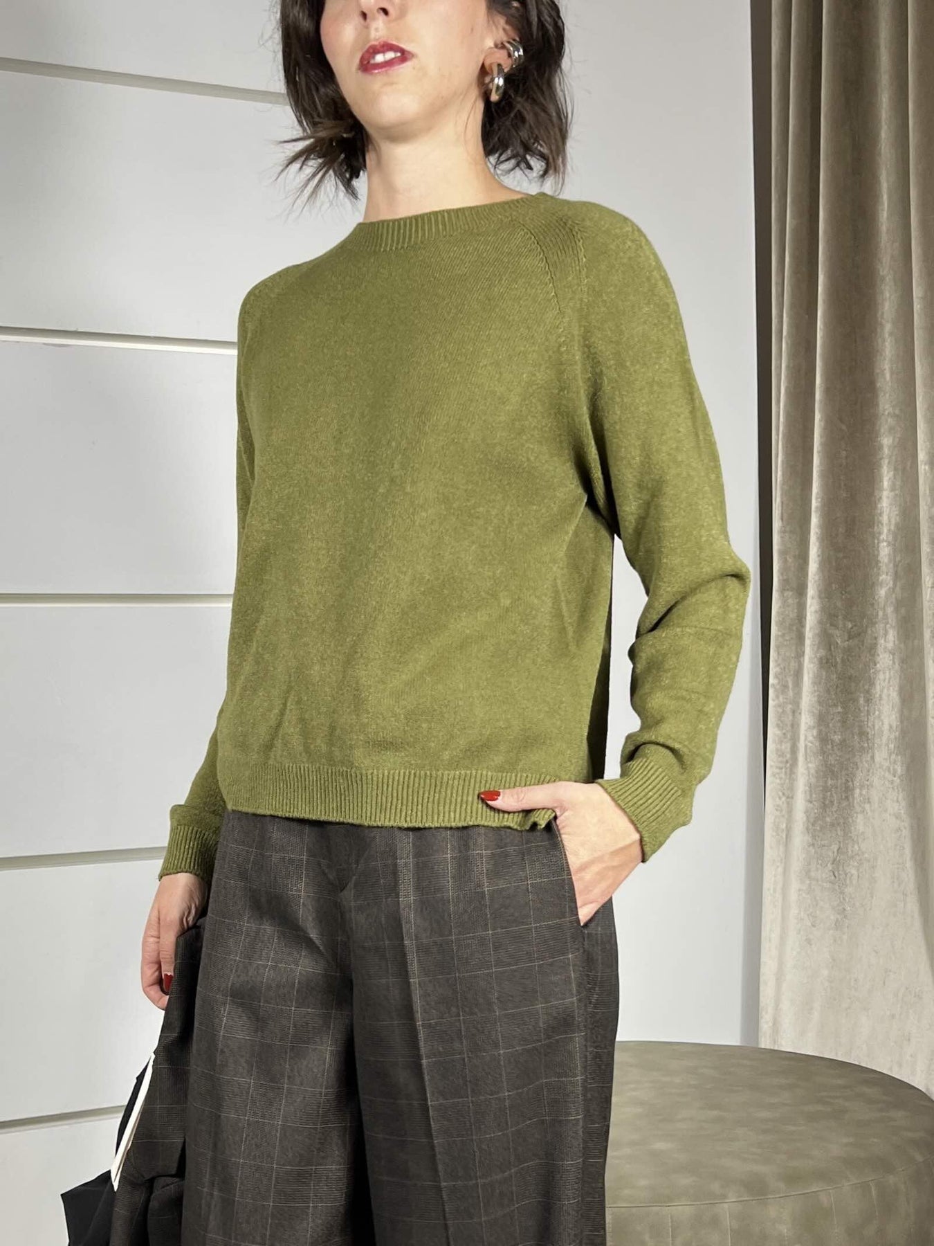 maglia Susy Mix verde olio paricollo a scatoletta , la modella è una 40 ed è alta 172cm. Composizione 56%vi 28%pl 16%pa