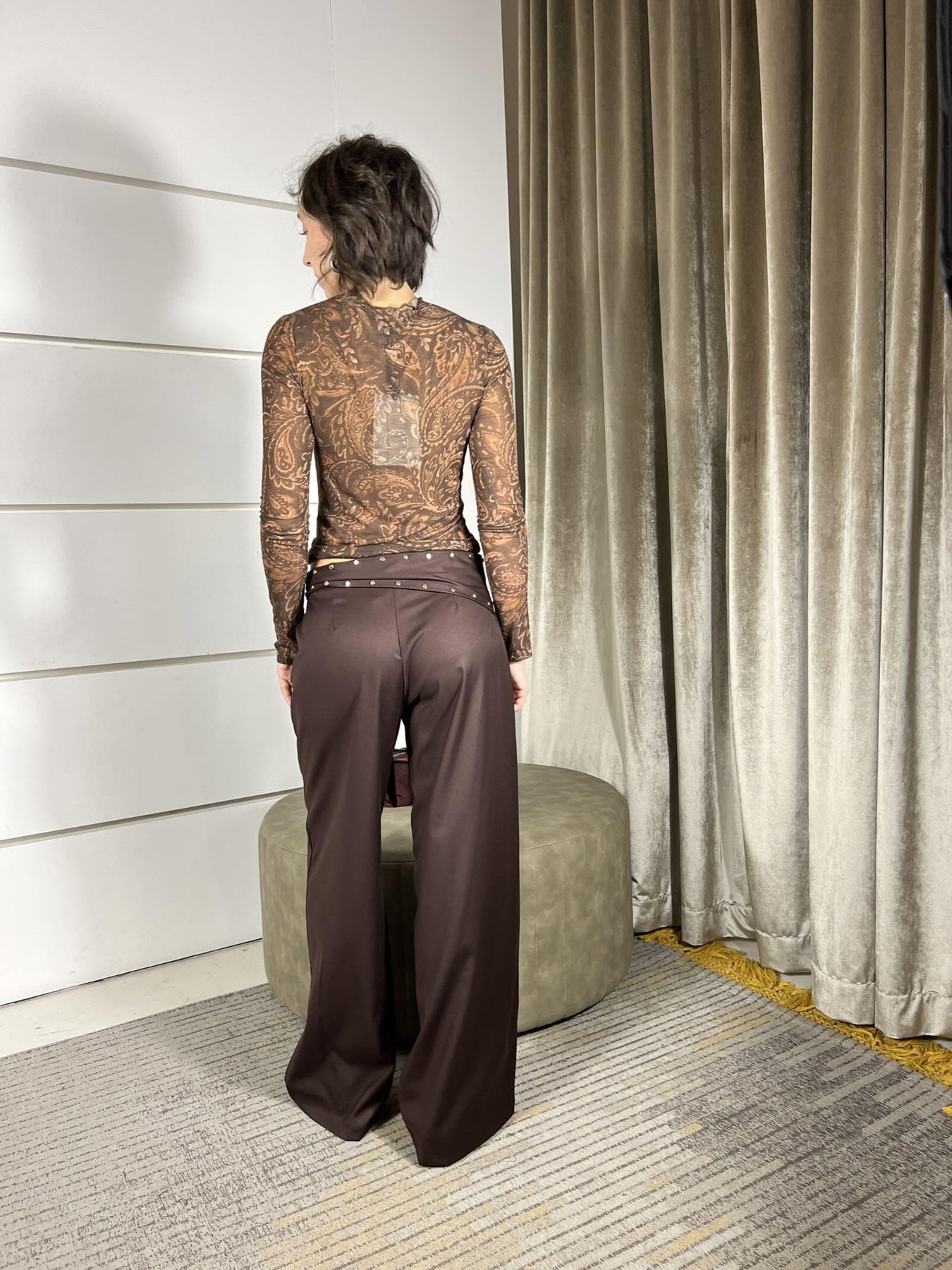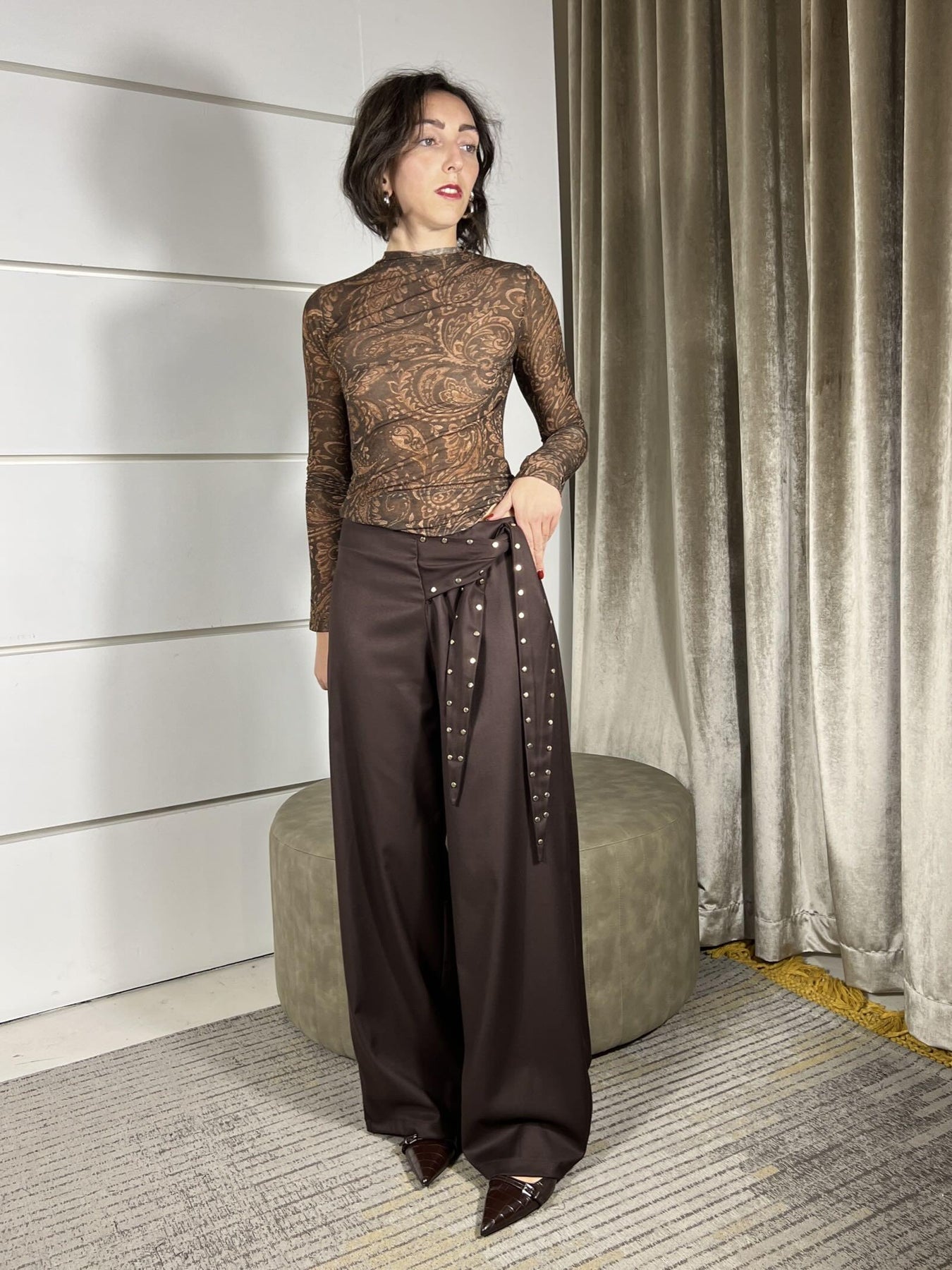 pantalone HaveOne moro a palazzo con cintura con borchie, la modella indossa la s ed è alta 172cm. COMPOSIZIONE 64%pl 33%vi 3%es