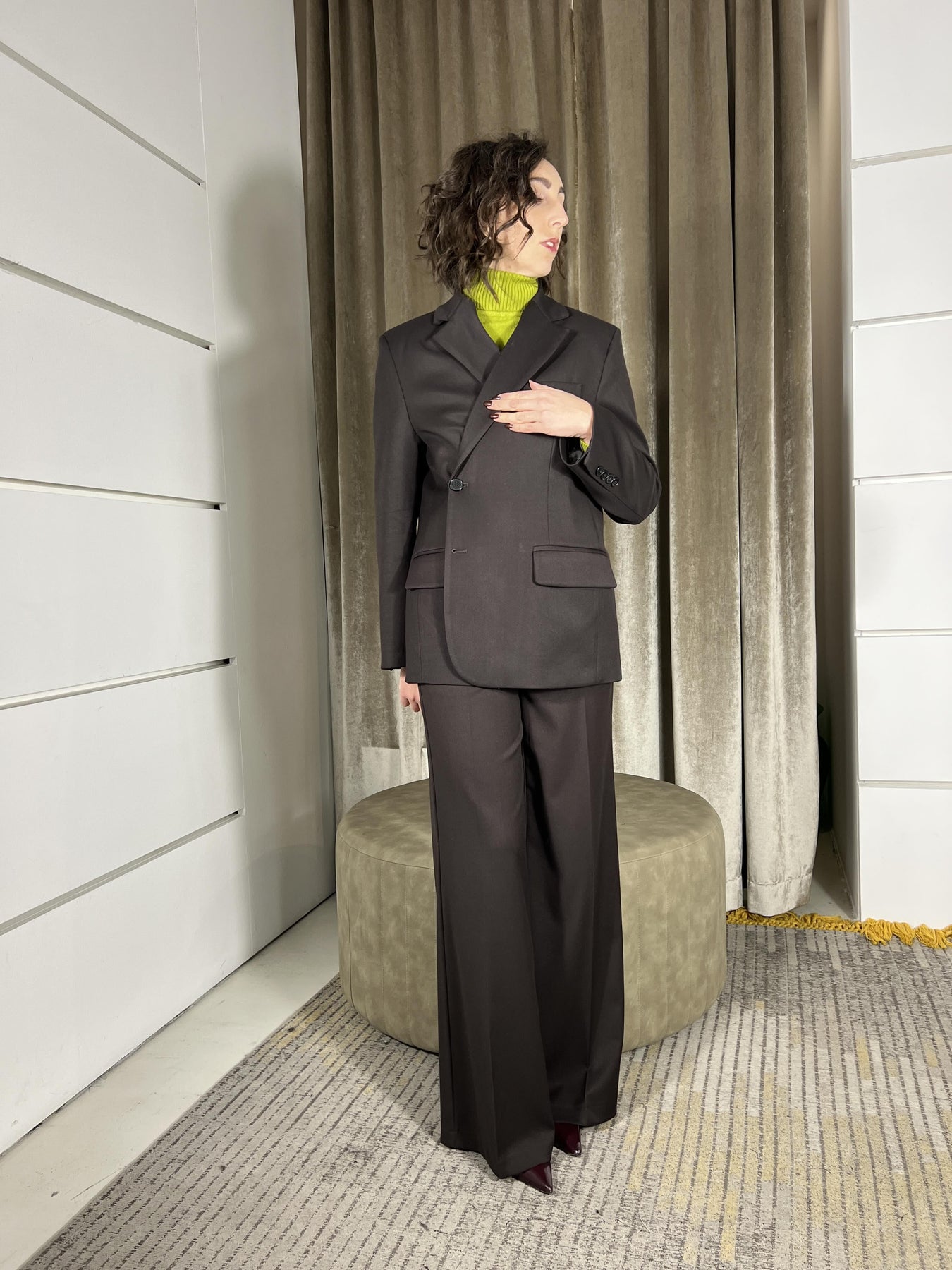 Pantalone Vicolo moro a palazzo con tasca a filo e tasca a patta nel retro, la modella indossa la xs ed è alta 172cm, veste abbondante per essere di Vicolo