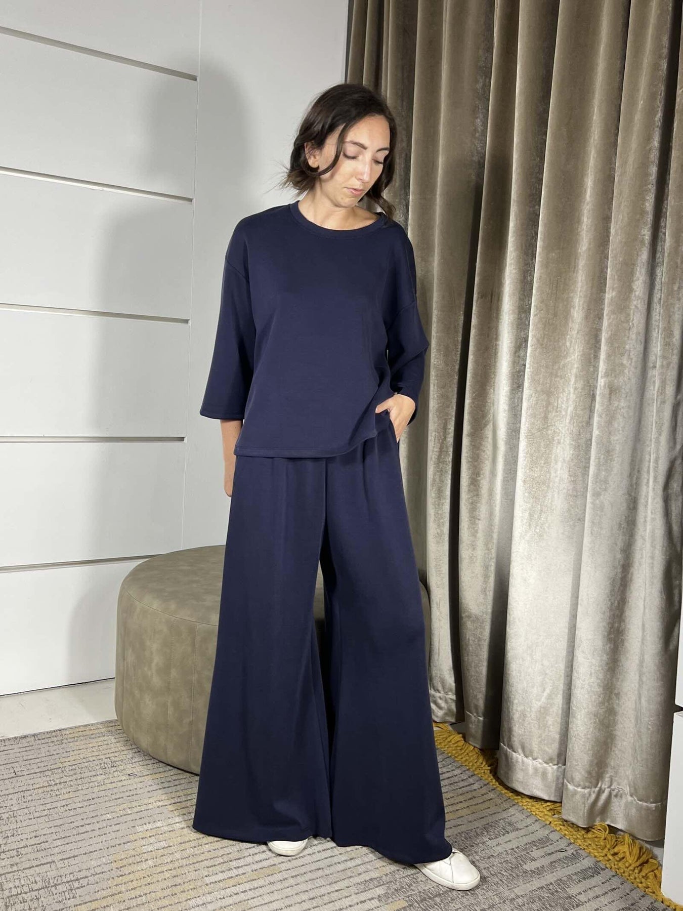Completo blu Susy Mix t-shirt e pantalone ampio con elastico in vita. Veste da una 38 a una 46. Composizione 50%vi 47%pl 3%ea blu