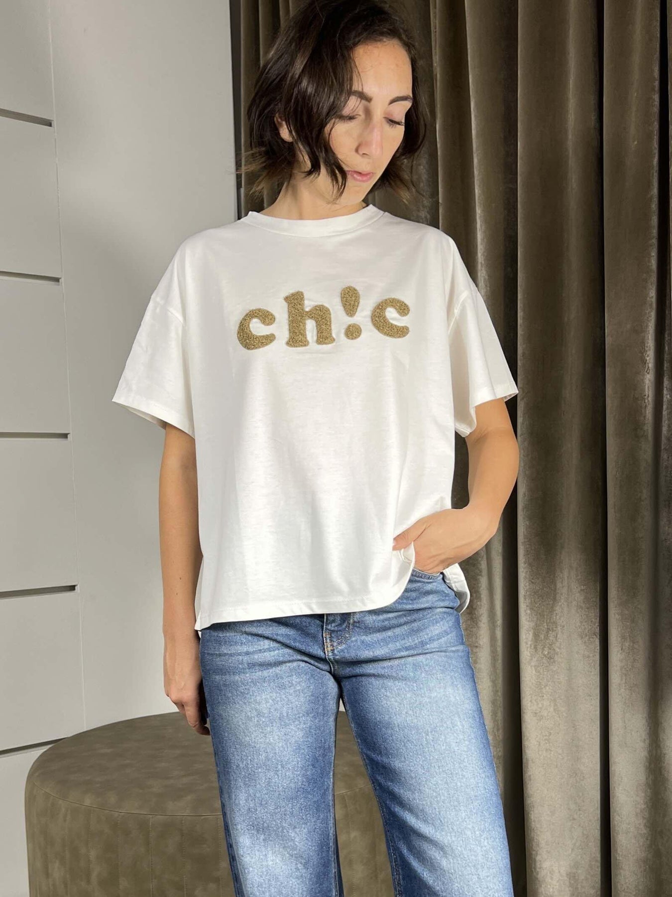 T-shirt Susy Mix bianca con scritta chic a orsetto, manica corta, modello scatoletta. La modella è una 40 ed è alta 172cm. Veste da una 38 a una 44. Composizione 100%co