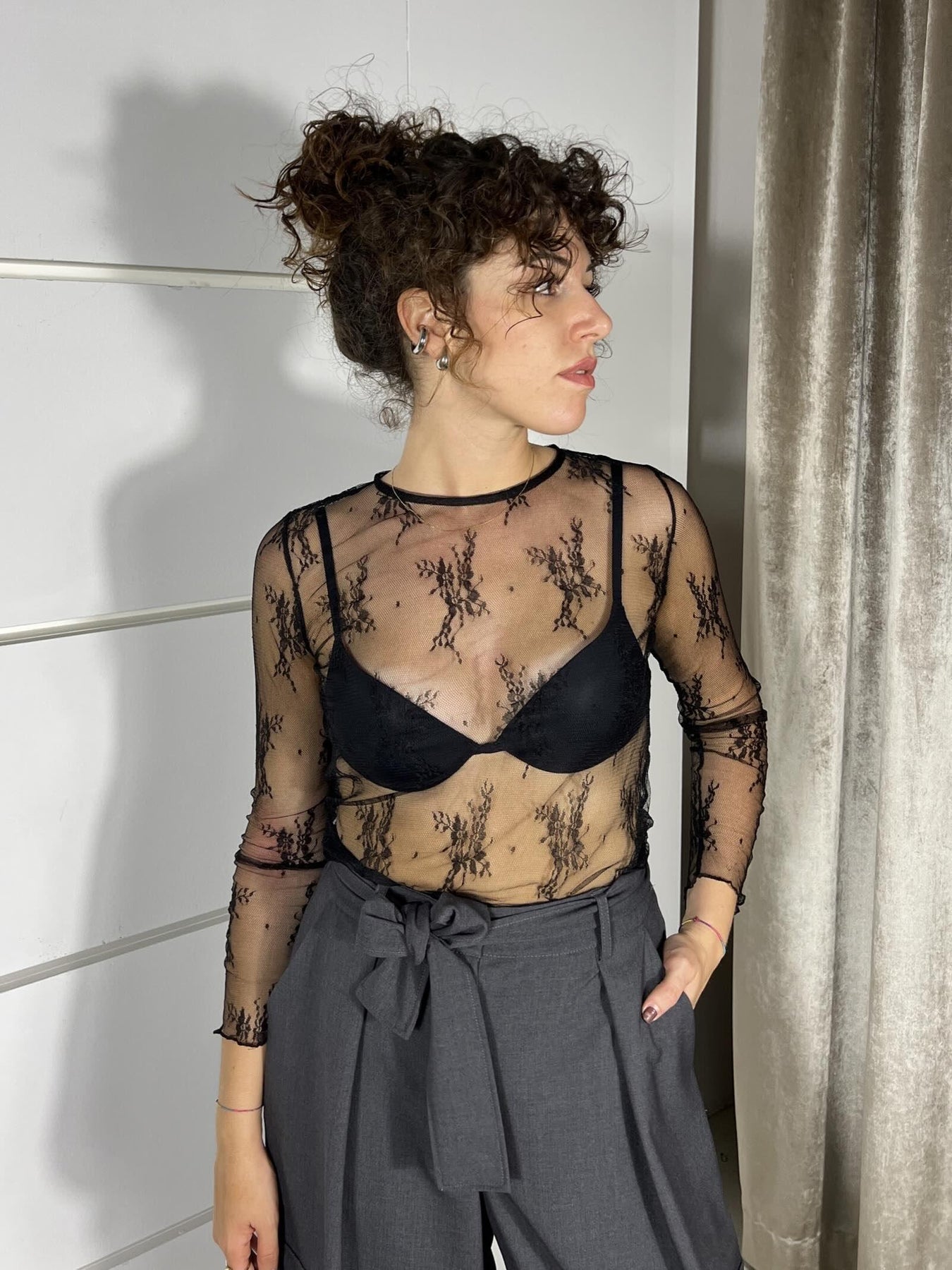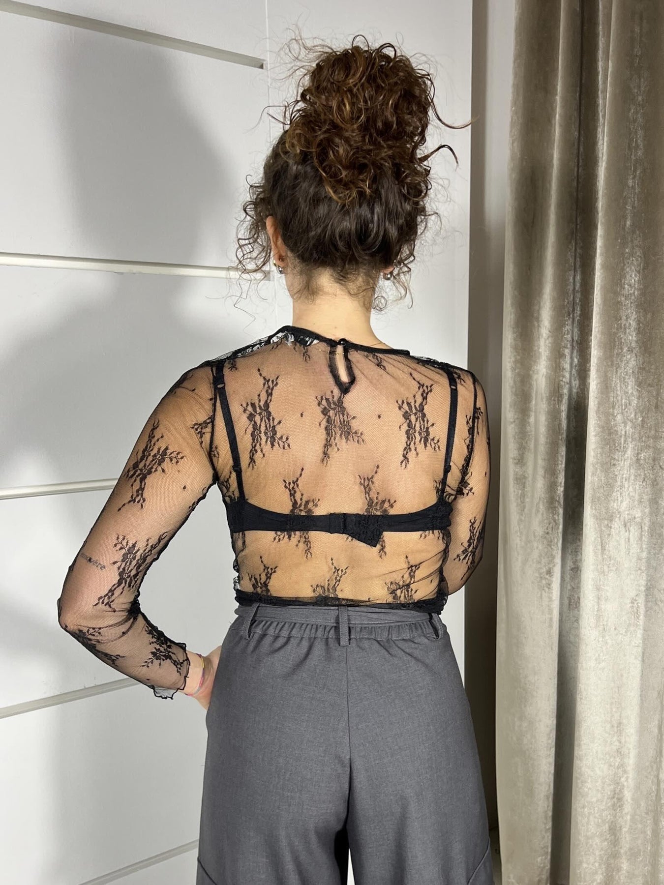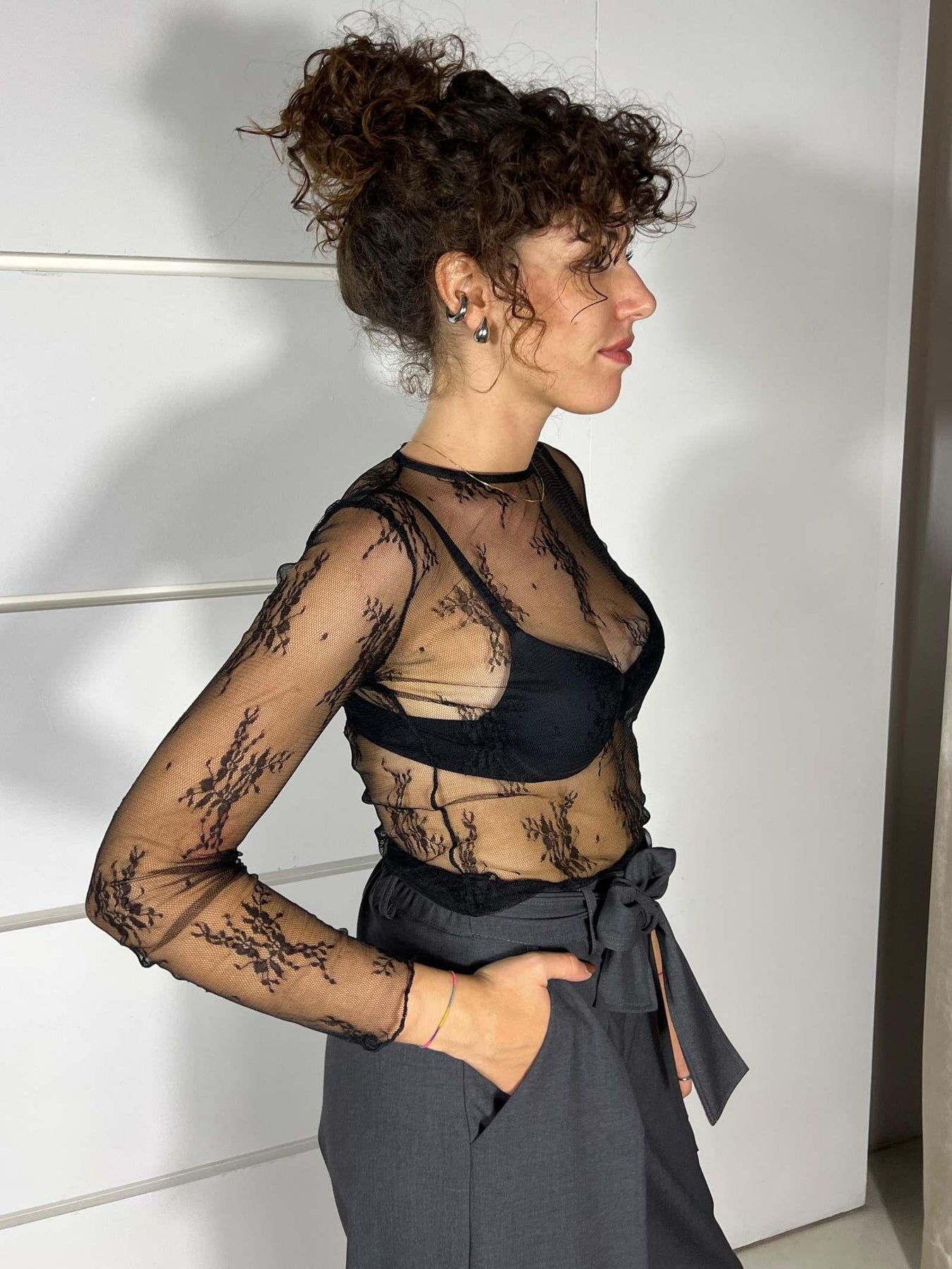 T-shirt Susy mix nera in pizzo elasticizzato, manica lunga, girocollo . Veste da una 38 a una 44. Composizione 90%ny 10%ea