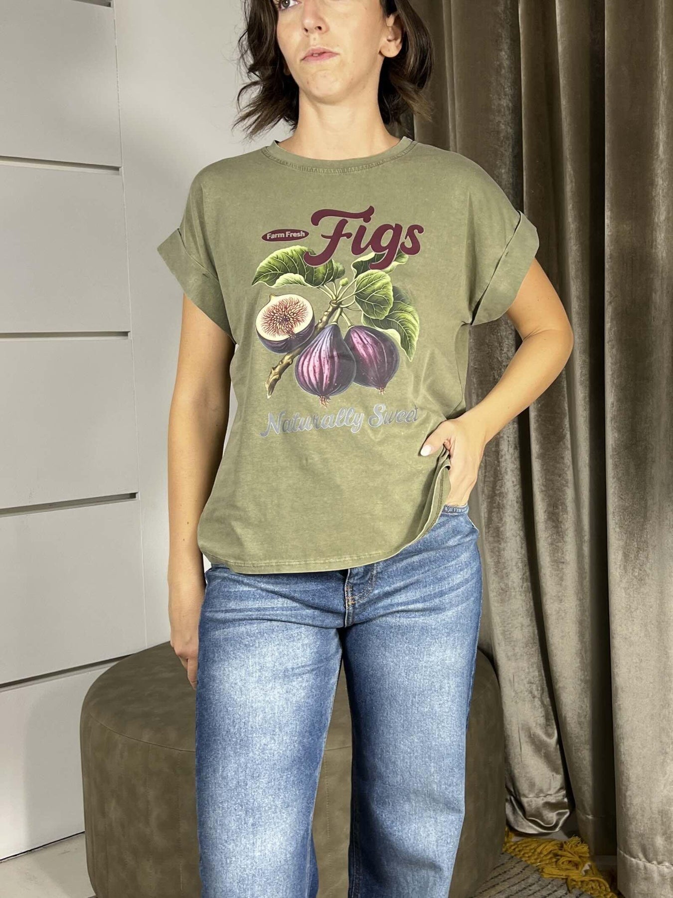 T-shirt Susy Mix verde militare con stampa fichi, manica cort. La modella è una 40 ed è alta 172cm. Veste da una 38 a una 44 Composizione 90%co 10%ea