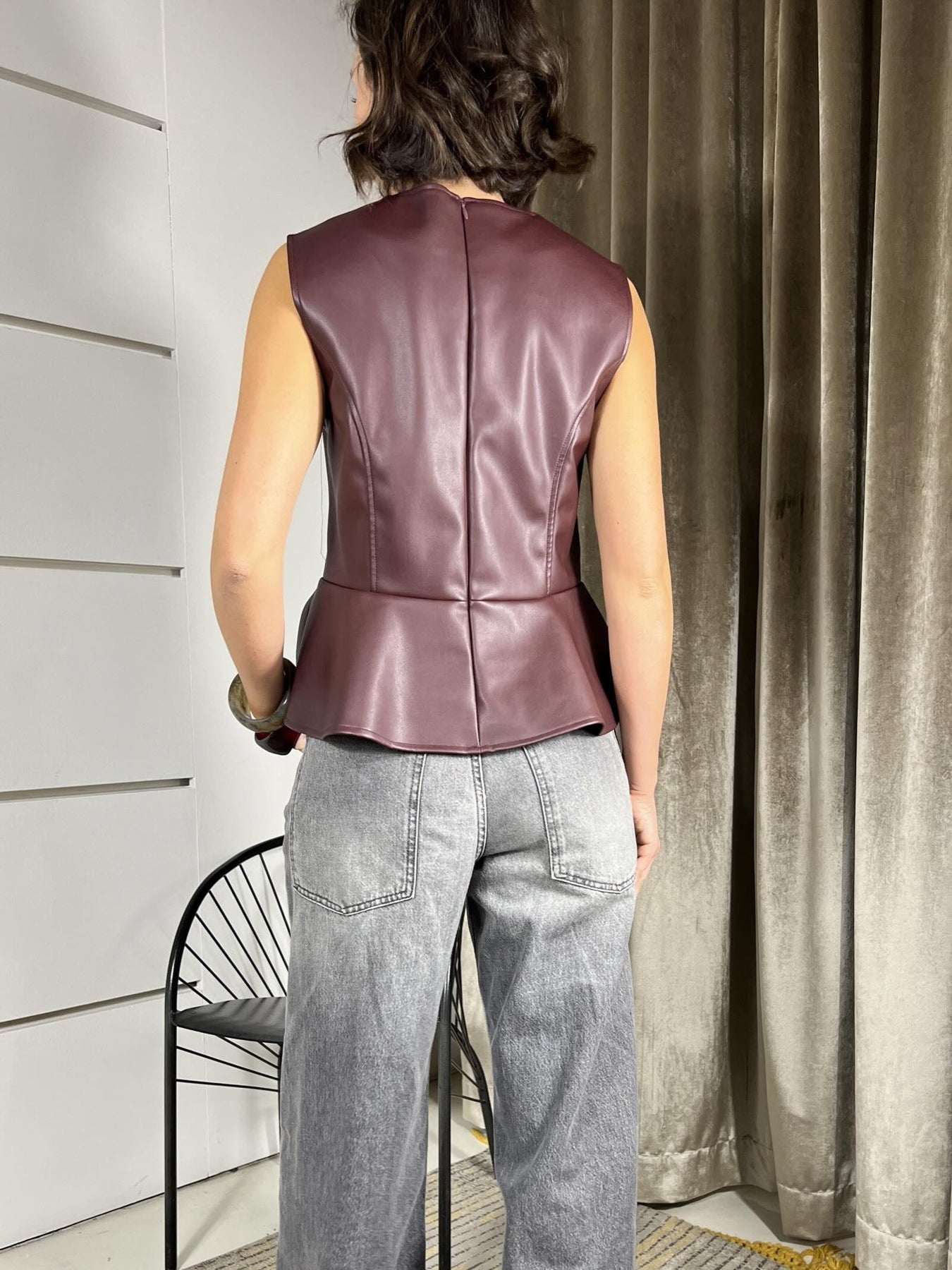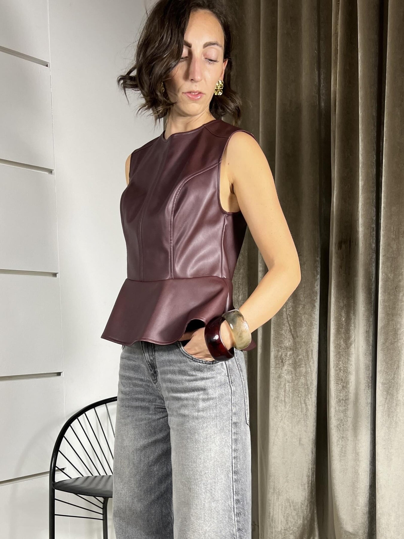 Top Susy Mix vino in ecopelle svasato nel fondo, smanicato. La modella indossa la s ed è alta 172cm. Composizione 100%pu 100%pl