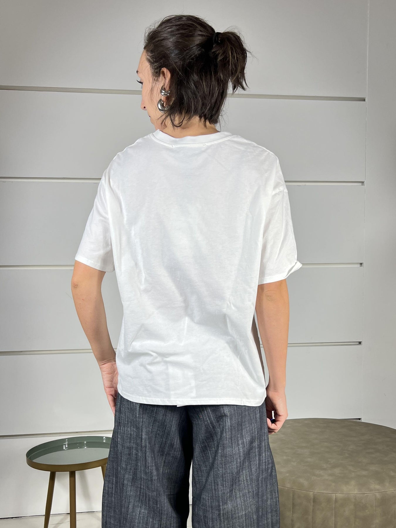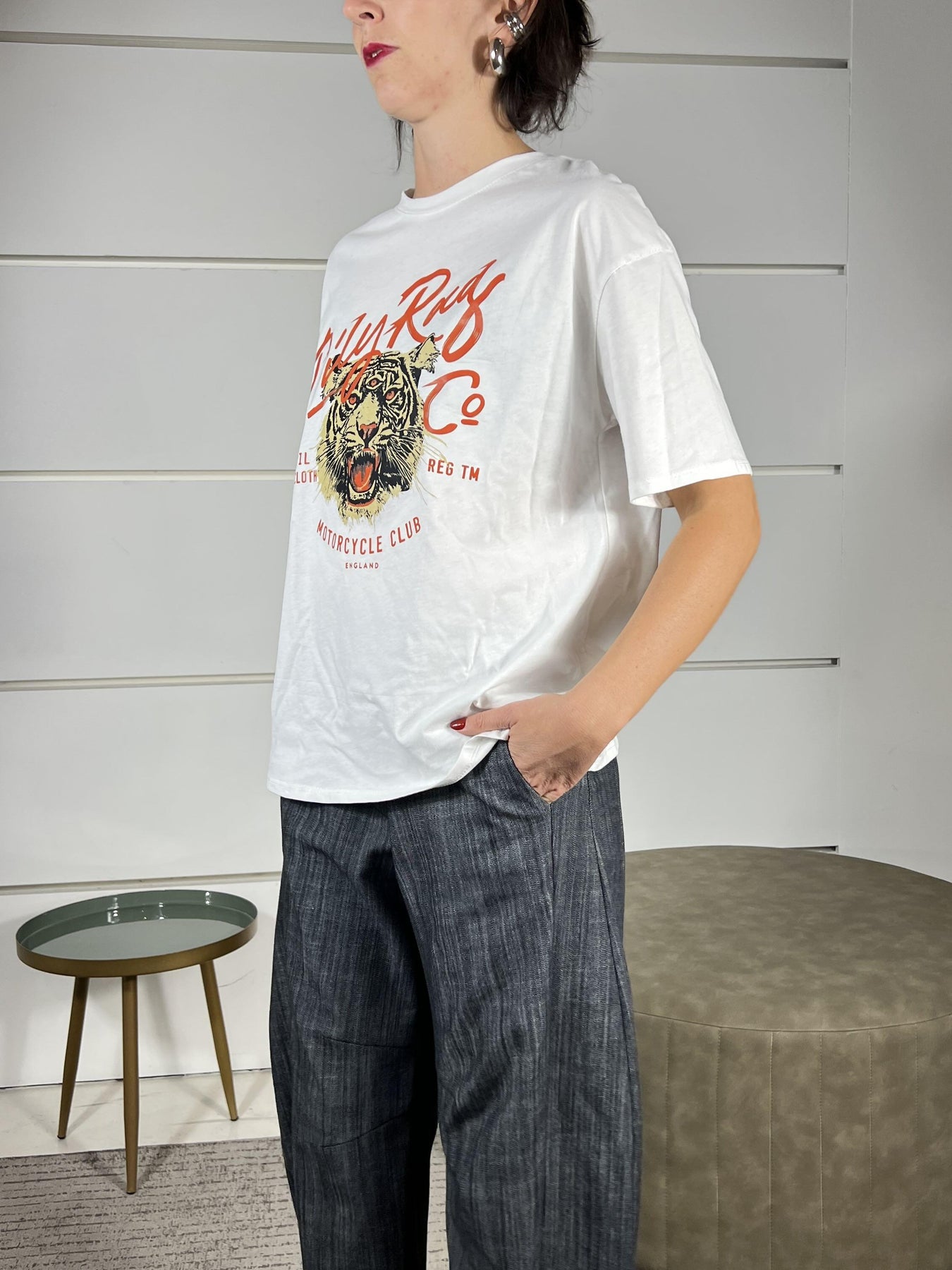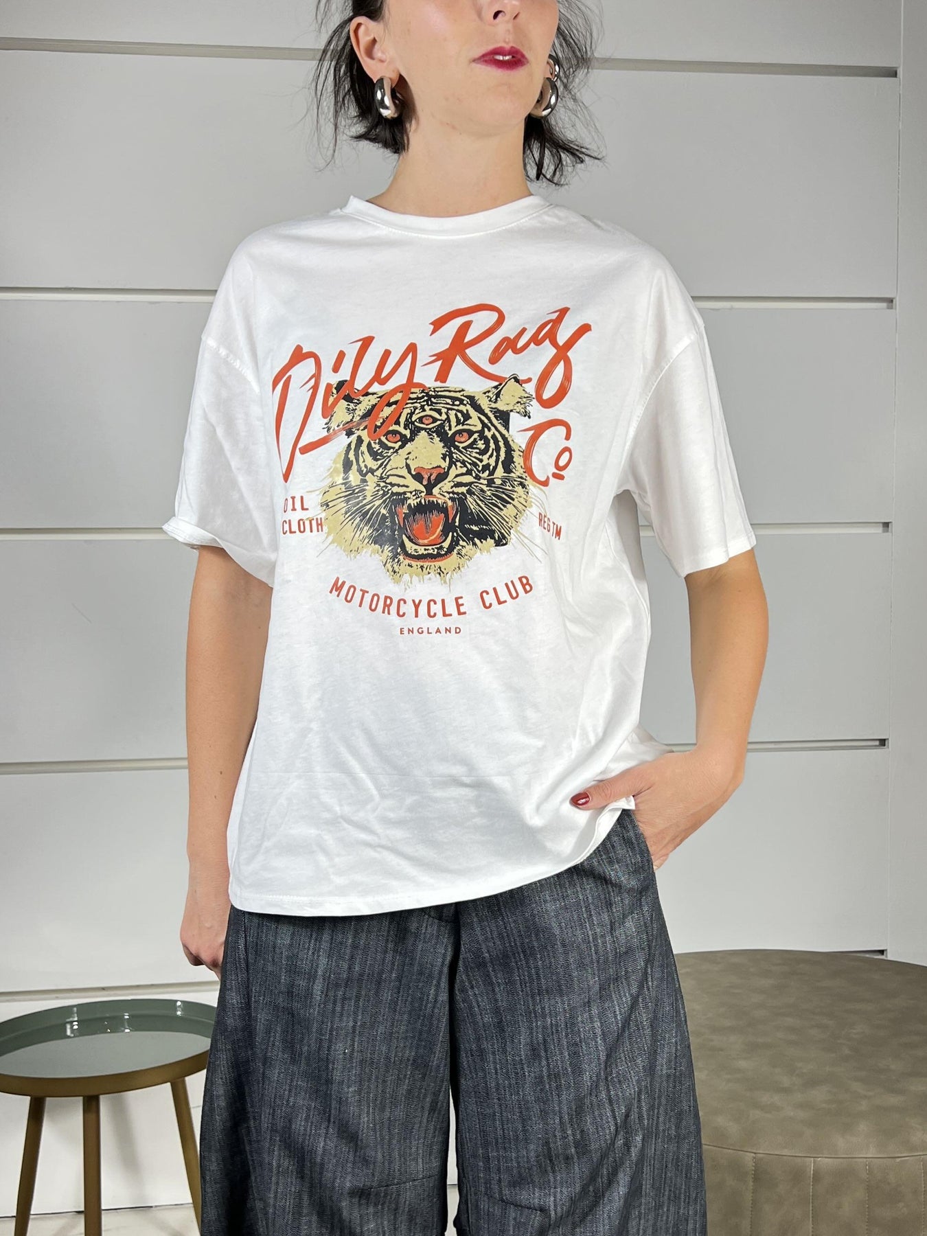 t-shirt HaveOne bianca con stampa tigre, girocollo, manica corta, la modella è una 40 ed è alta 172cm. Composizione 100%co