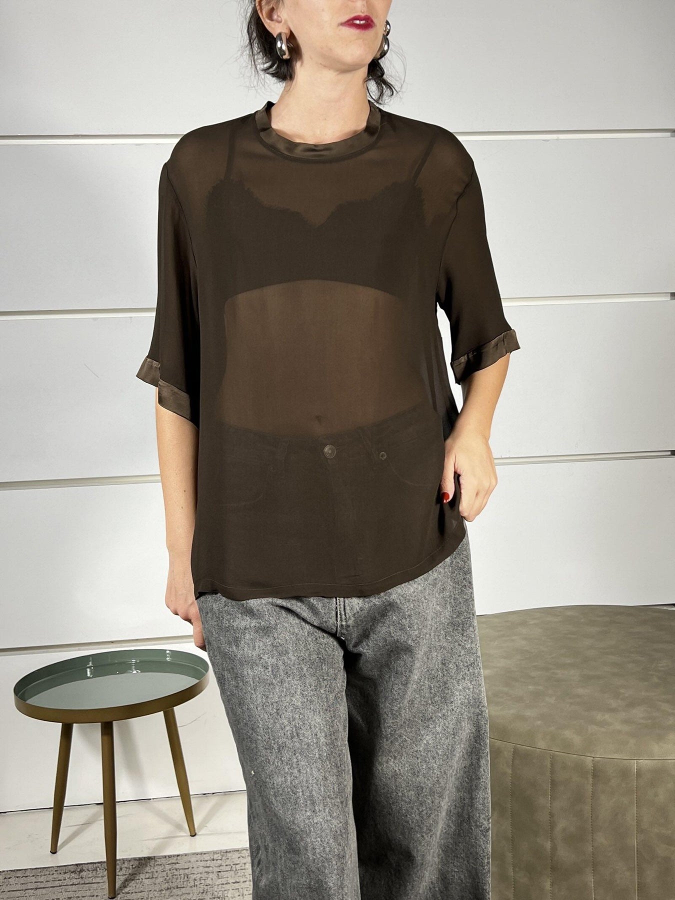 t-shirt HaveOne moro over manica corta con trasparenze e bordi in raso , la modella indossa la s ed è alta 172cm. Composizione e100%vi + 97%vi 3%el