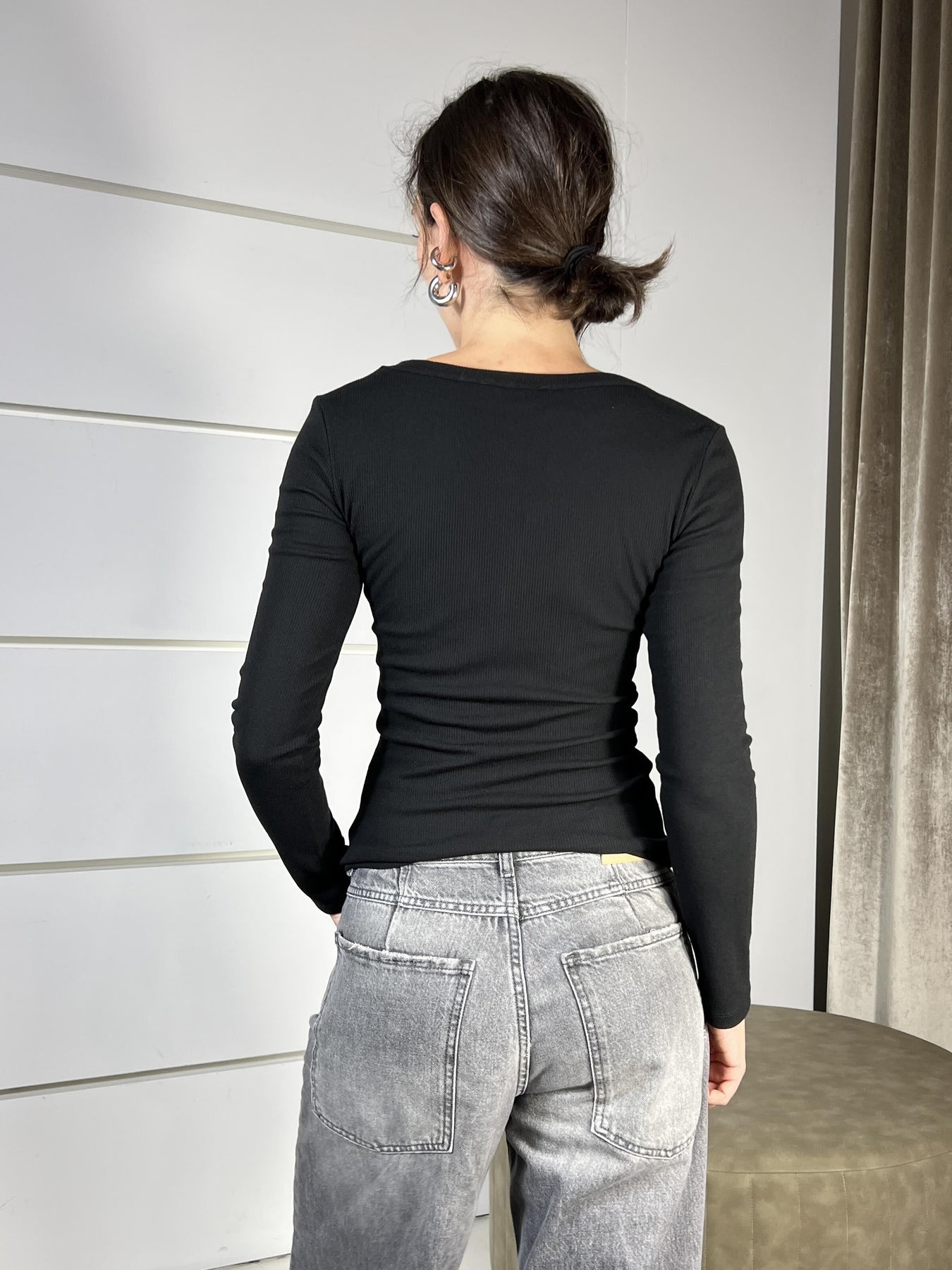 T.shirt Vicolo scollo a v manica lunga a costine.La modella indossa la s ed è alta 172cm. Composizione 62%pl 34%vi 4%ea