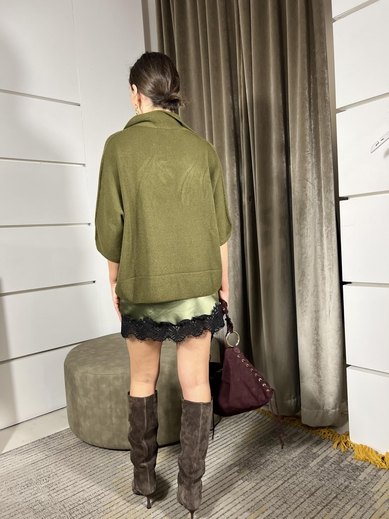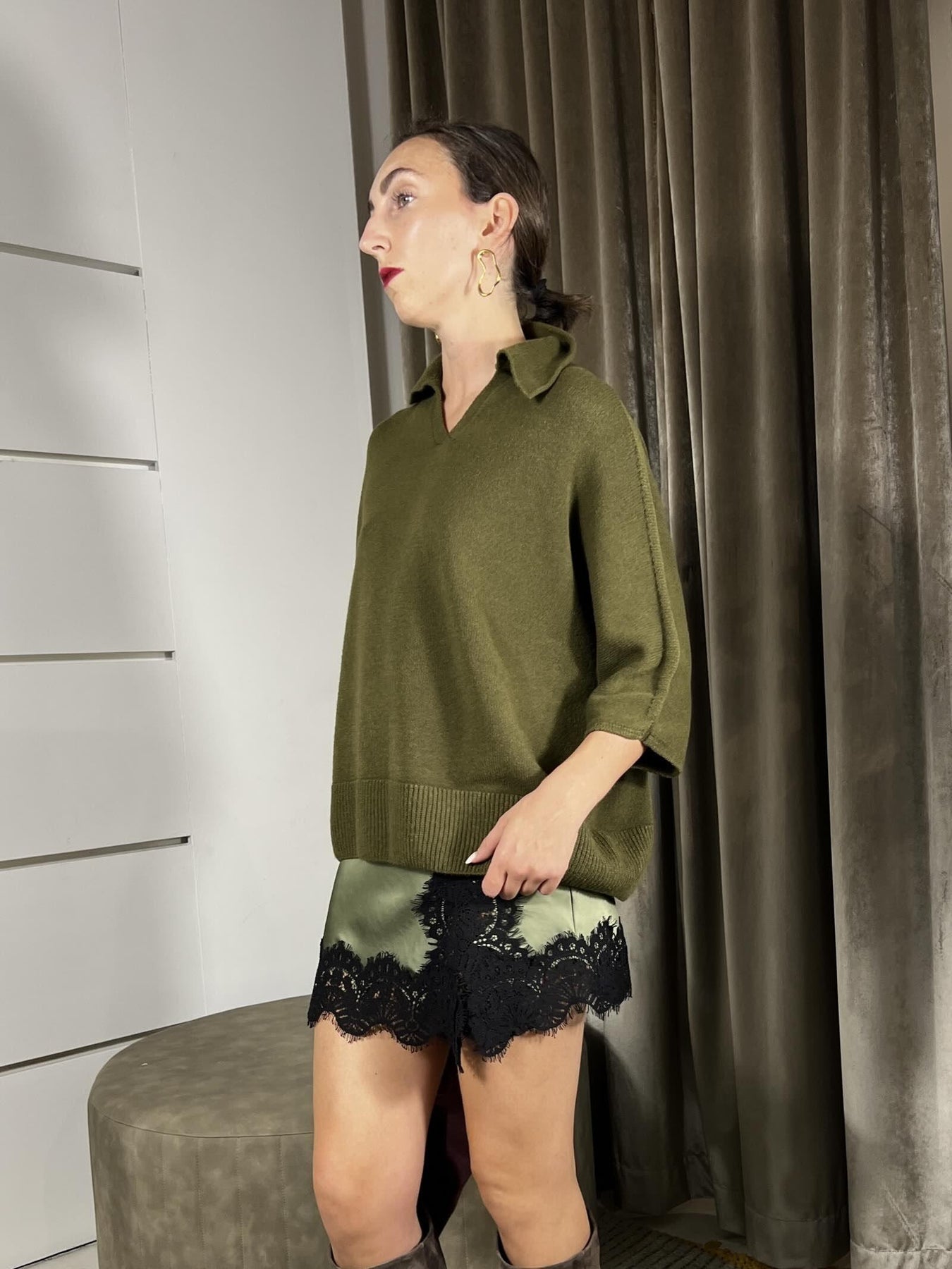 Maglione Tensione In olio a polo, modello over, manica corta in misto viscosa. la modella è una 40 ed è alta 172cm