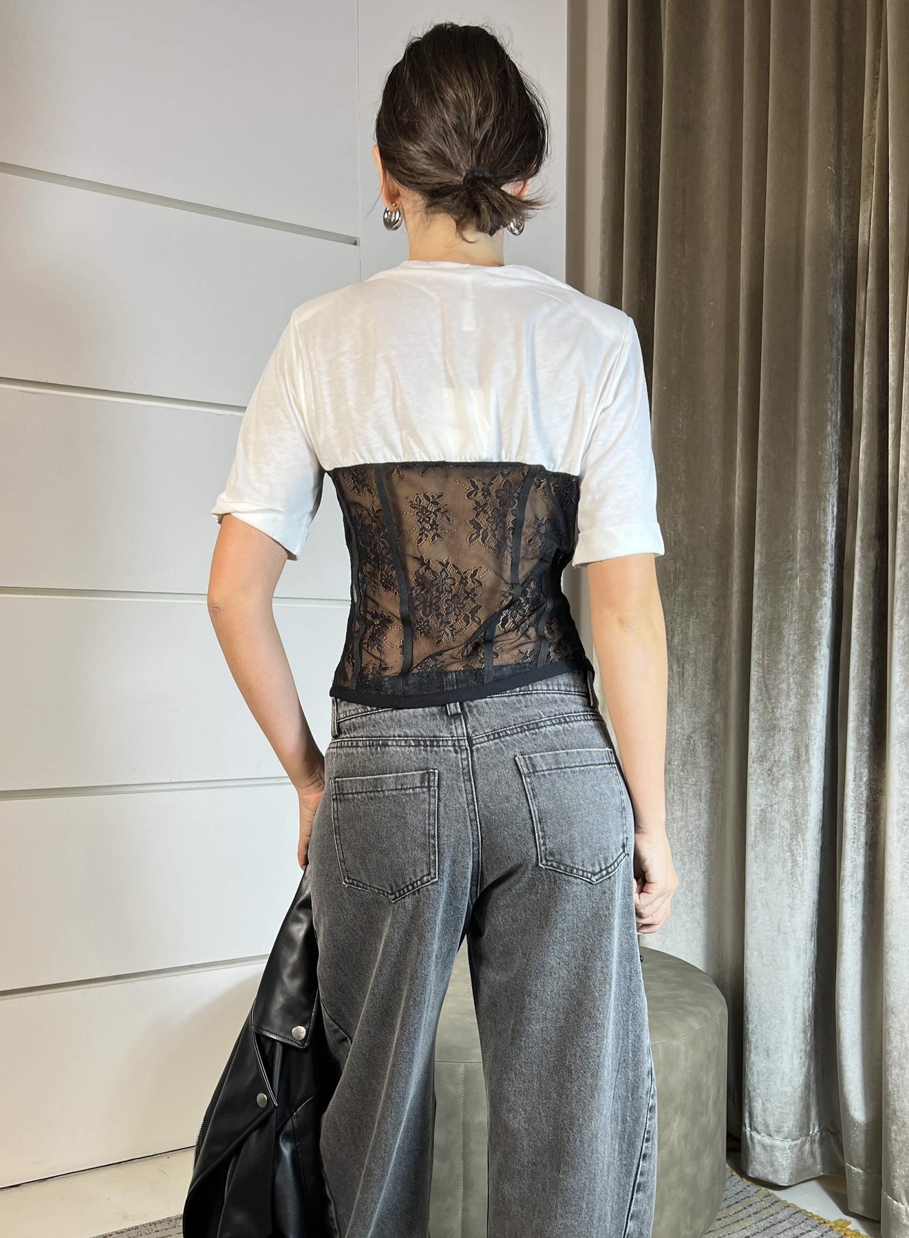 T-shirt Tensione In bianca manica corta con corpetto in pizzo nero. La modella indossa la s ed è alta 172cm.