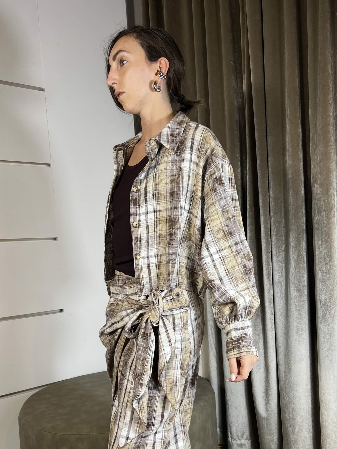 Camicia Vicolo a scacchi effetto vintage, taglio vivo, volendo si abbina alla gonna. La modella è alta 172cm ed è una 40. Composizione 75%pl 25%co