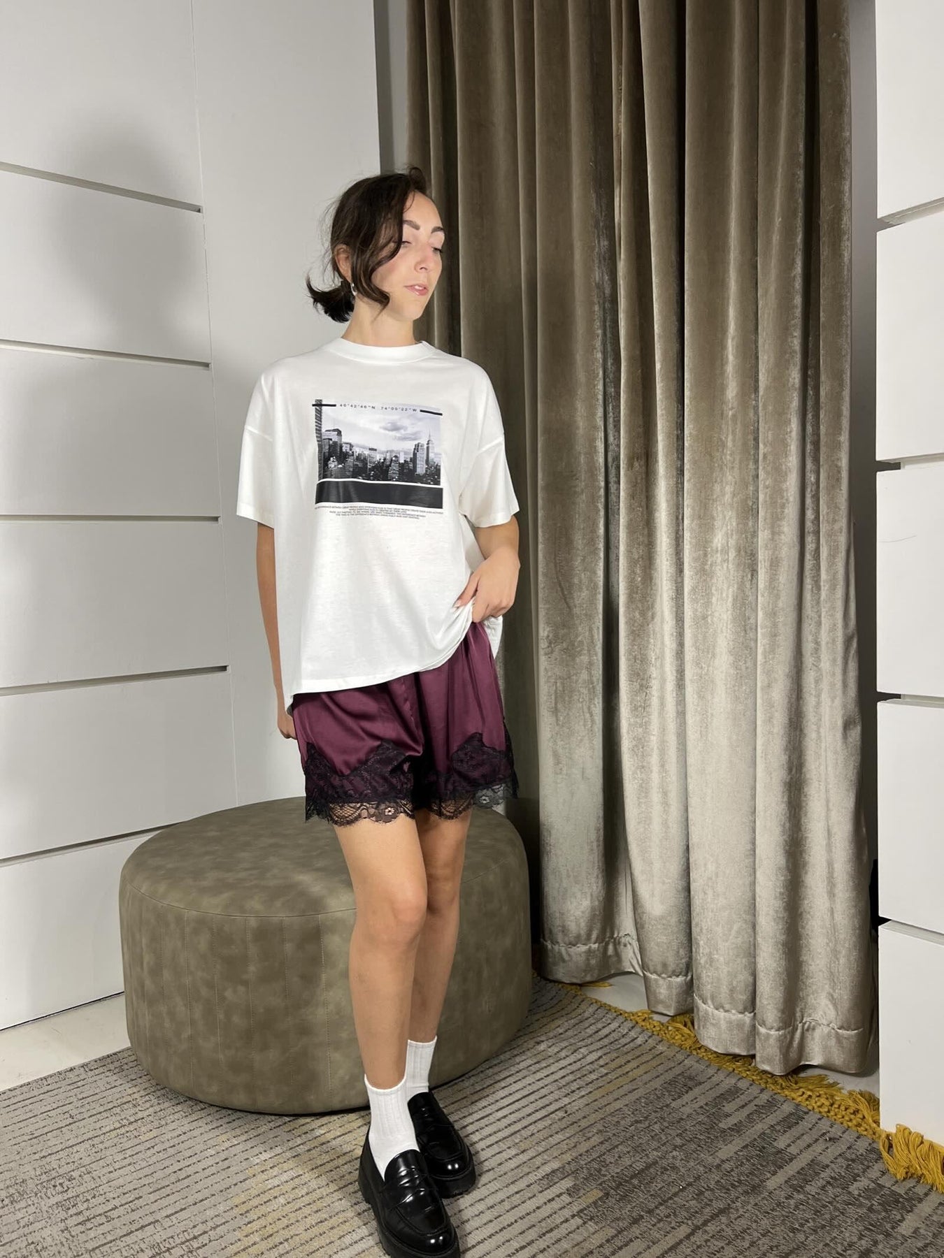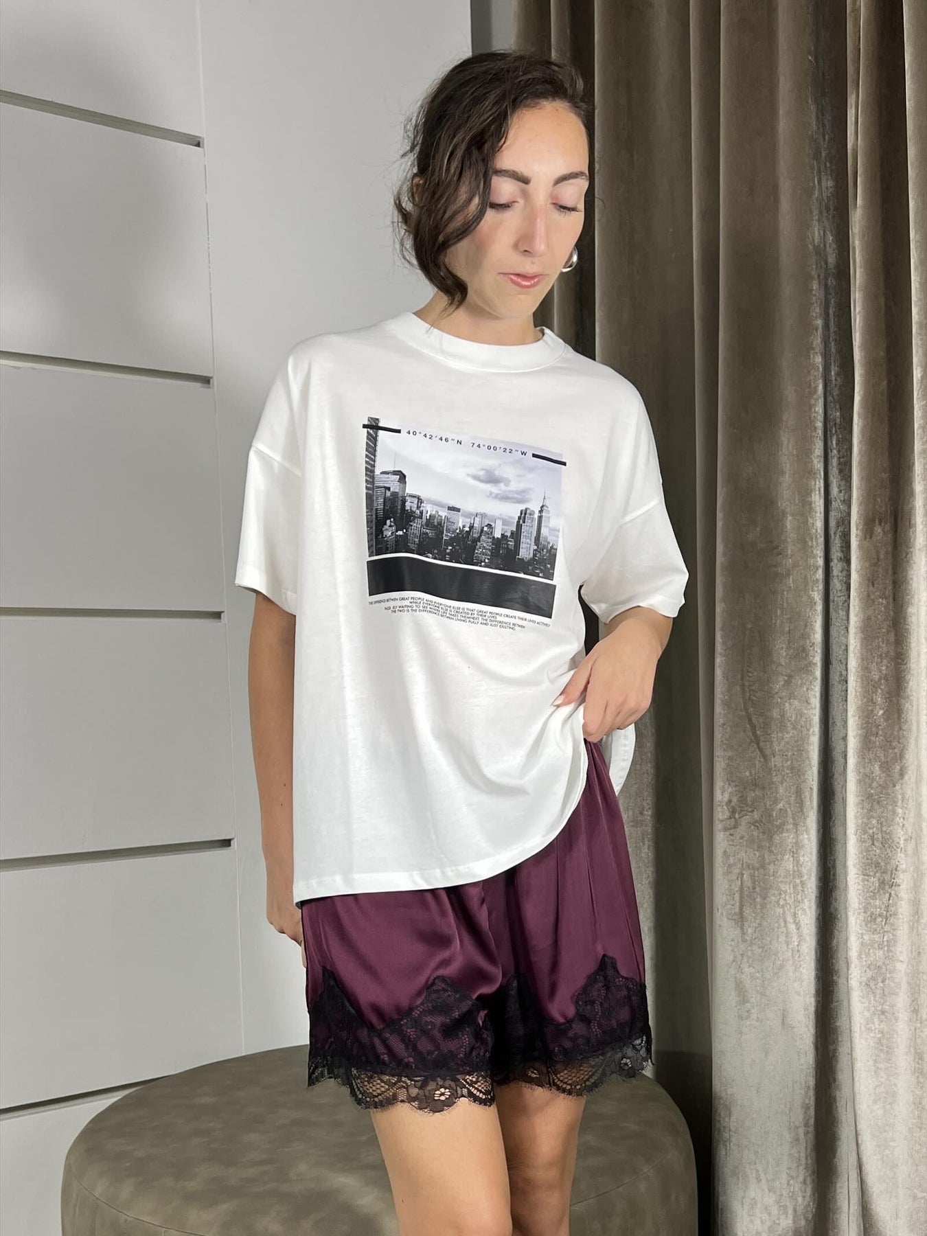 T-shirt Vicolo con stampa edifici nyc, bianca e nera, modello over. La modella è una 40 ed è alta 172cm, veste da una 38 a una 46. Composizione 100%co