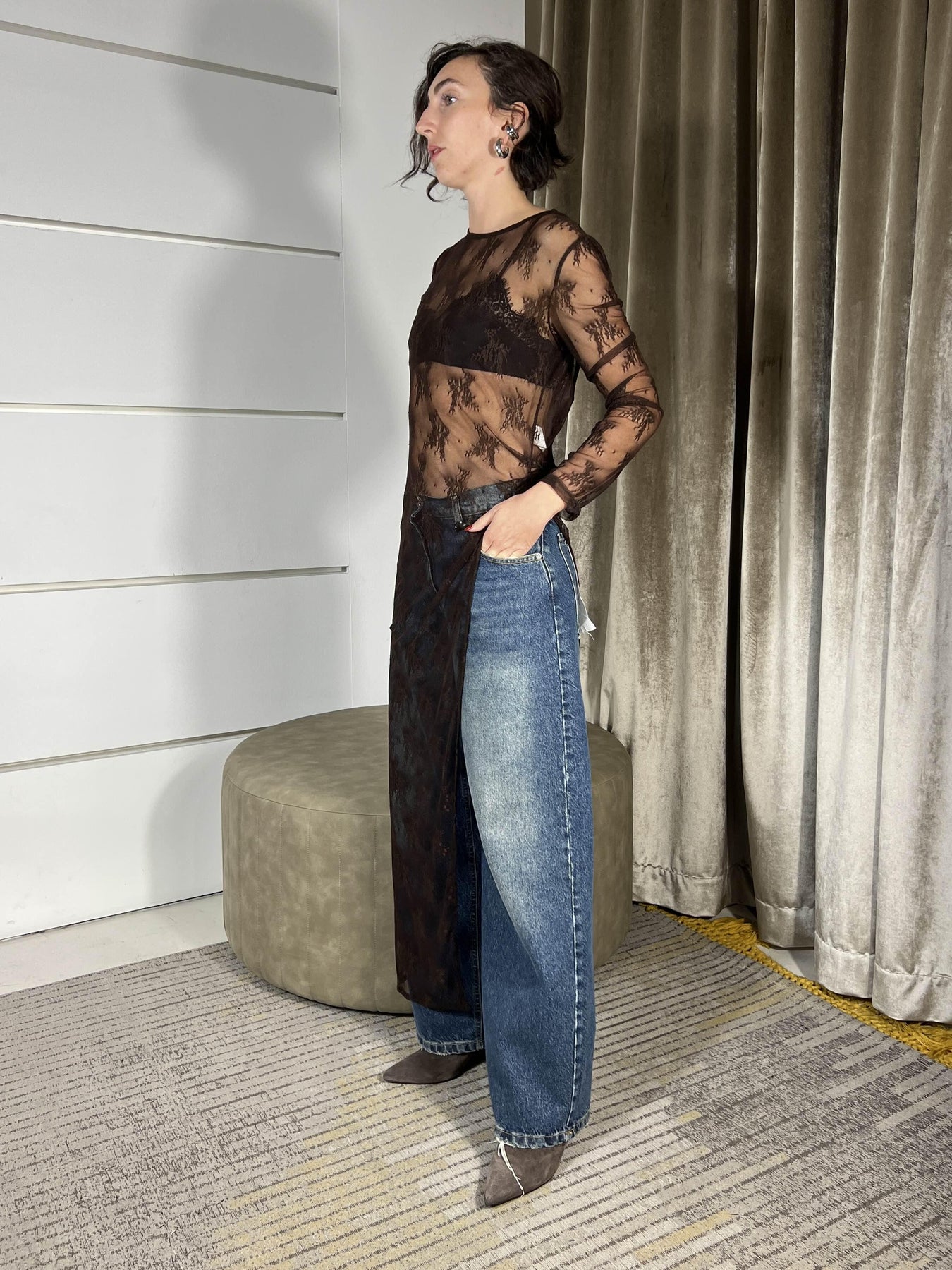 abito Tensione In moro manica lunga, lungo in pizzo elasticizzato con spacco alato, la modella è una 40 e indossa la s, è alta 172cm. Composizione m. viscosa