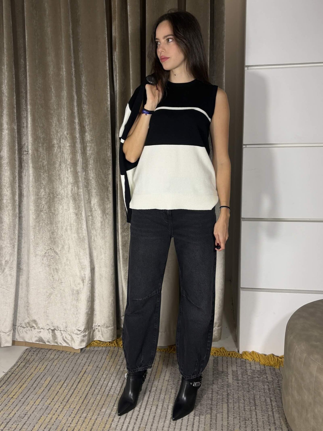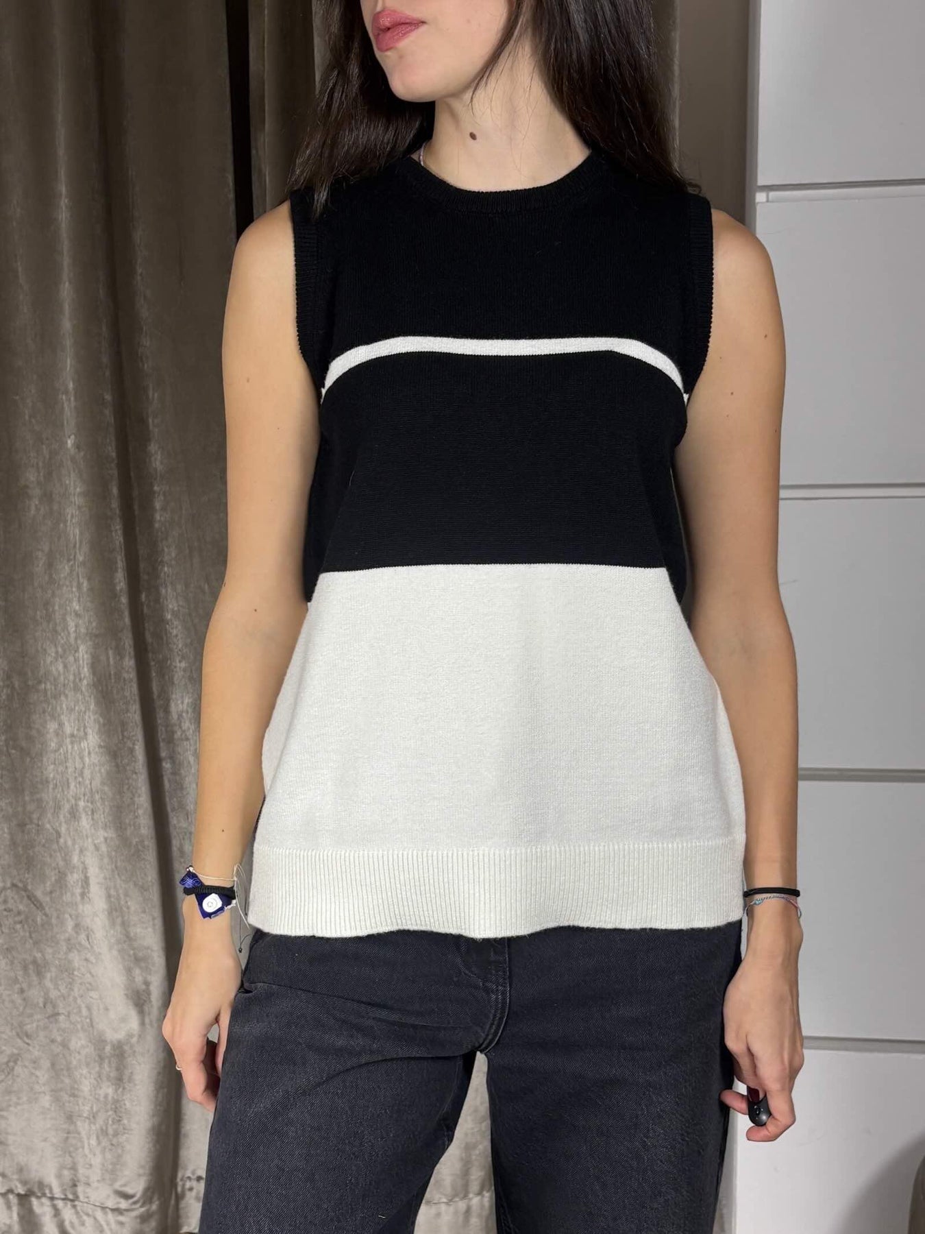 Canotta Carla G. a spalla larga, in viscosa elasticizzata a righe bianco e nero. Fit morbido. La modella indossa la tg. 40 ed è alta 1,72 m. Composizione: 51% vi 31% pl 18% pa.