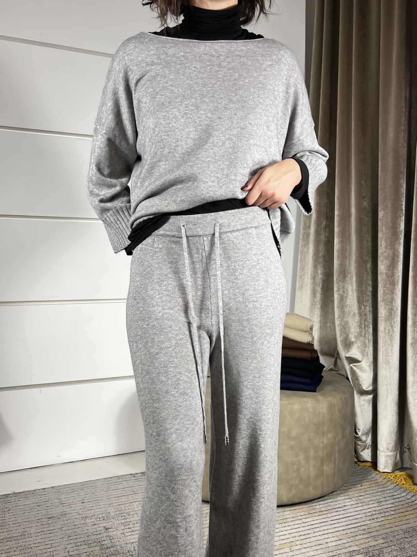 completo Susy Mix grigio maglione e pantalone a palazzo con elastico in vita e coulisse, in calda viscosa , veste da una 38 a una 46, la modella è una 40 ed è alta 172cm, . Composizone 50%vi 28%pl 22%pa