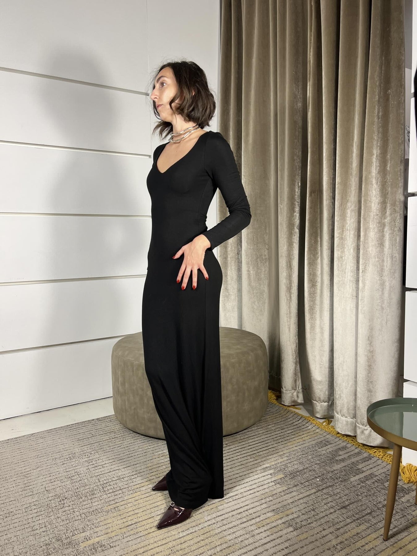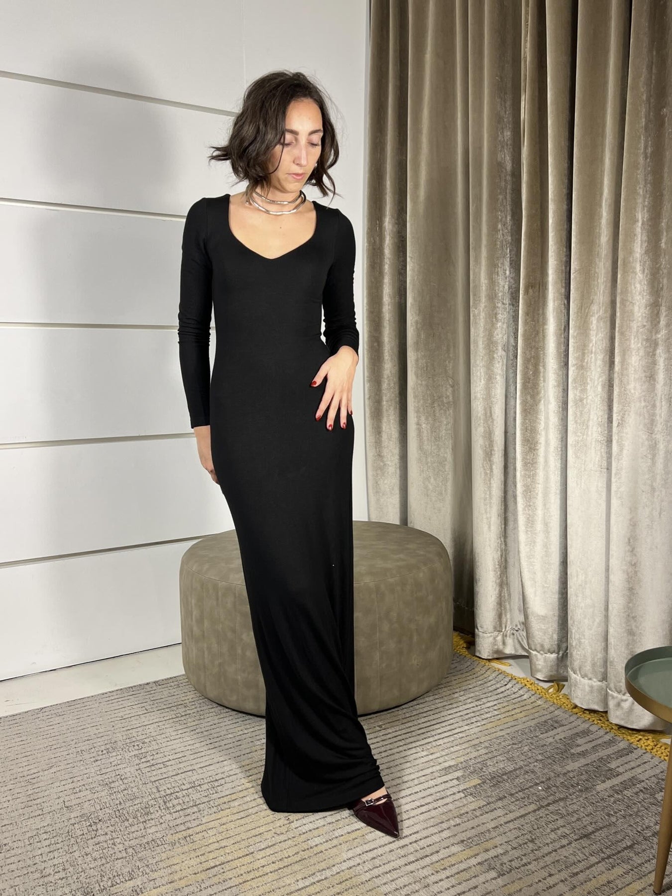 Abito HaveOne nero lungo aderente con scollo quadrato e coppe. La modella indossa la taglia s ed è alta 172 . Composizione 92%vi 8%ea