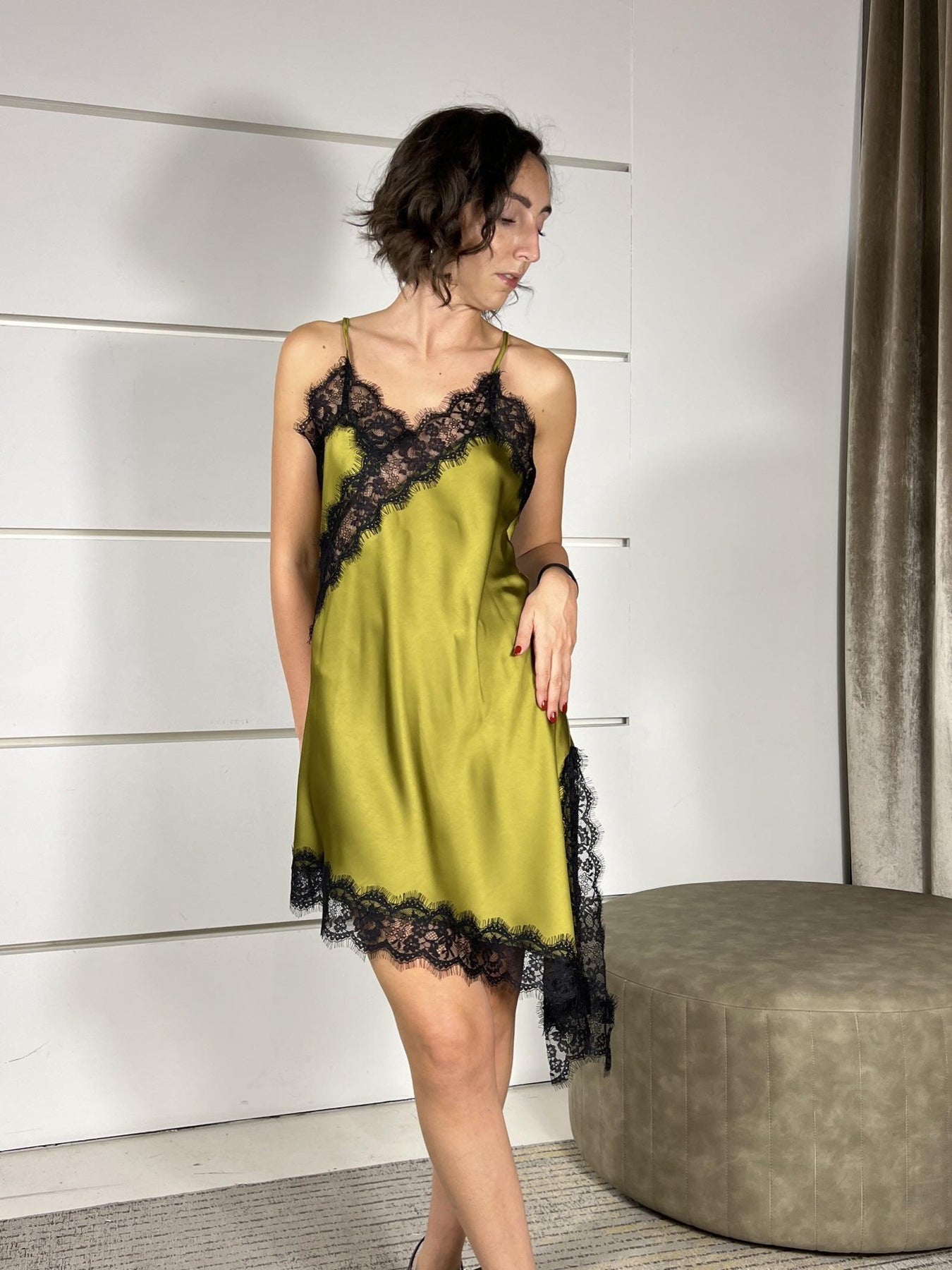 Abito Vicolo olio con fondo asimmetrico in pizzo nero, in viscosa. la modella indossa la s ed è alta 172cm. Composizione 100%vi