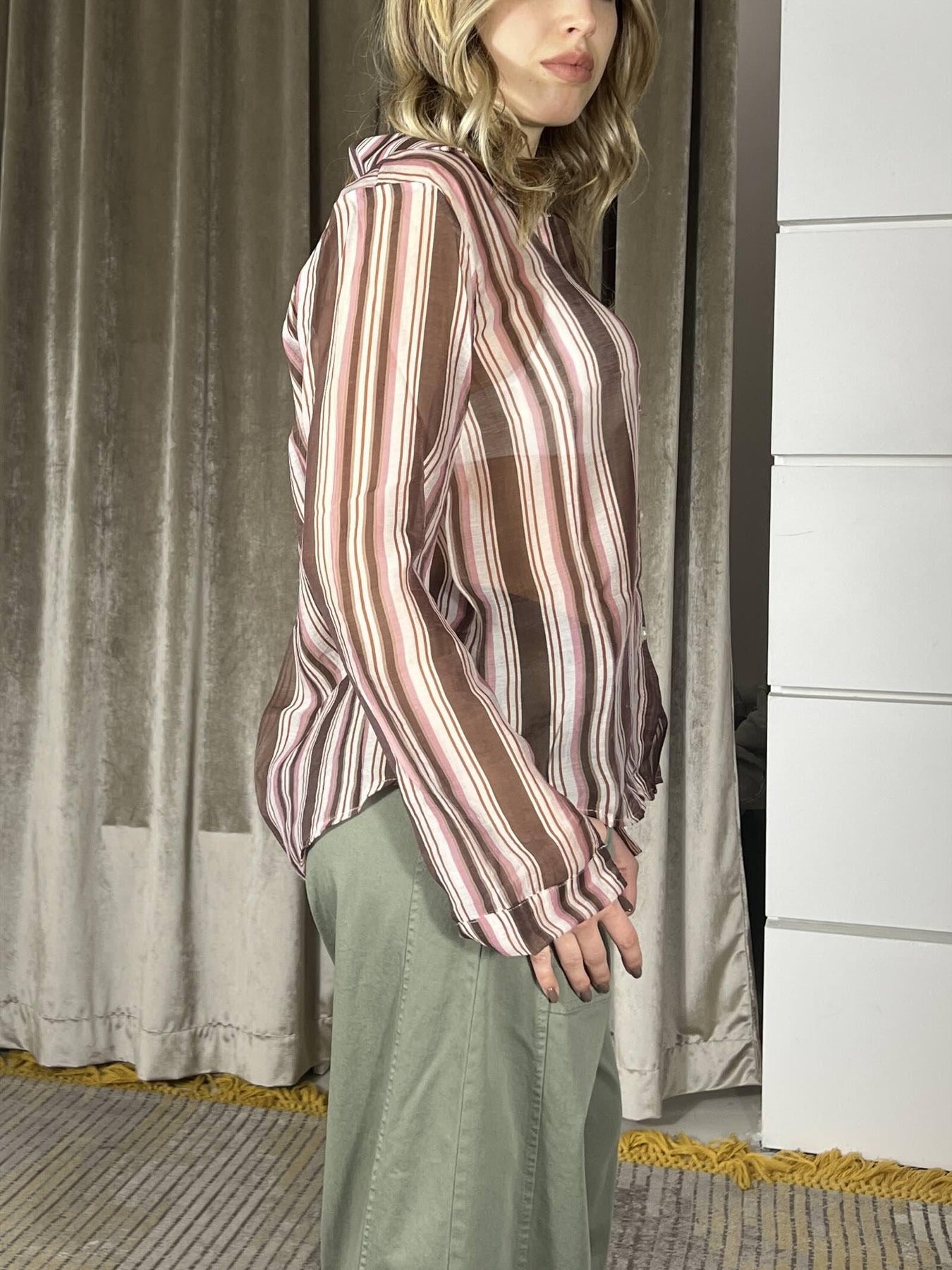 Camicia Susy Mix a righe manica lunga moro, rosa, coccio, panna e beige, con semi trasparenza. La modella è alta 170 cm ed è una 40, indossa taglia S. Composizione: 87%tn 13%ny