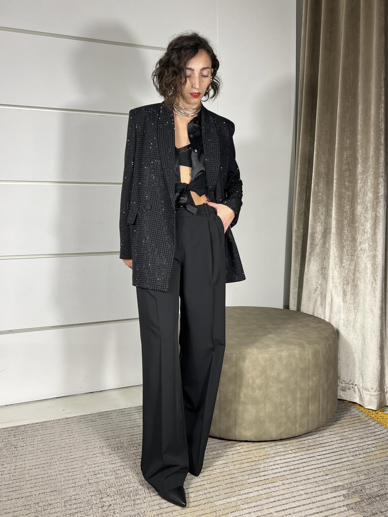 Camicia Pinko nera con trasparenze e dettaglio cut out nel collo, inserti satin, La modella indossa la 40 ed è alta 172cm. Composizione ES1 - 1° Tessuto Esterno: 94%PL 6%EA - ES2 - 2° Tessuto Esterno: 100%PL