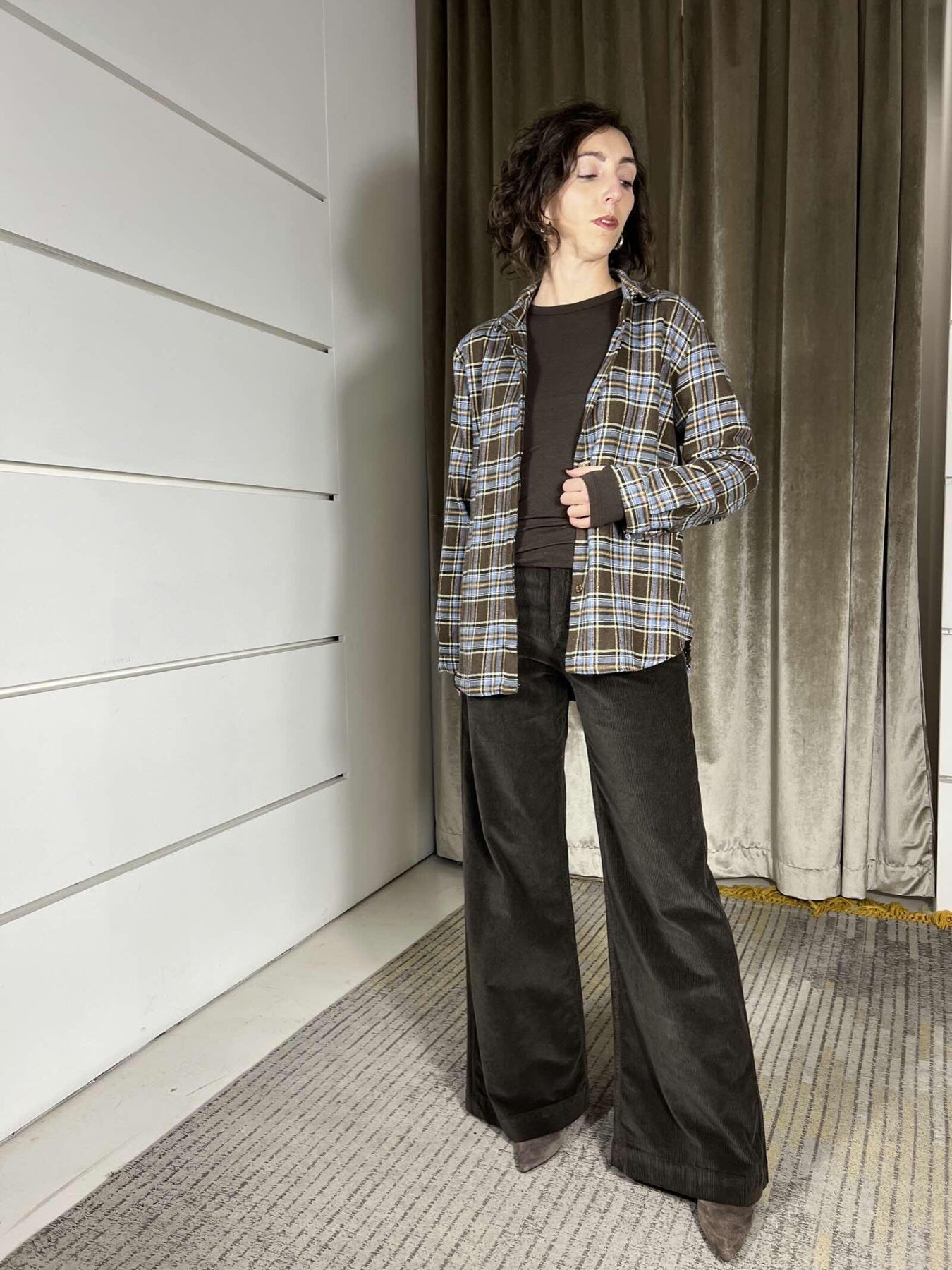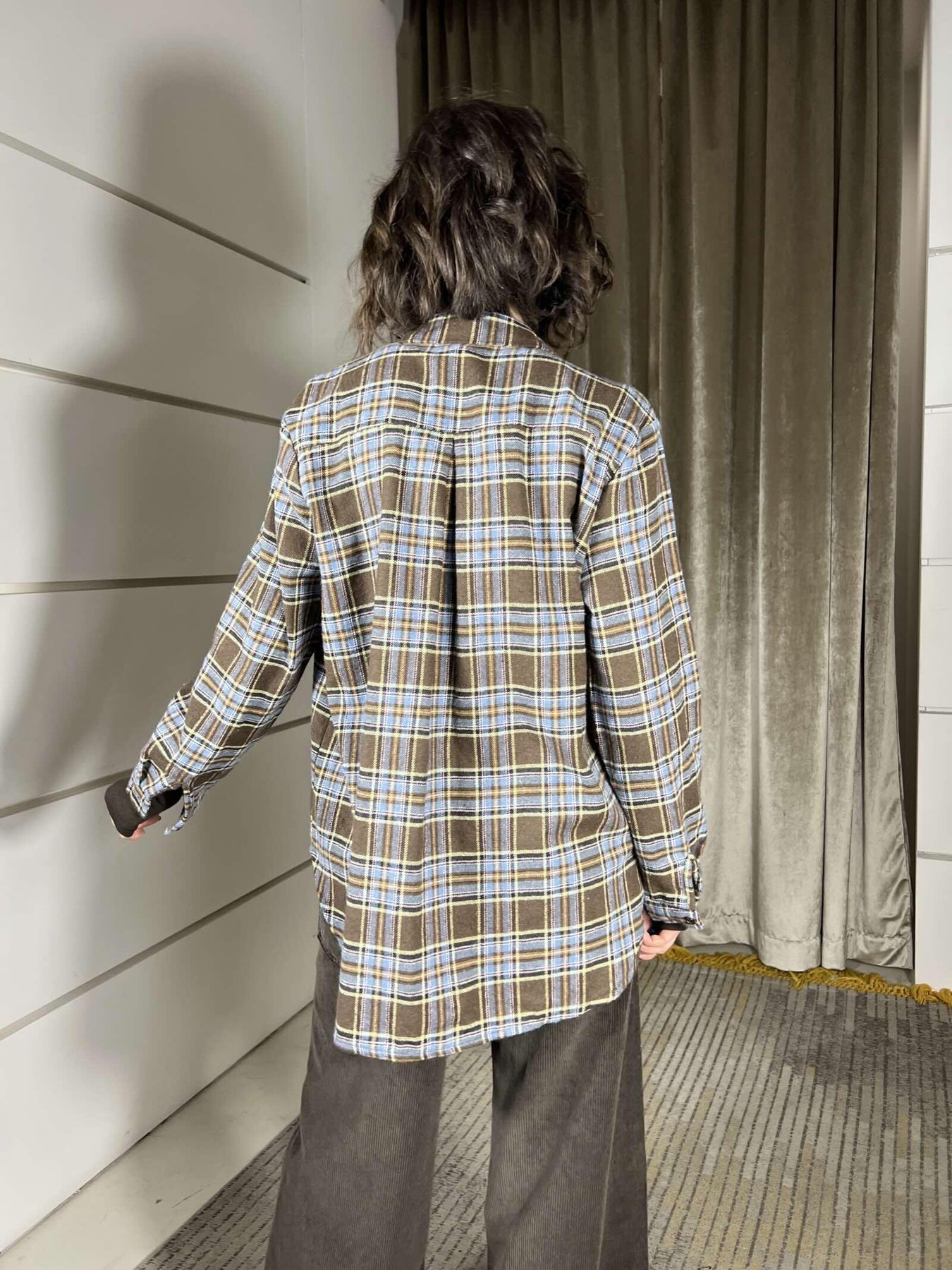 camicia HaveOne moro e celeste, a quadri , modello over, la modella è alta 172cm ed è una 40. Composizione 80%pl 20%co