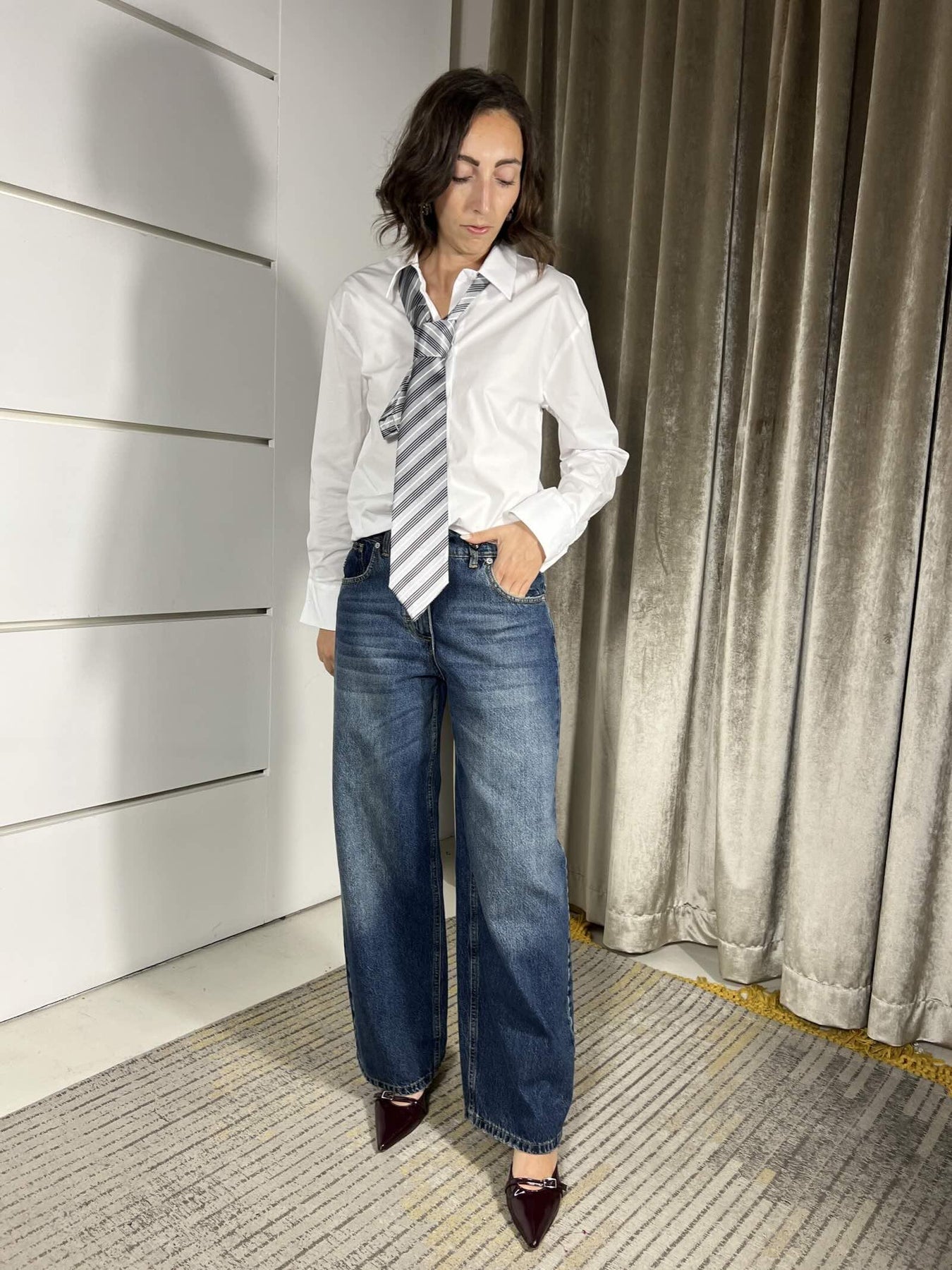 Camicia Tensione In bianca con cravatta, in misto cotone. La modella indossa la s ed è alta 172cm
