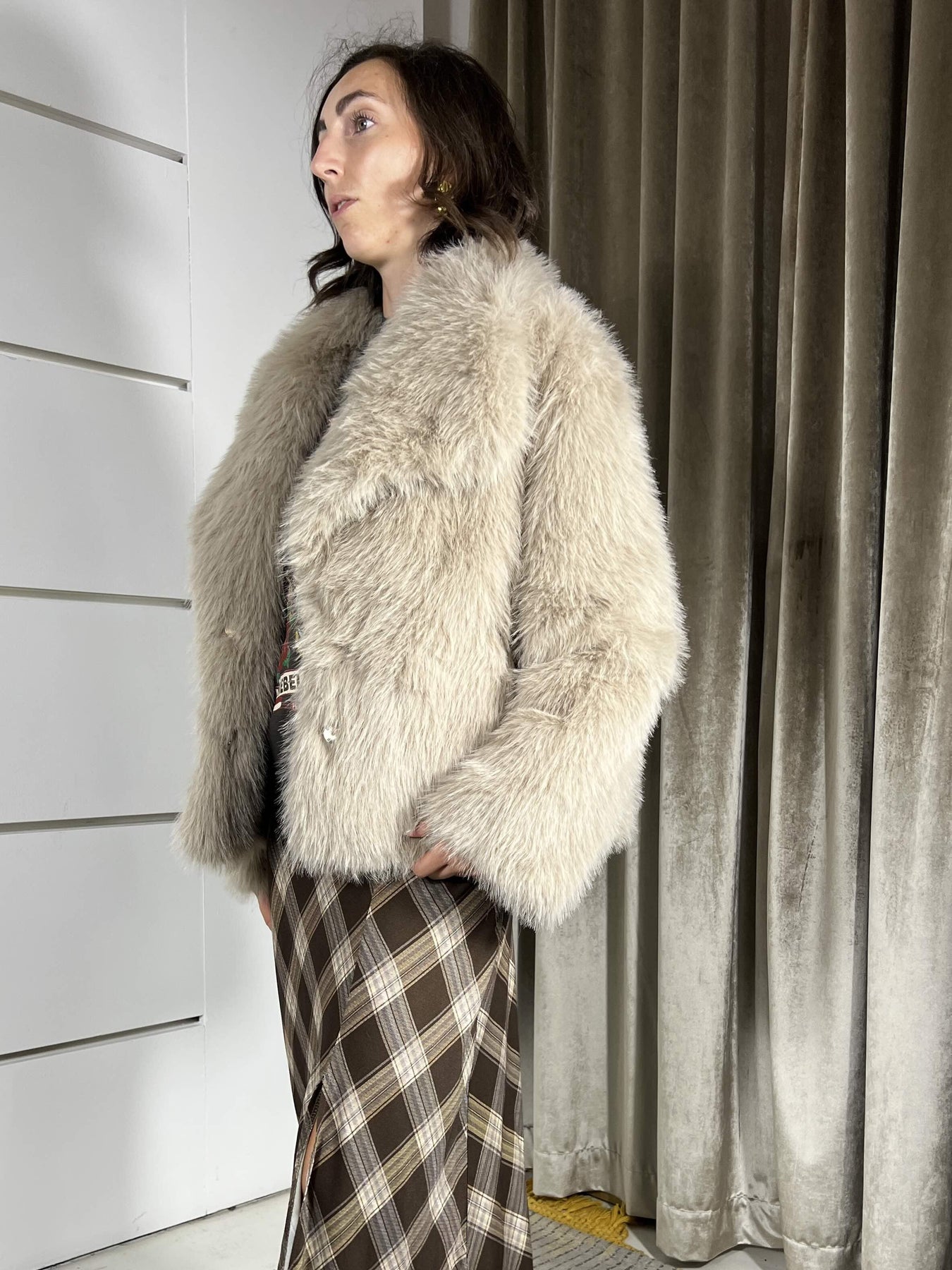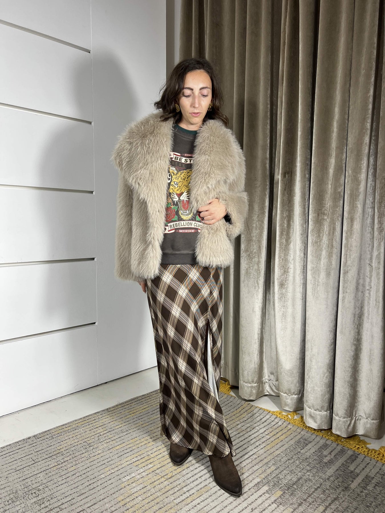 Ecopelliccia Susy Mix tortora, con gancino per chiuderla. La modella indossa la s ed è alta 172cm. Composizione 100%pl