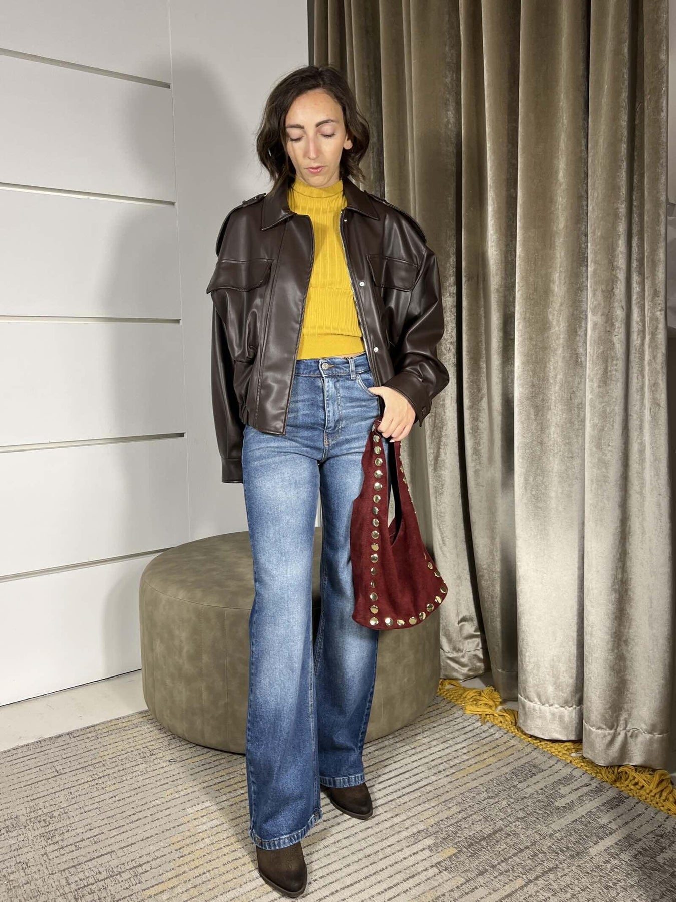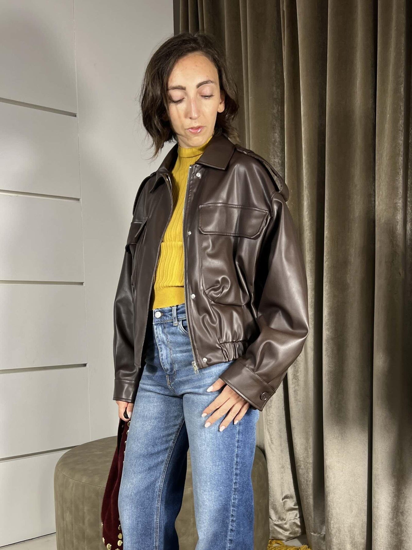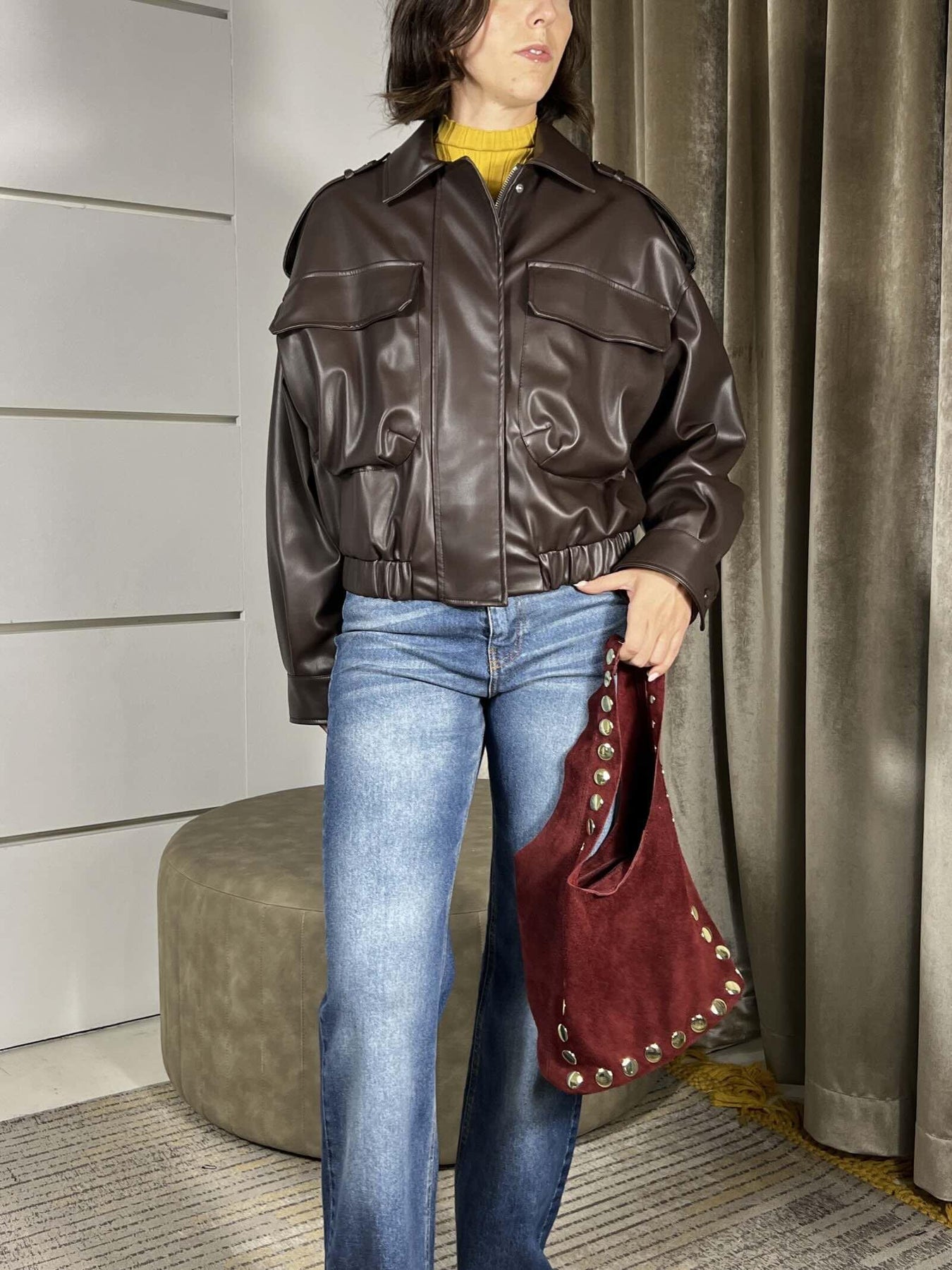 Bomber Vicolo moro in ecopelle con collo a camicia e tasche a patta, elastico nel fondo. La modella indossa la s ed è alta 172cm. Composizione 50%pl 50%pu 62%ac 38%vi