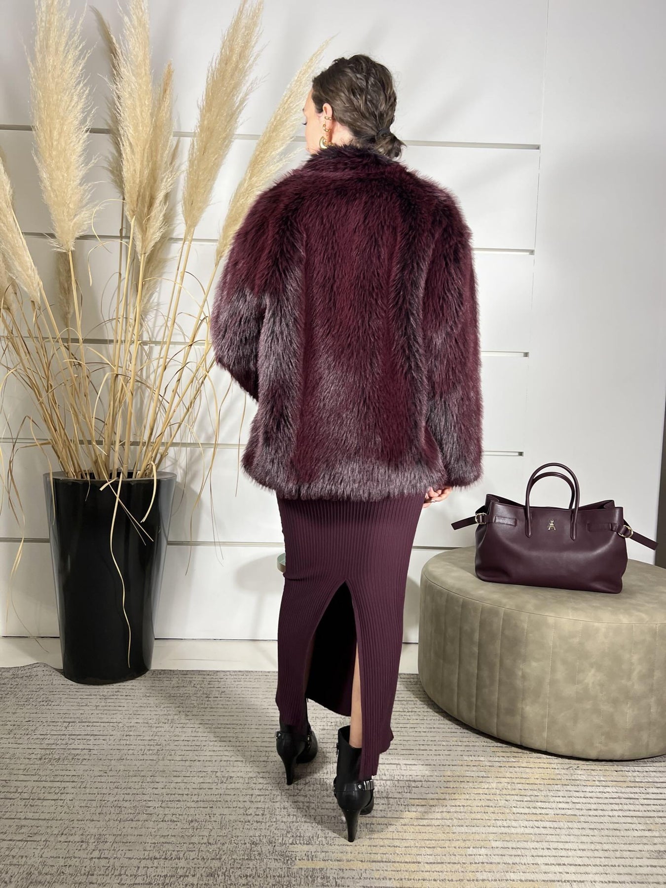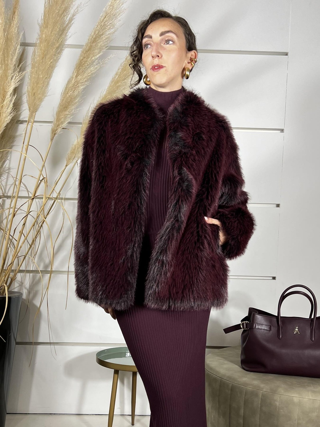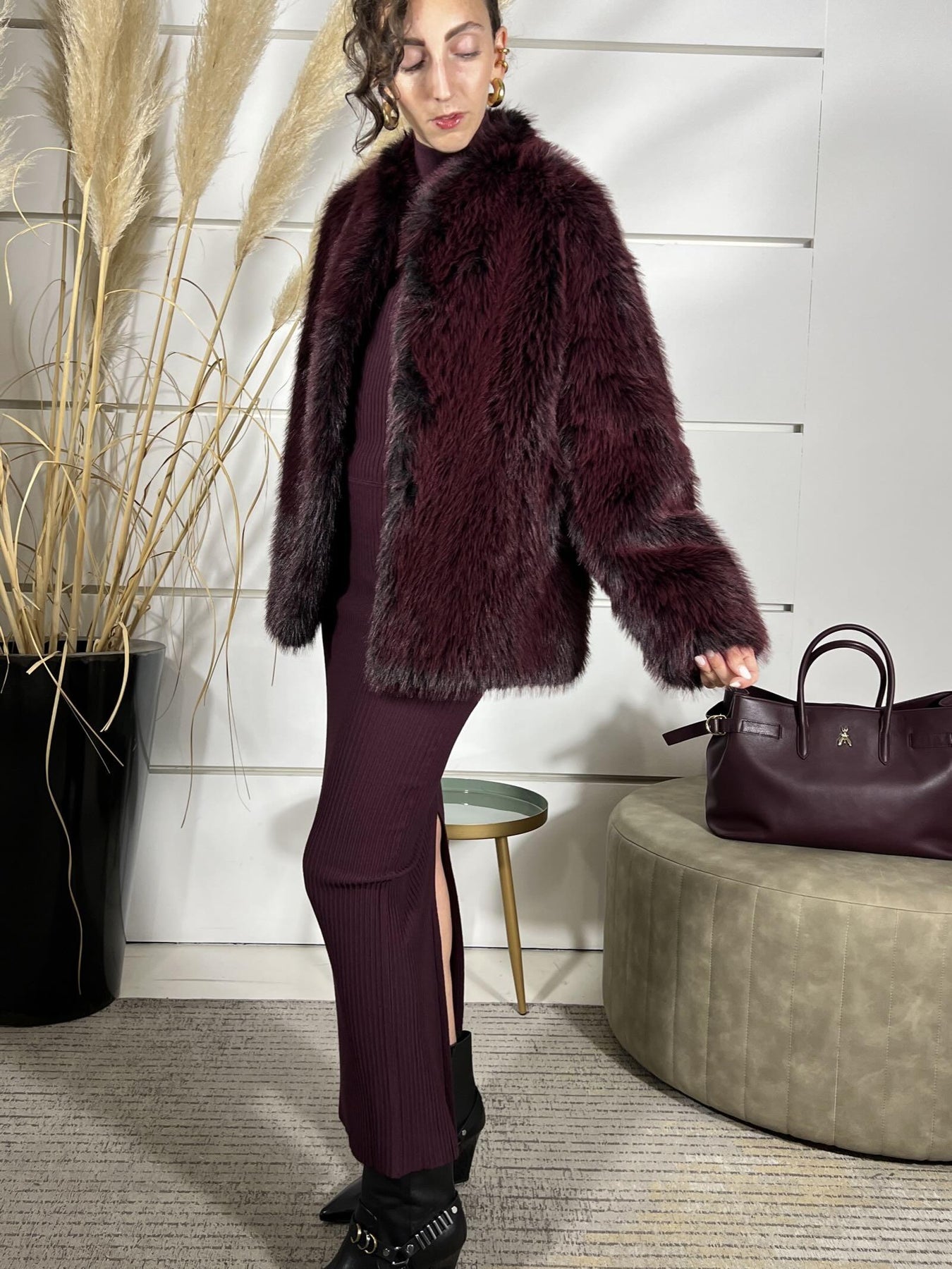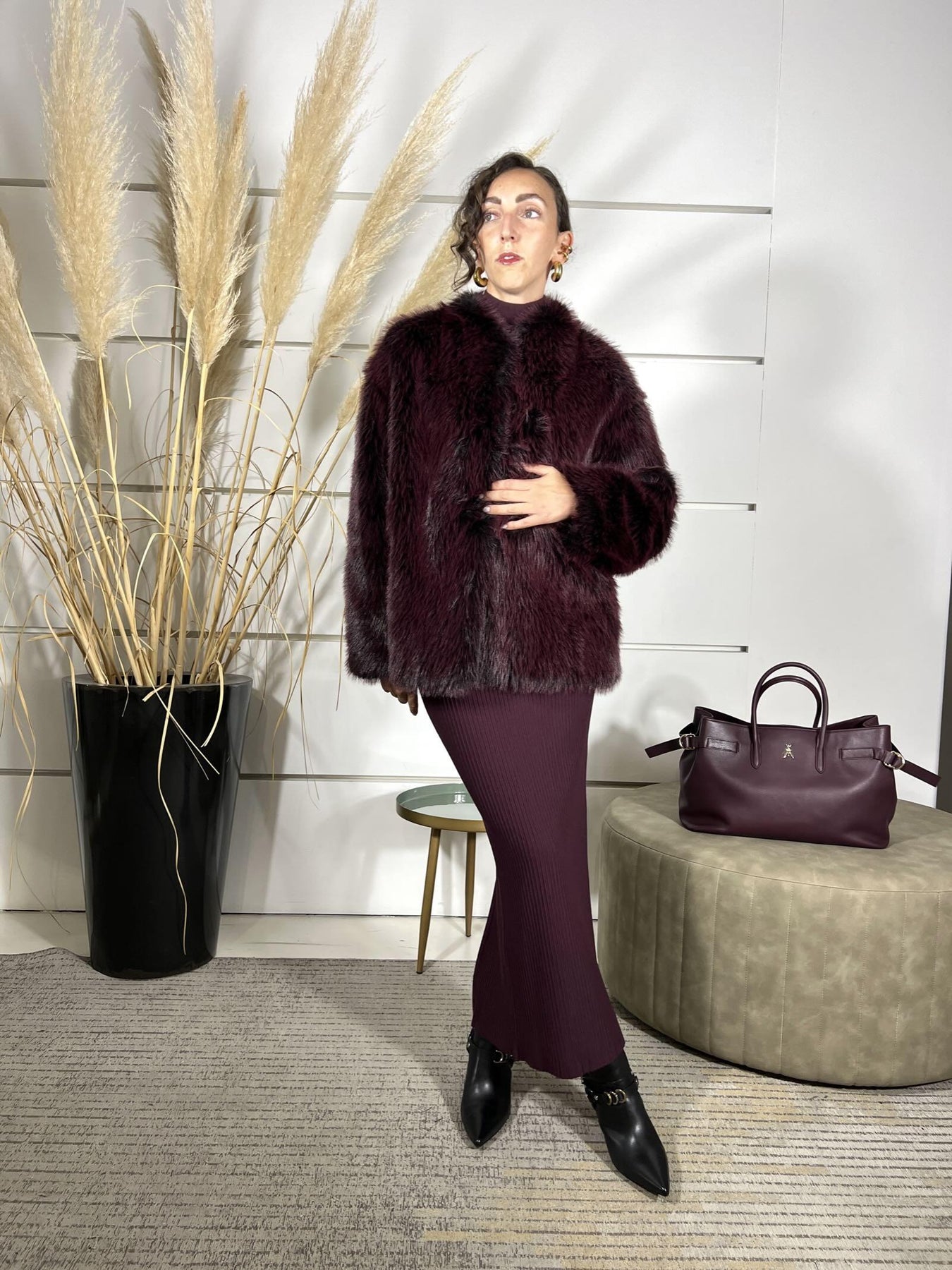 Eco pelliccia Patrizia Pepe purple red, tessuto effetto iridescente, scollo tondo. La modella è alta 172cm e indossa la 40. Composizione tessuto e fodera 100% poliestere inserto 100% poliuretano