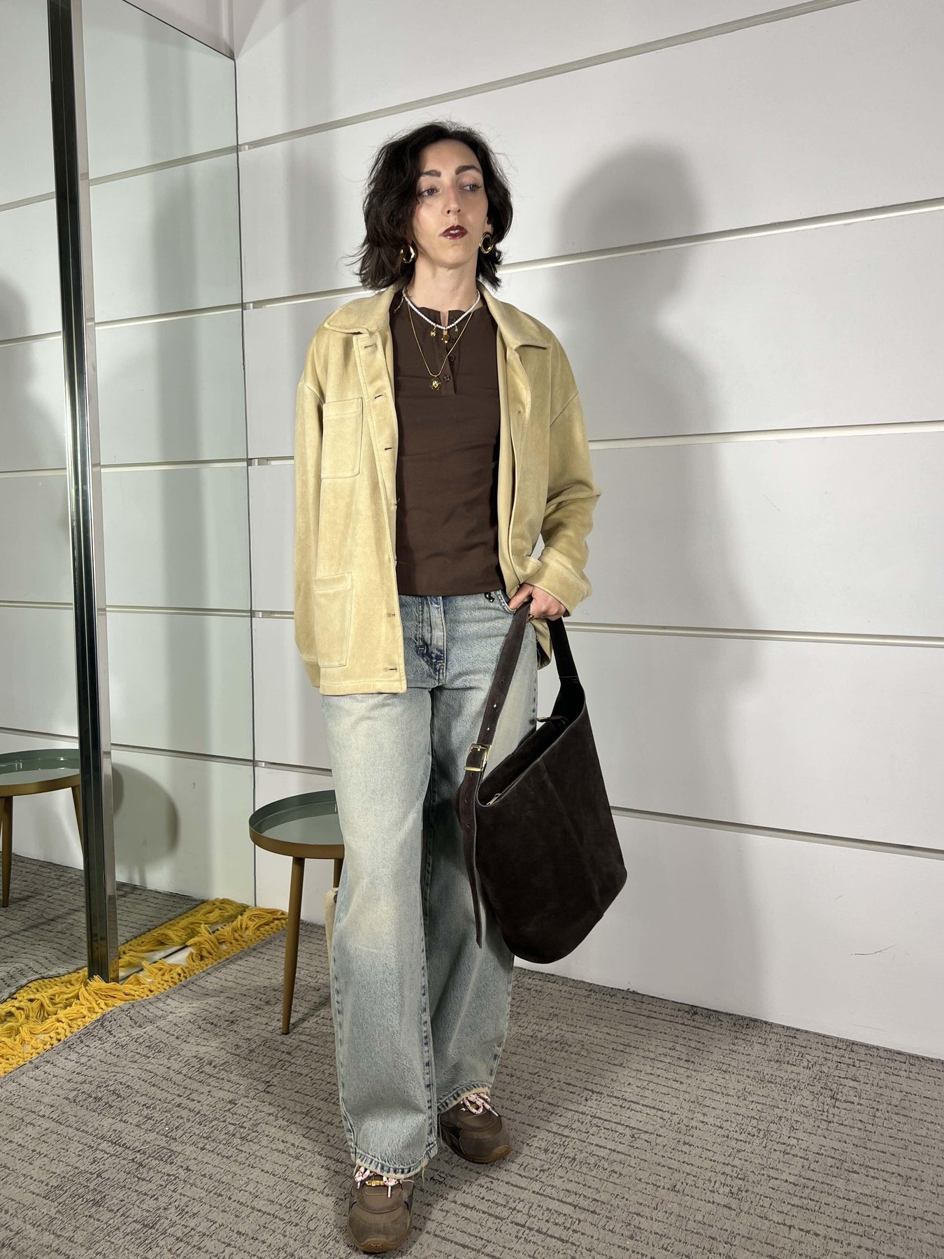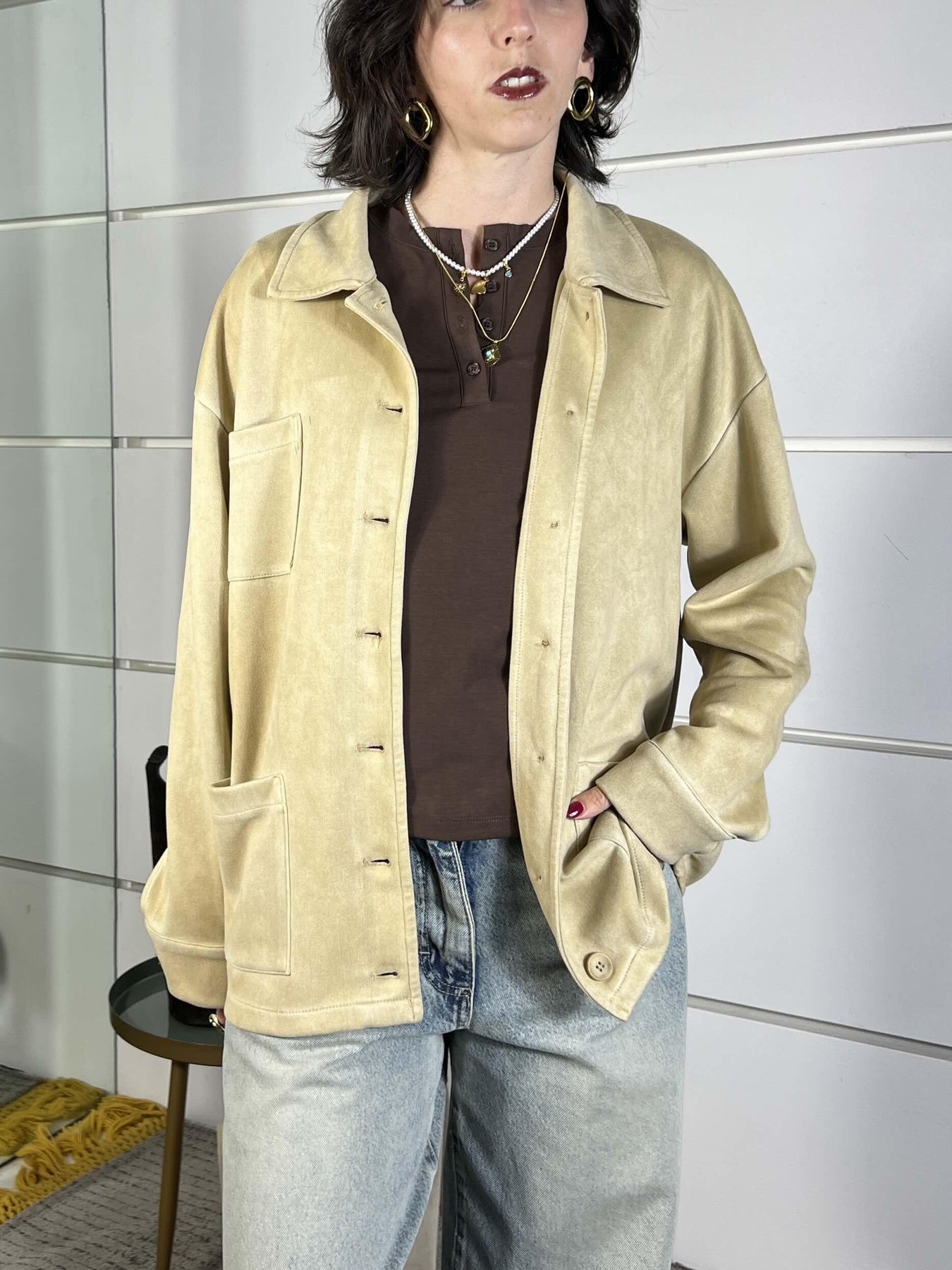Giacca camicia HaveOne cammello scamosciata con collo a camicia, la modella indossa la taglia s ed è alta 170cm, Composizione 96%pl 4%ea